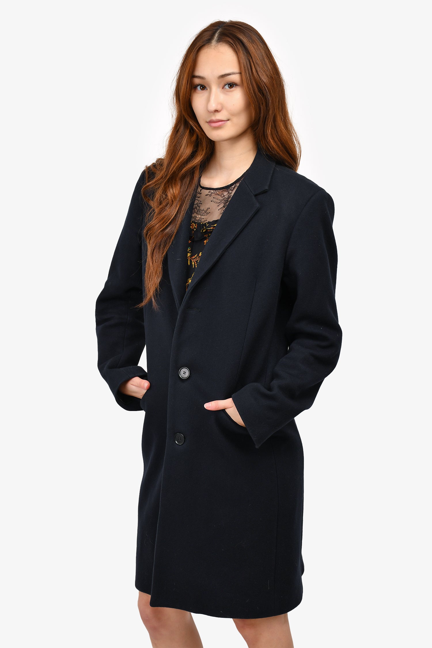 Refresh availabilitySandro Blue Wool Blend Single Breast Button Down Coat. Front button closures. Tonal stitching.