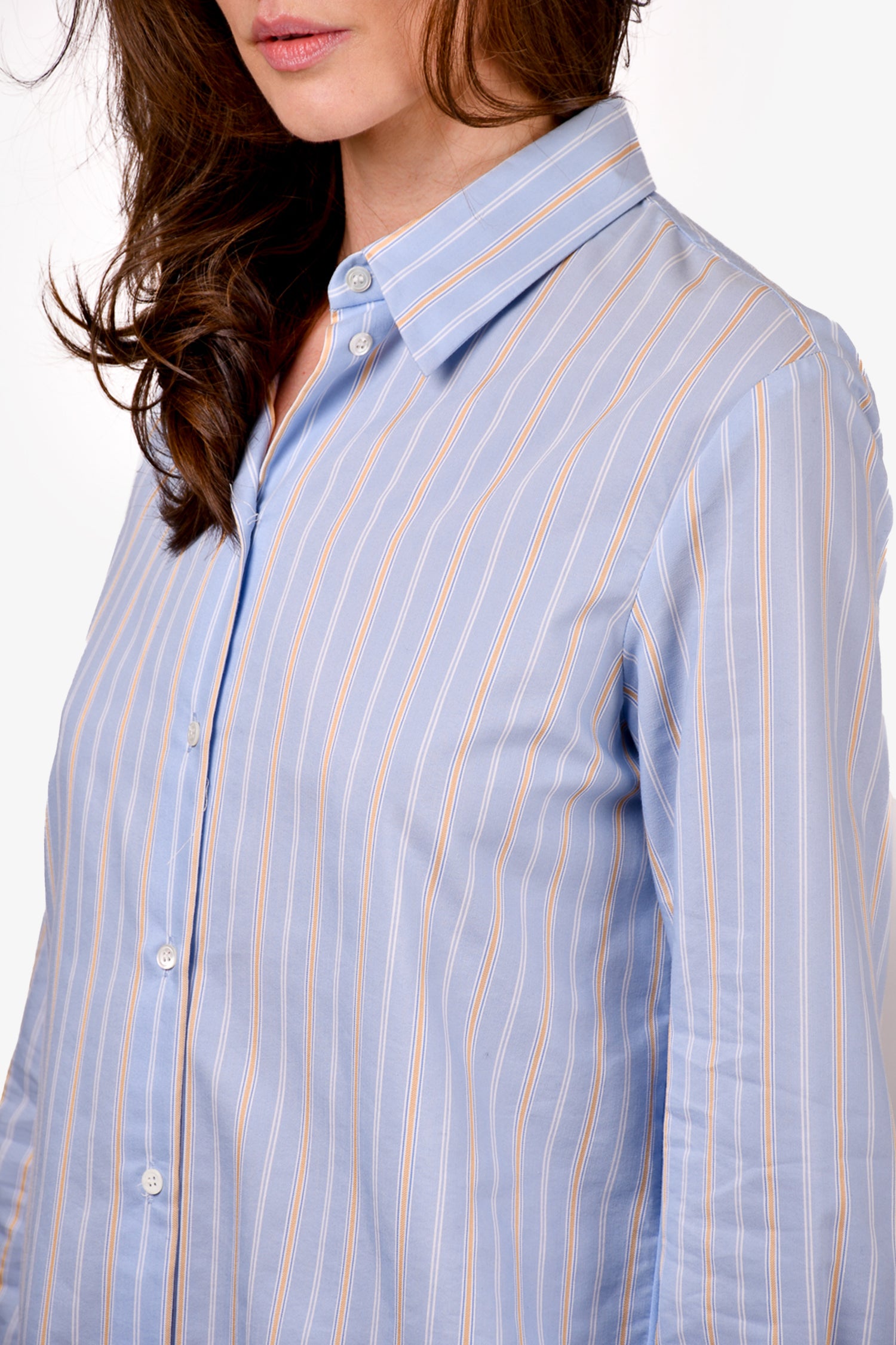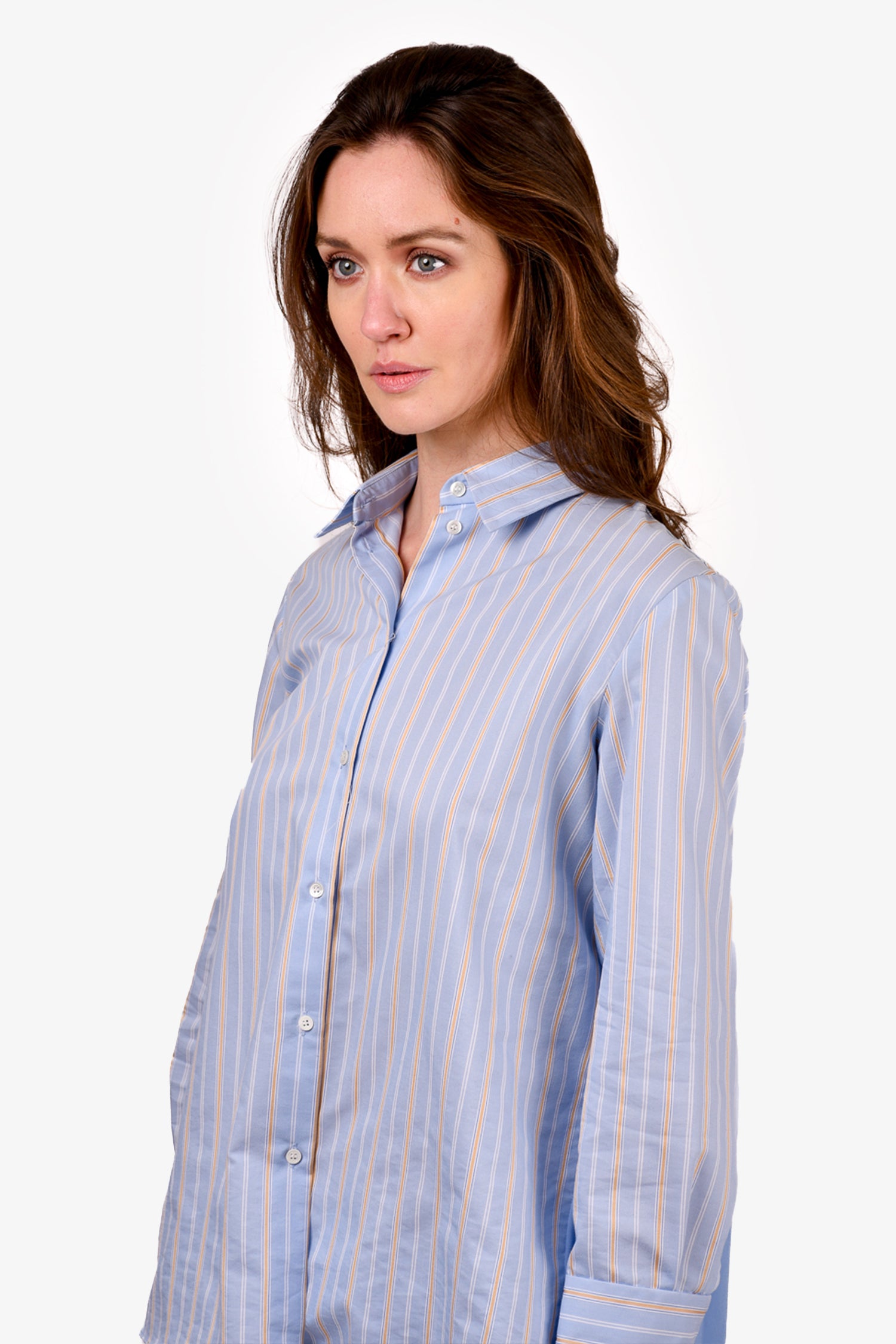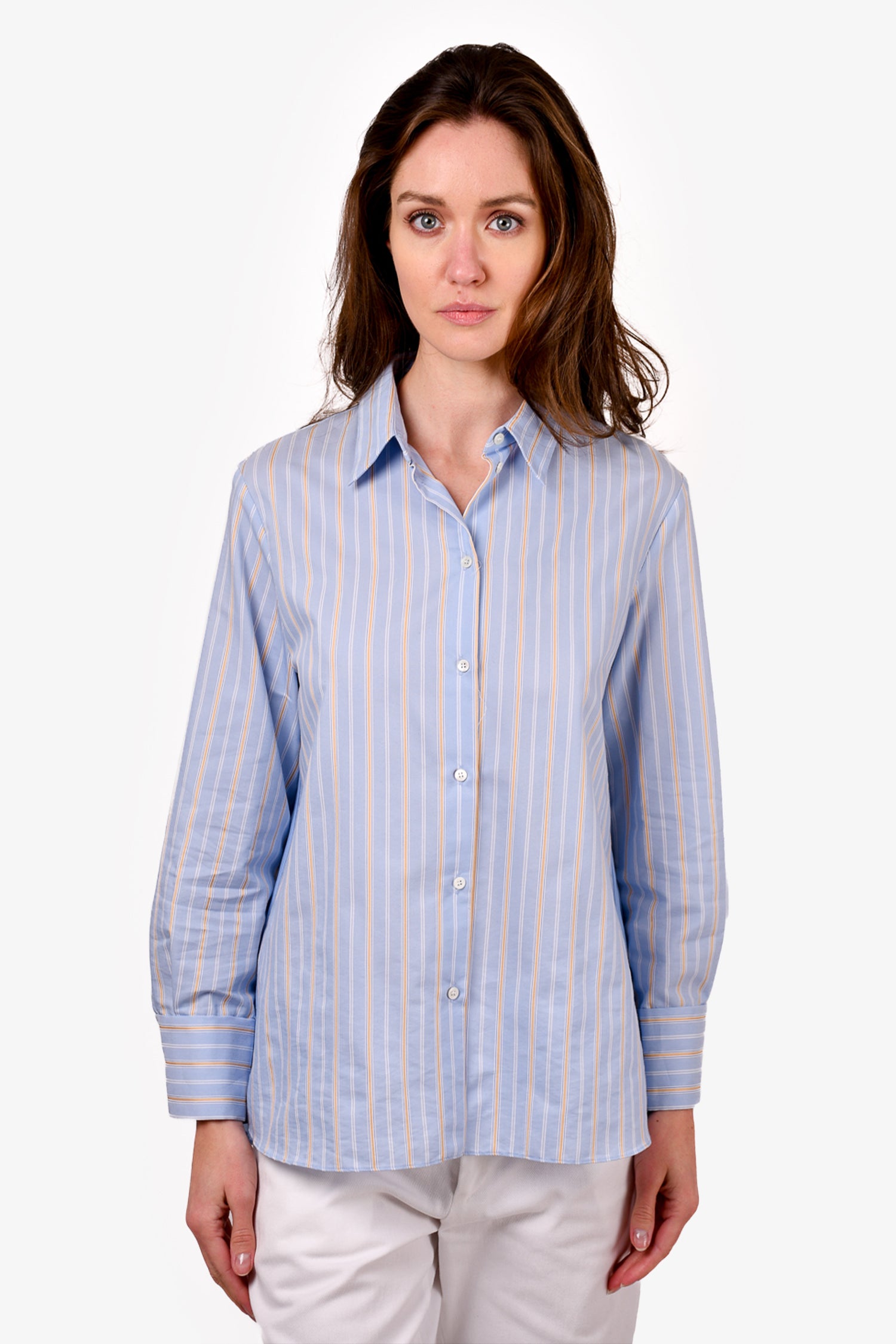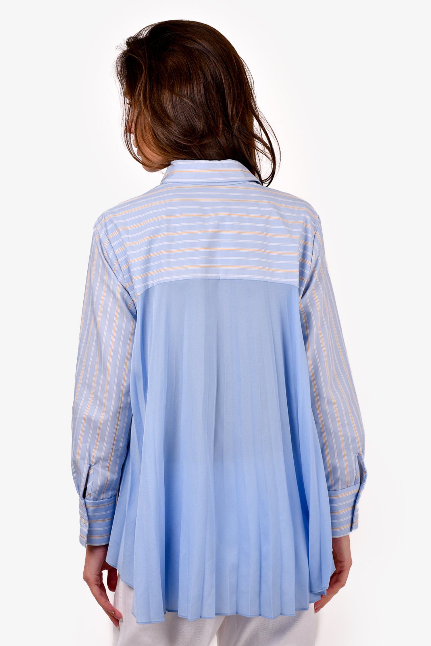 Refresh availabilitySandro Blue/Yellow Striped Shirt with Pleated Back. Front button-up closure. Button closure on the cuffs. Tonal stitching.