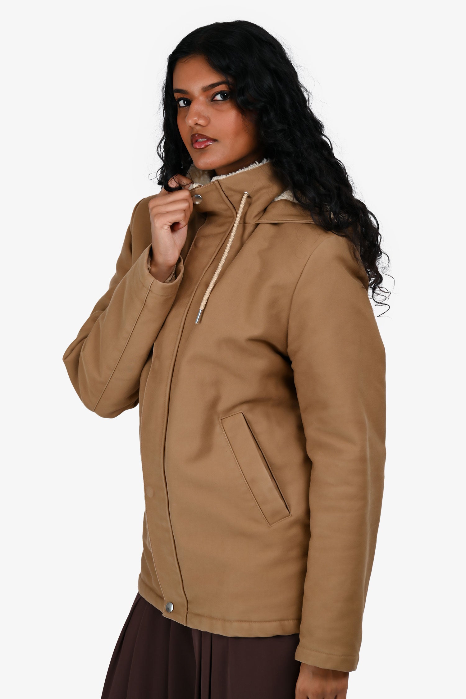Refresh availabilitySandro Brown Hooded Fleece Lined Short Parka. Front zip closure with snap placket. Structured shoulders. Drawstring collar. 2 exterior slip pockets; 2 interior slip pockets. Fully lined. Silver-tone hardware. Tonal stitching.