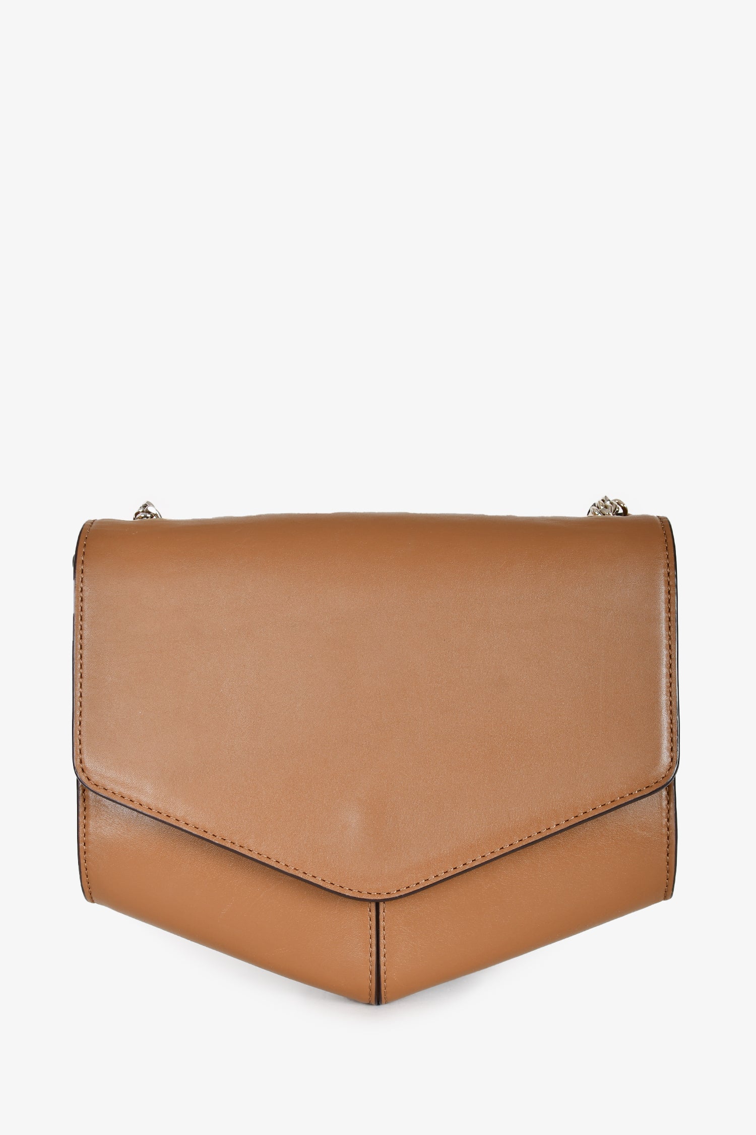Refresh availabilitySandro Brown Leather Crossbody Bag. Front fold-over flap with magnetic button closure. Mint green suede interior lining. Single interior wall zip pocket. Outer rear slip pocket. Adjustable chain strap. Silver-tone hardware. Tonal stitching.