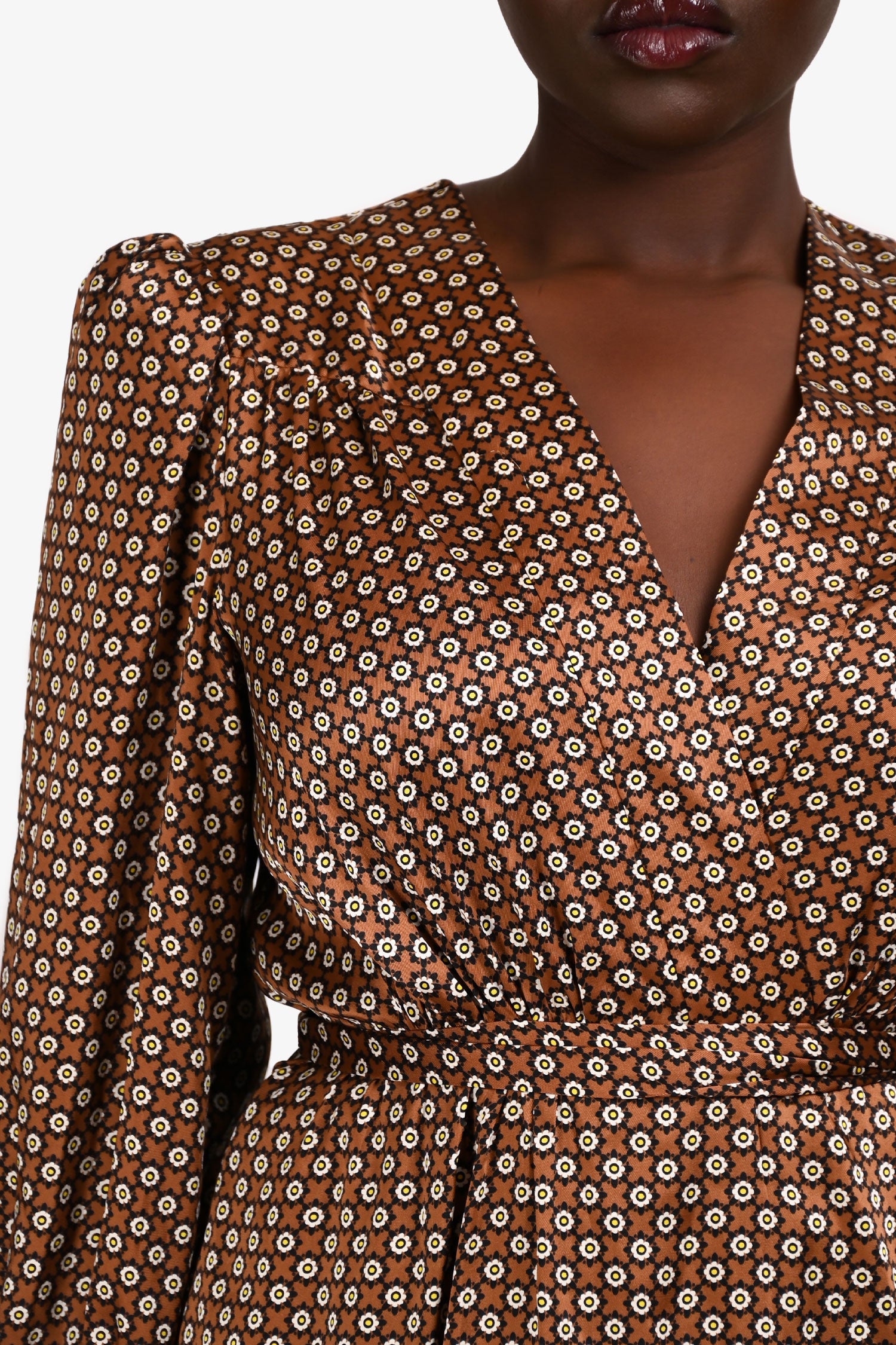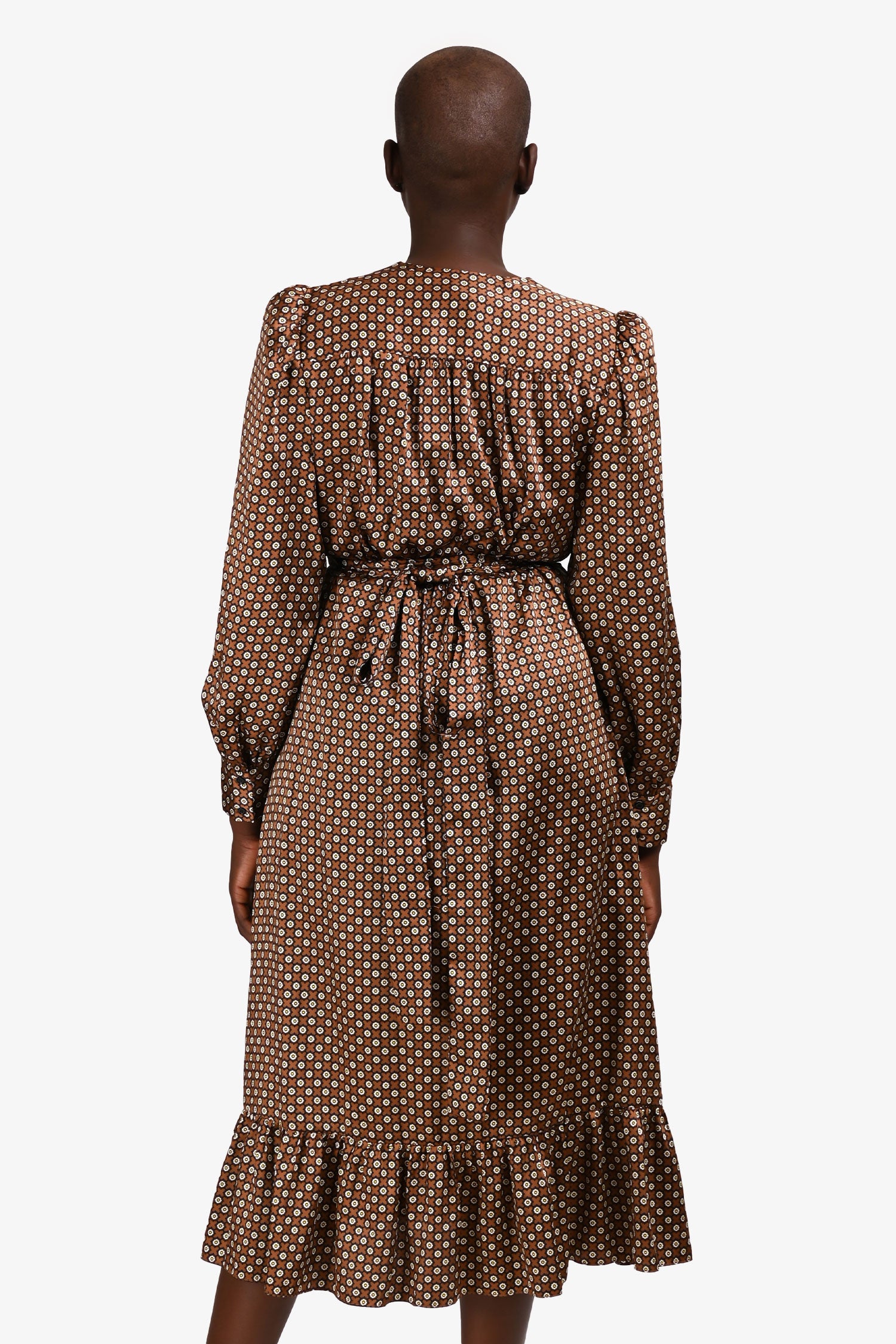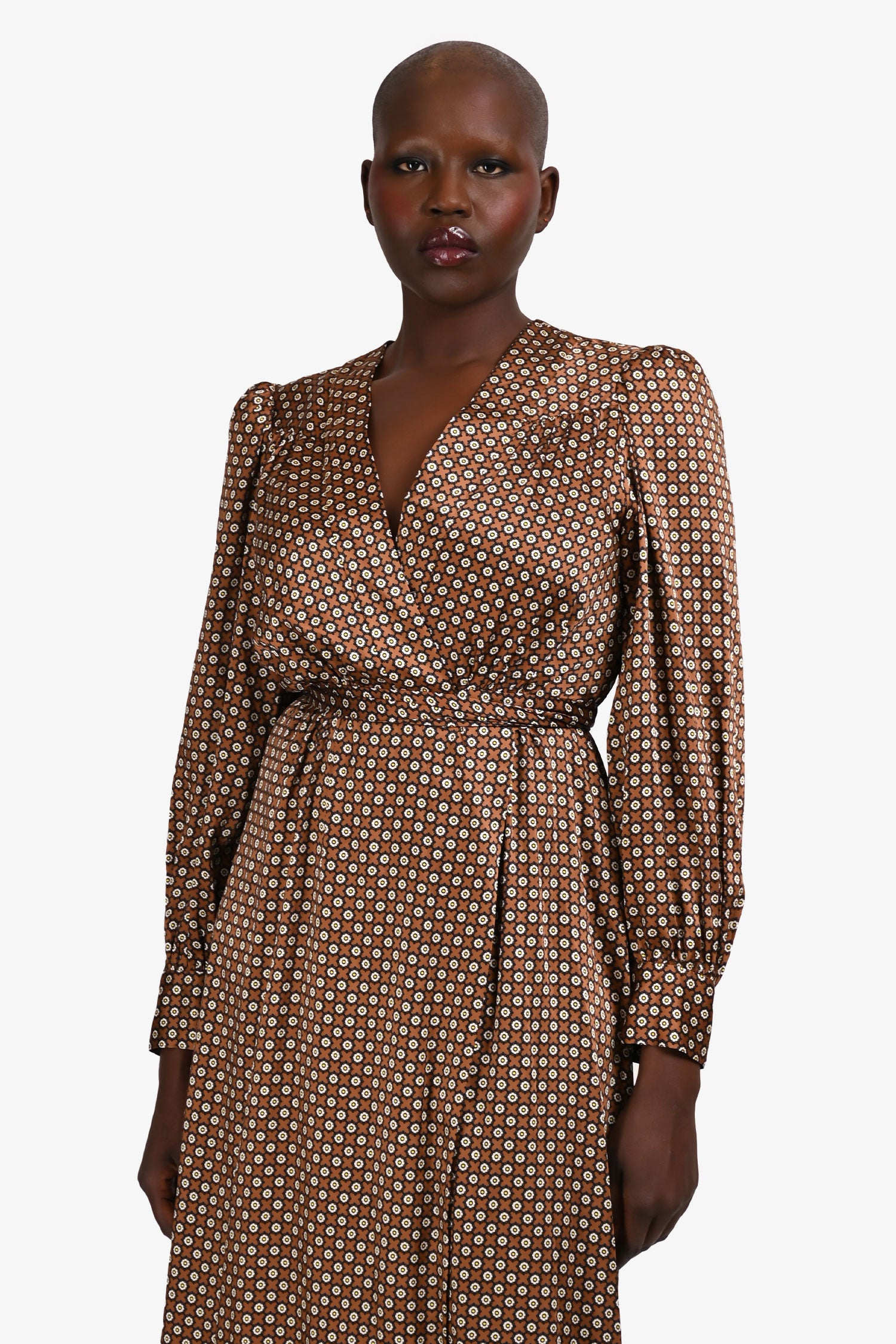 Refresh availabilitySandro Brown Patterned Wrap Maxi Dress. Adjustable tie detailing. Button detailing on the cuffs. Tonal stitching.