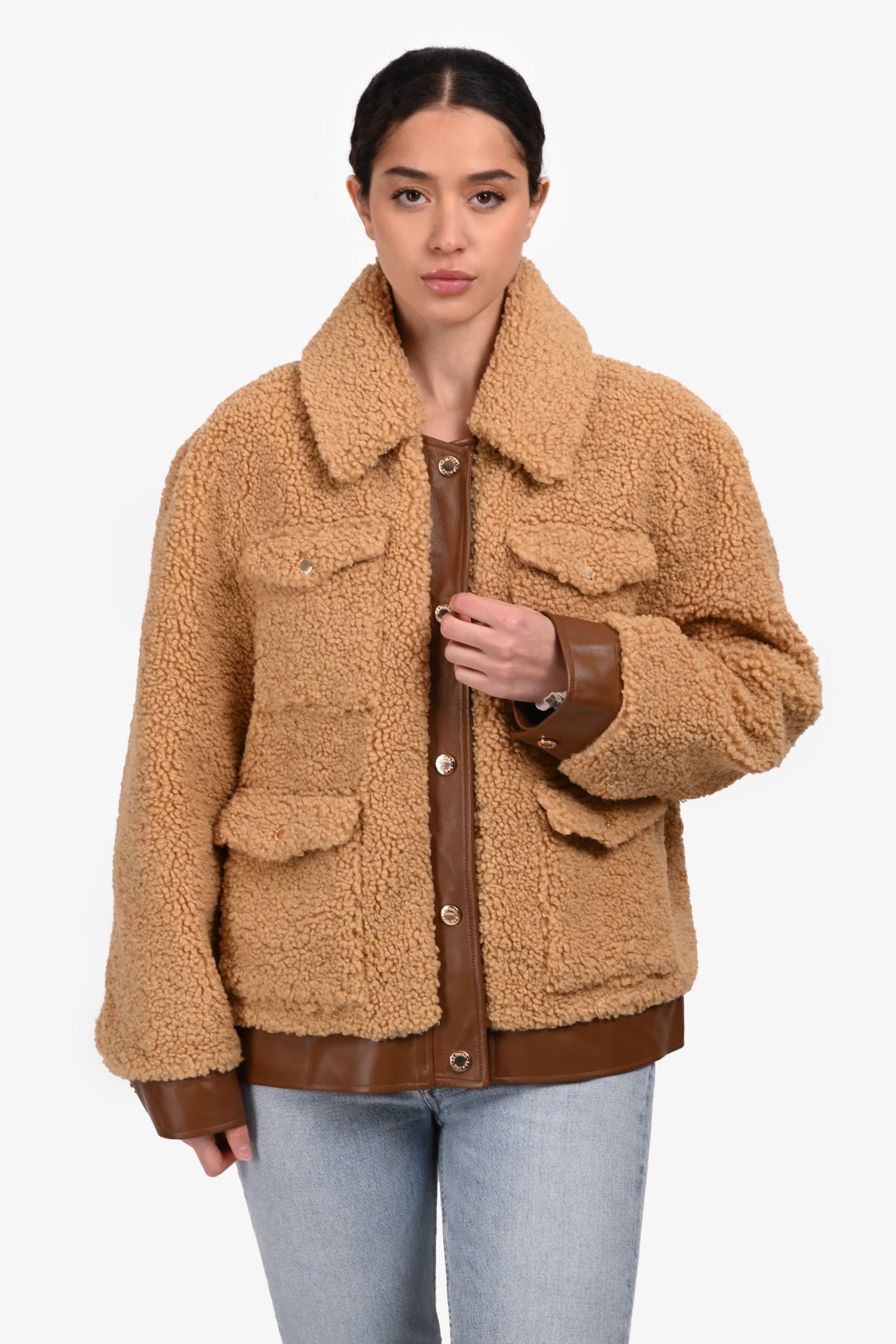 Refresh availabilitySandro Brown Teddy Jacket with Leather Trim. Collared neckline. Front snap button closure. Leather trim detailing. Cuffs with snap button closures. 4 exterior flap pockets with snap closures. Fully lined interior. Gold-tone hardware. Tonal stitching.