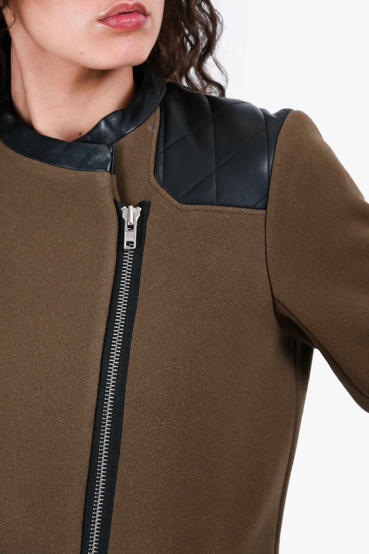 Sandro Brown Wool Black Leather Patch Midi Coat Size 36