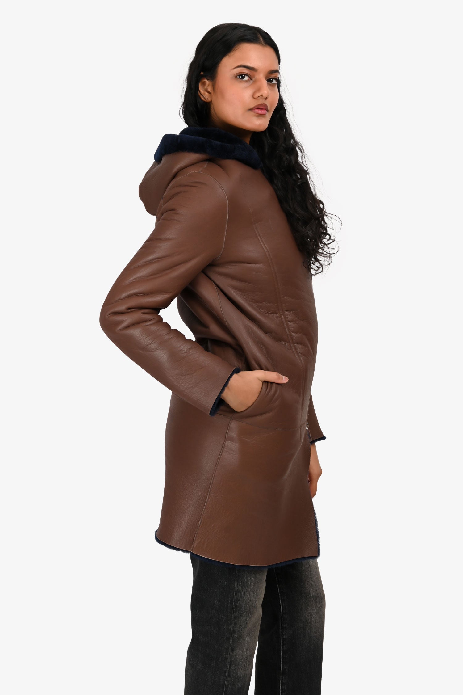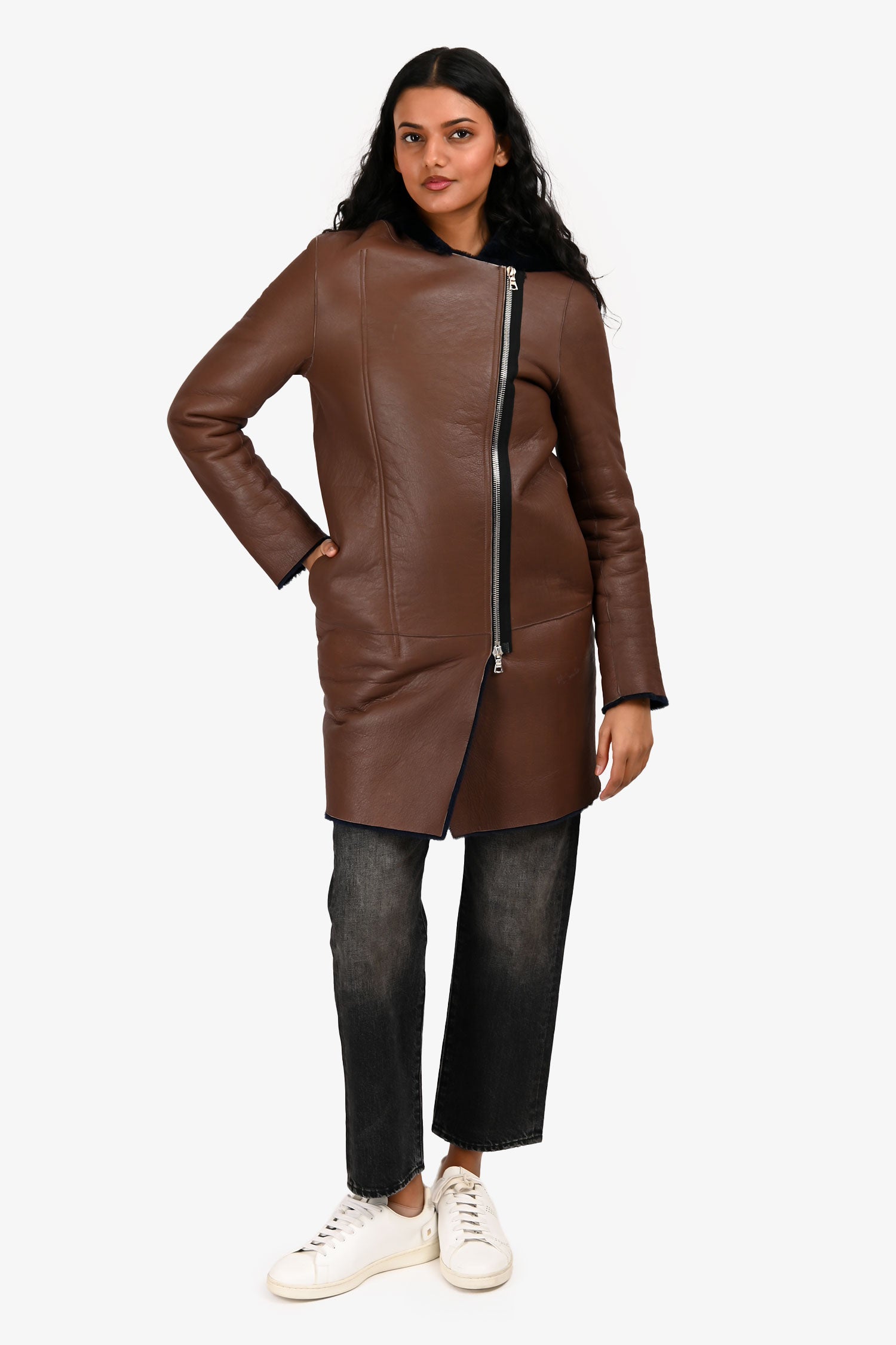 Refresh availabilitySandro Brown/Blue Leather 'Bala' Reversible Shearling Jacket. Front two-way zip closures. 2 front slip pockets. Silver-tone hardware. Tonal stitching.
