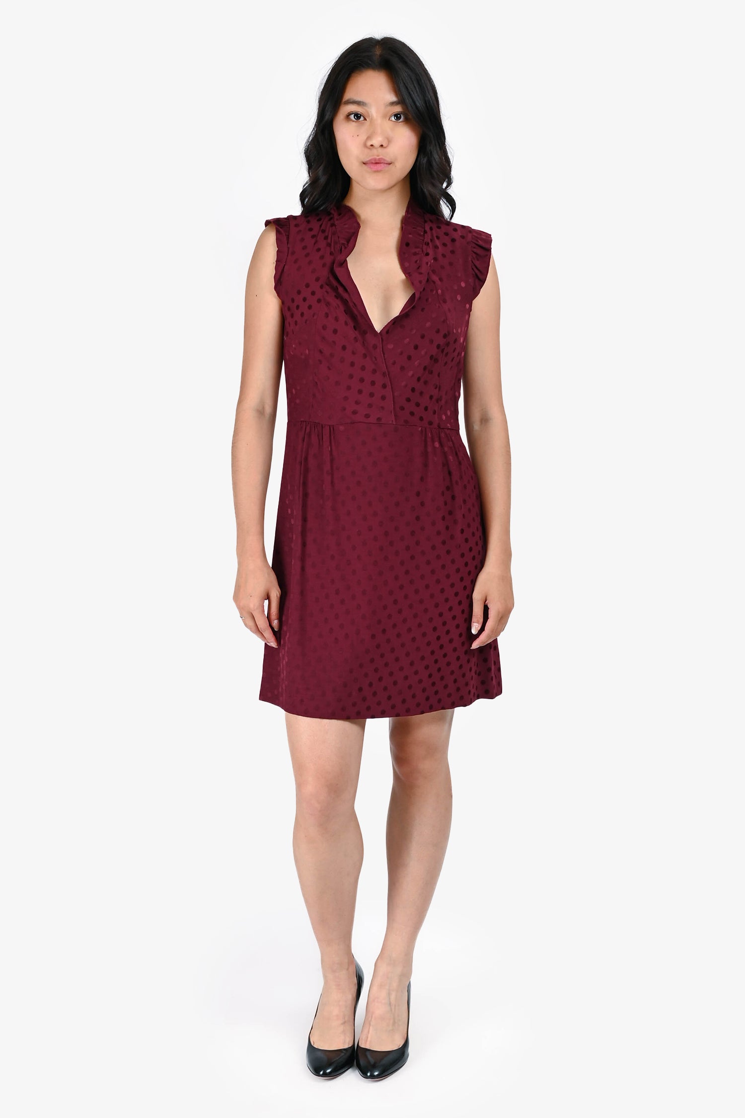 Refresh availabilitySandro Burgundy Polka Dot Mini Dress. V-neckline. Concealed side zip closure. Tonal stitching.