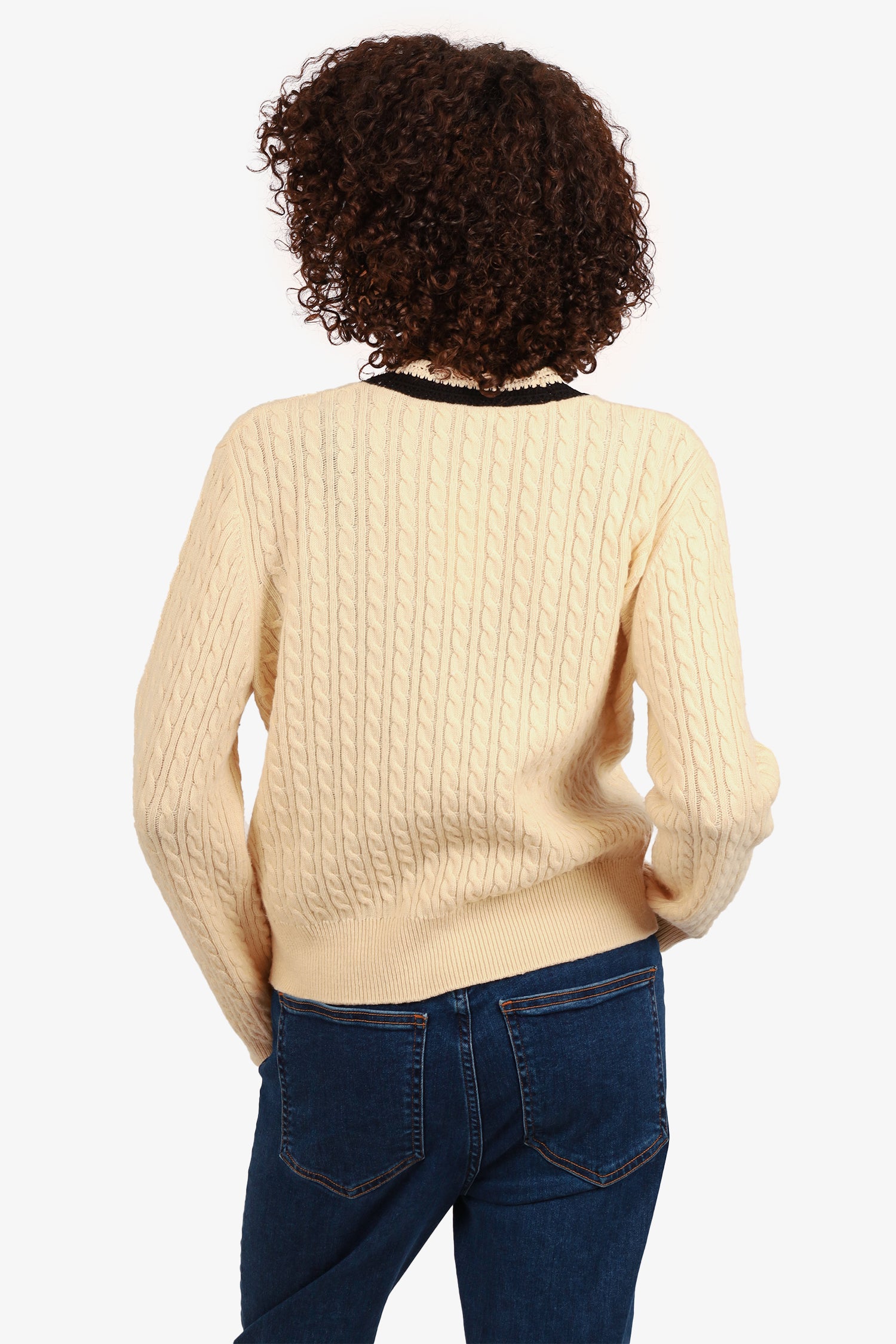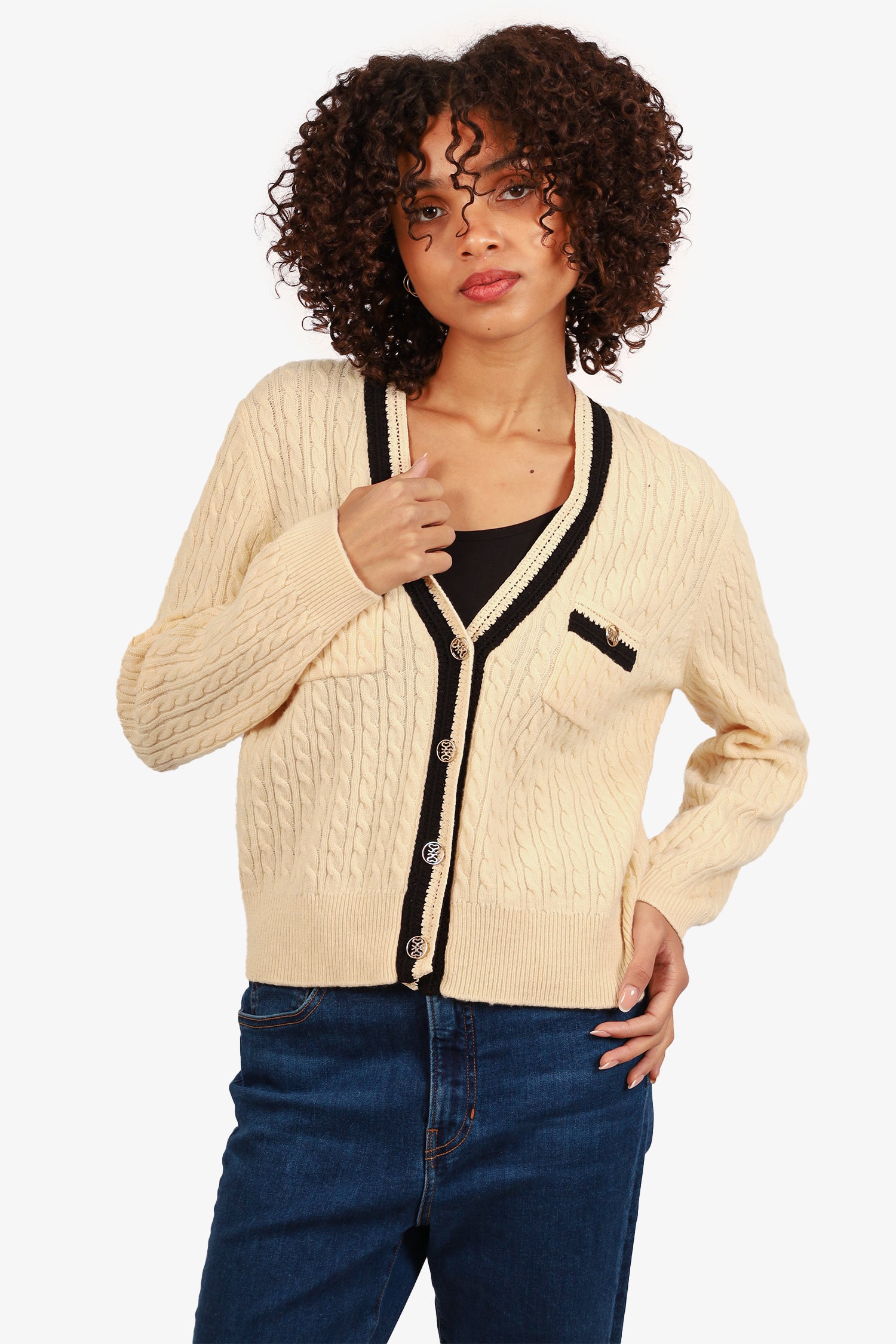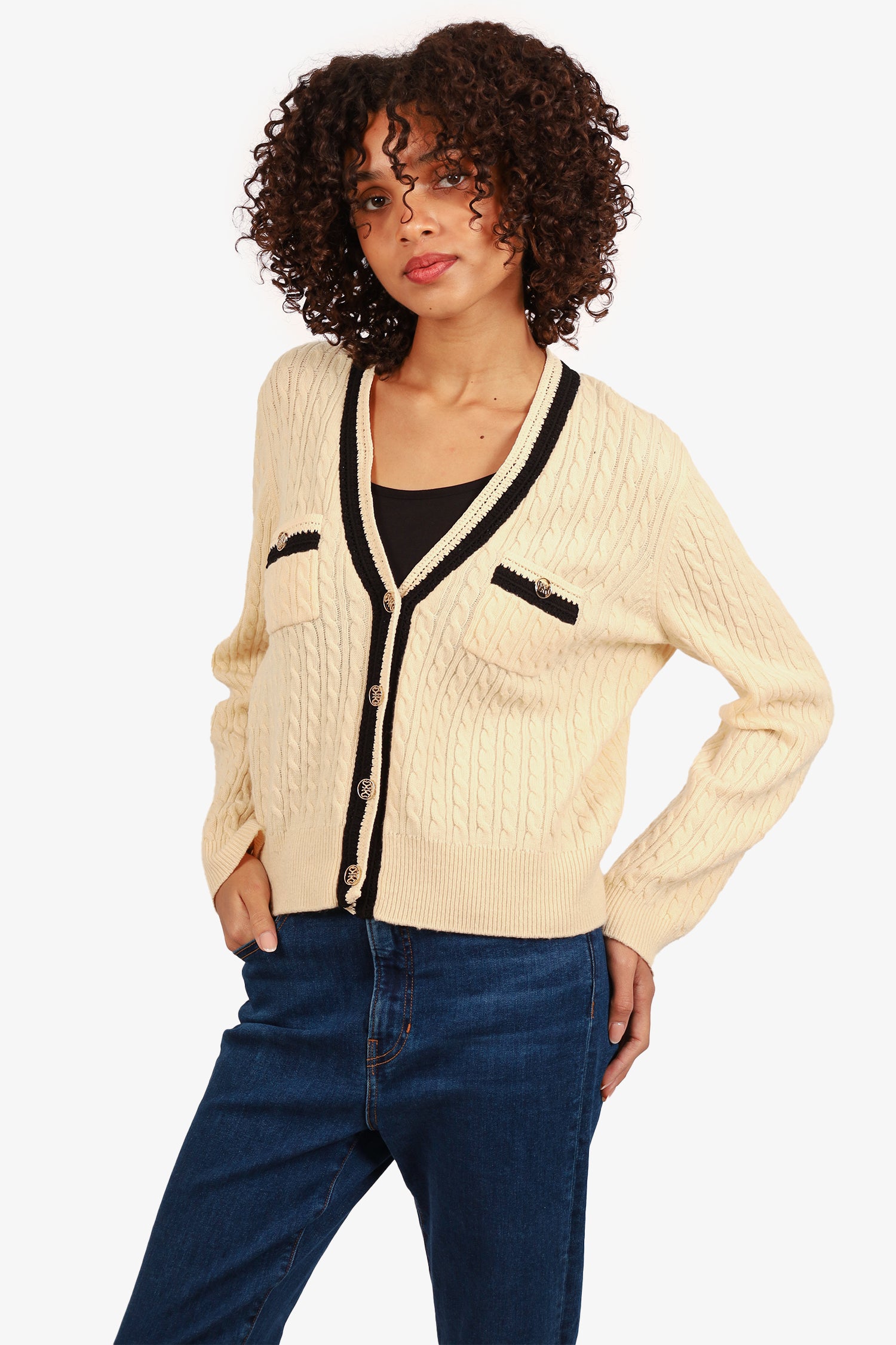 Refresh availabilitySandro Cream/Black Knit Cardigan. Front-button up closure. Ribbed sleeve cuffs and waistband. 2 front exterior pocket with button closure. Gold-tone hardware. Tonal stitching.