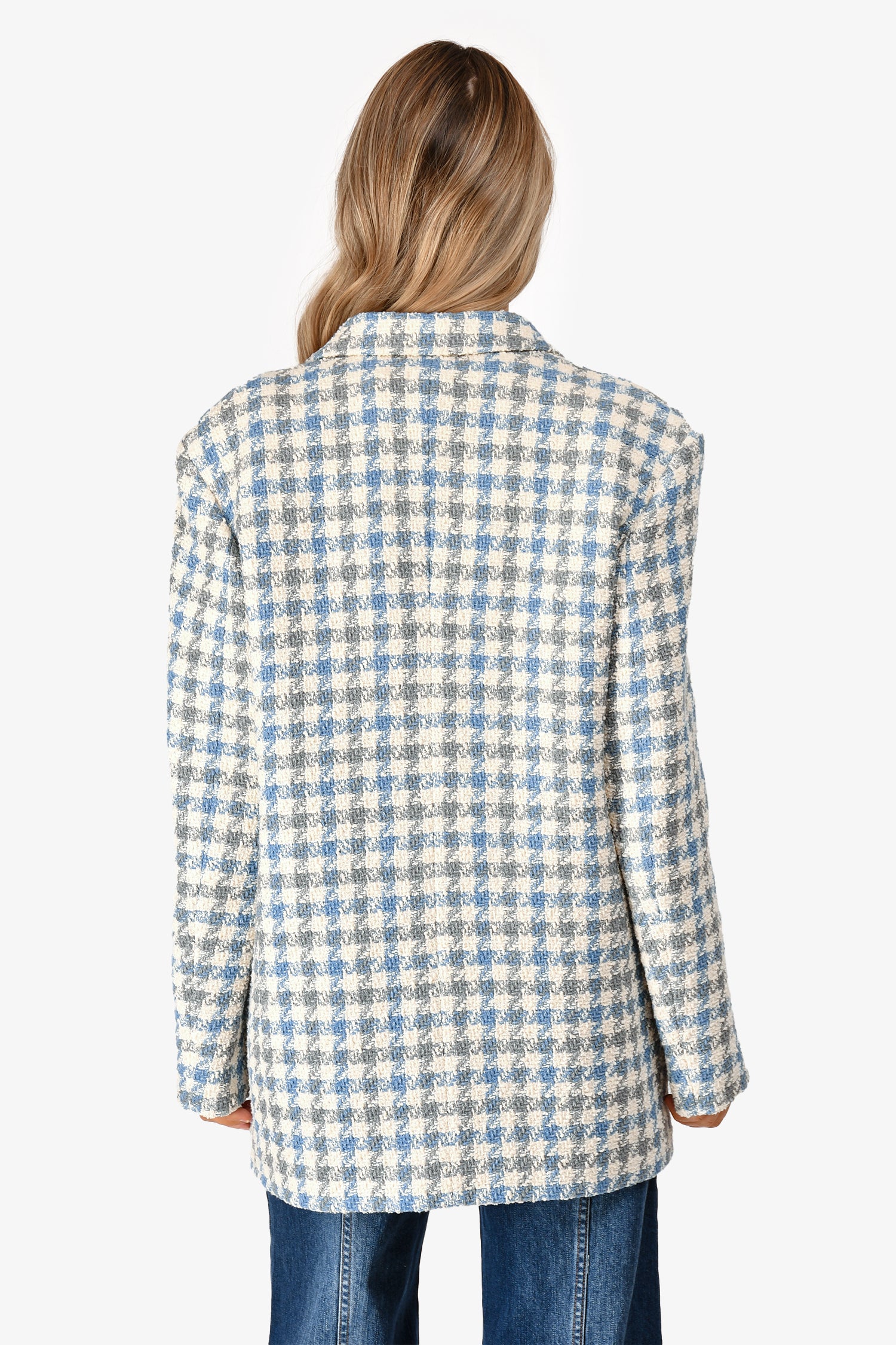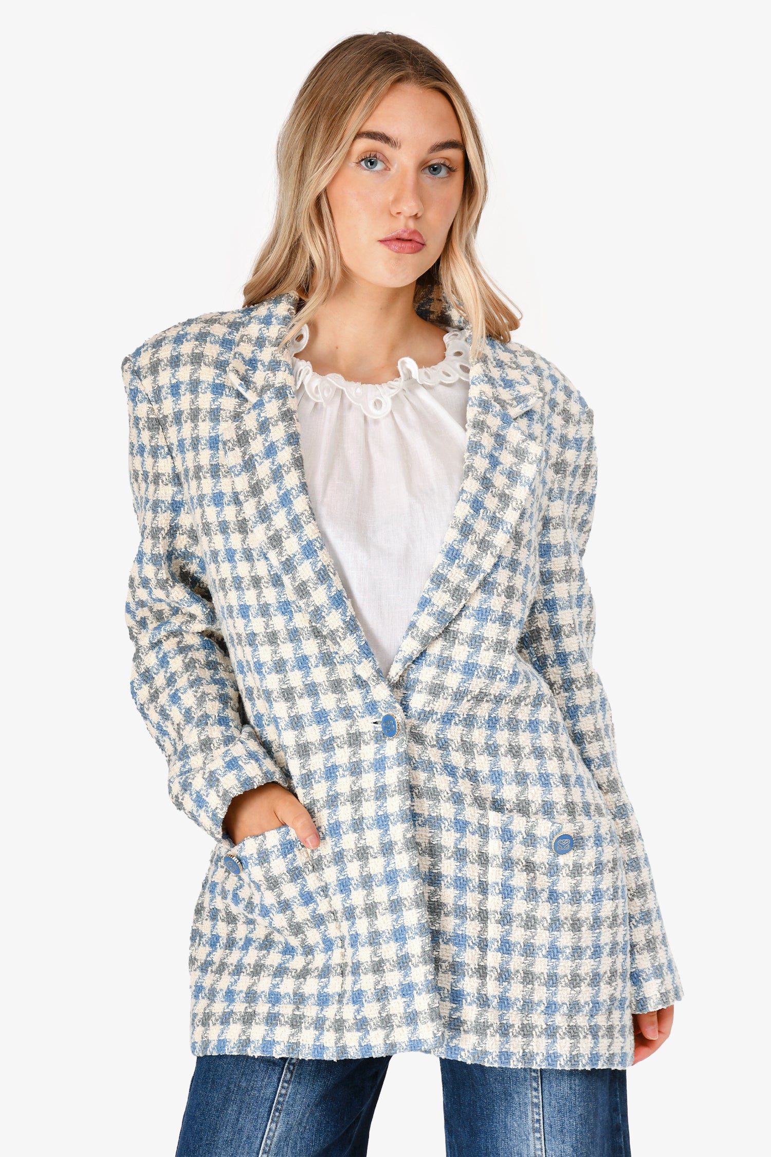 Refresh availabilitySandro Cream/Blue Tweed Single Button Blazer. Single front button closure. 2 front slip pockets. Lined. Blue and gold-toned hardware. Tonal stitching.