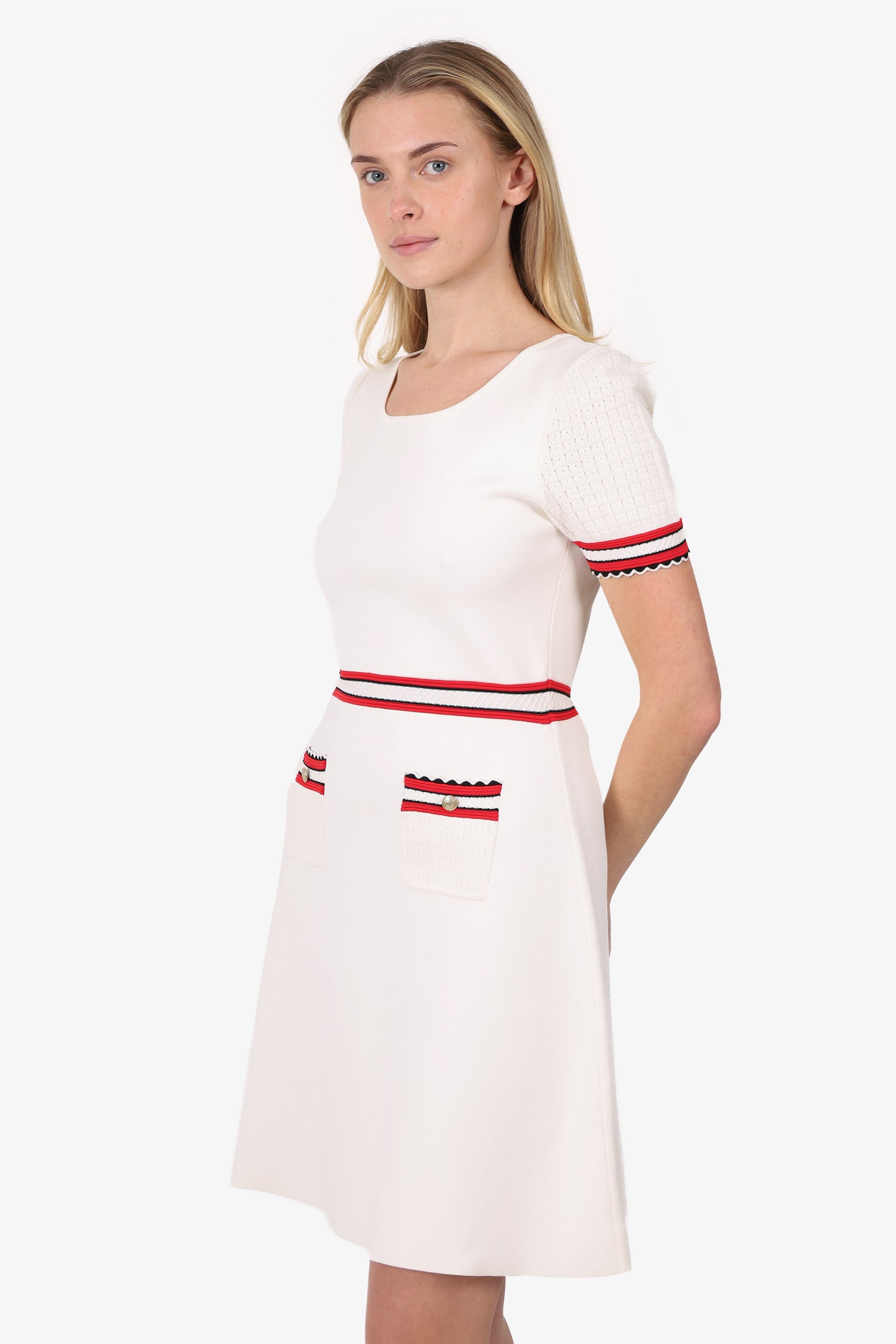 Refresh availabilitySandro Cream Knit Striped Trim Short Dress. Slip-on. Round neckline. 2 exterior front slip pockets. Gold-tone hardware. Tonal stitching.