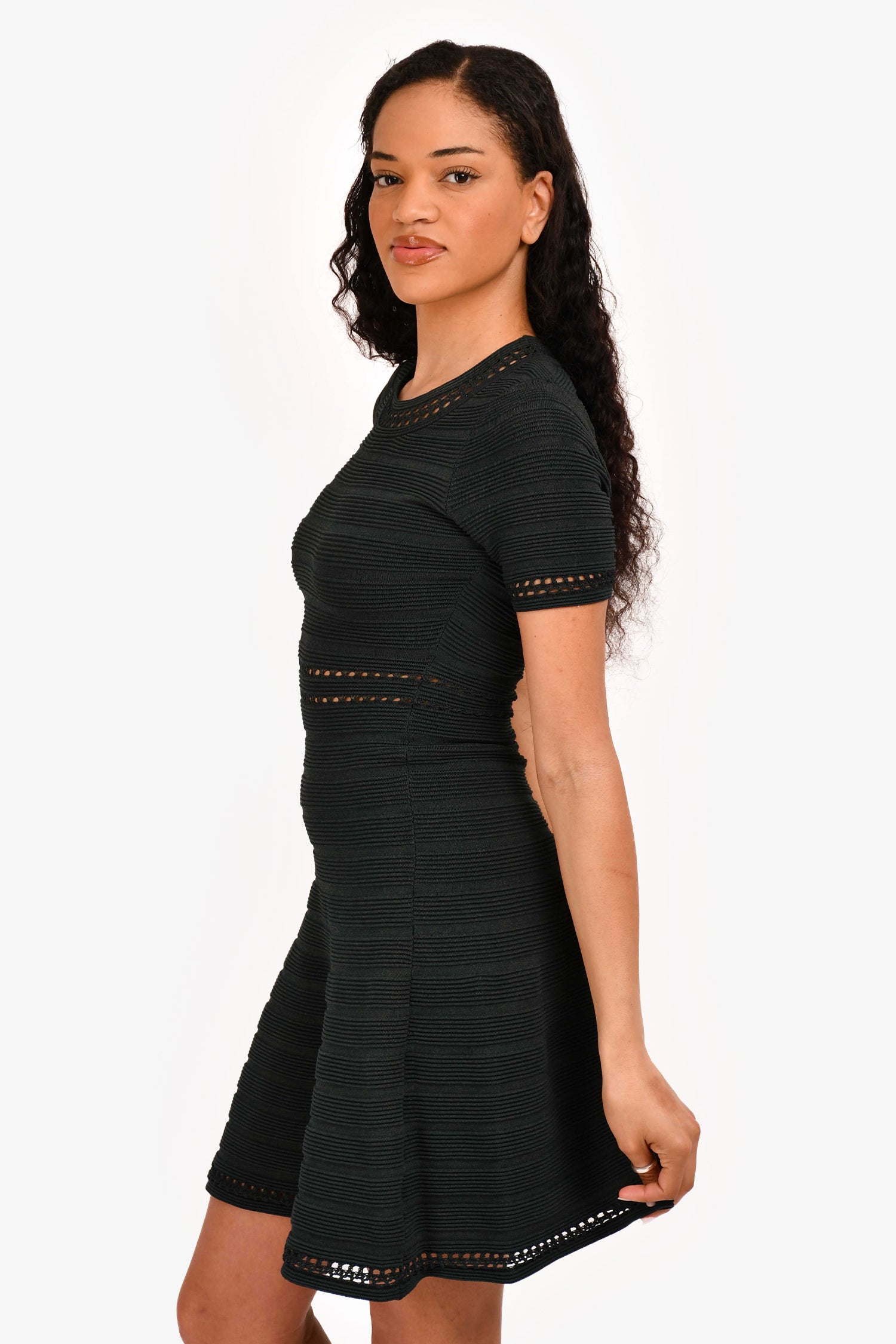 Refresh availabilitySandro Dark Green Knit Short Sleeve A-Line Dress. Crew neckline. Short sleeves. Fitted bodice with flared skirt. Ribbed knit texture. Pull-on. Tonal stitching.
