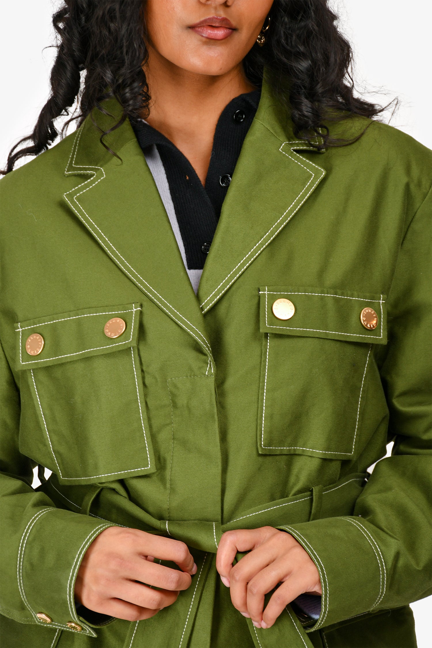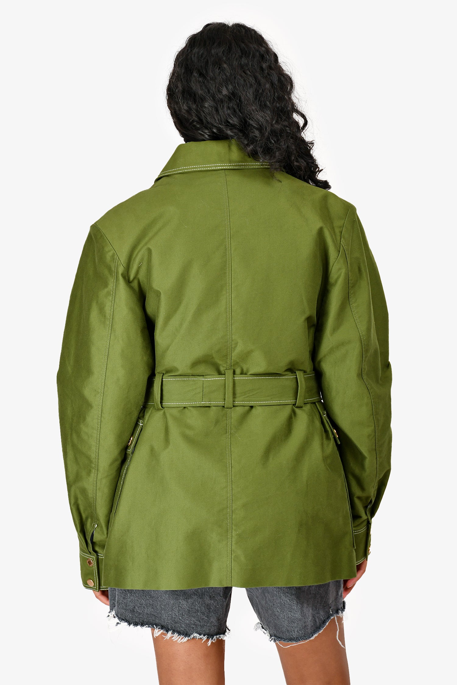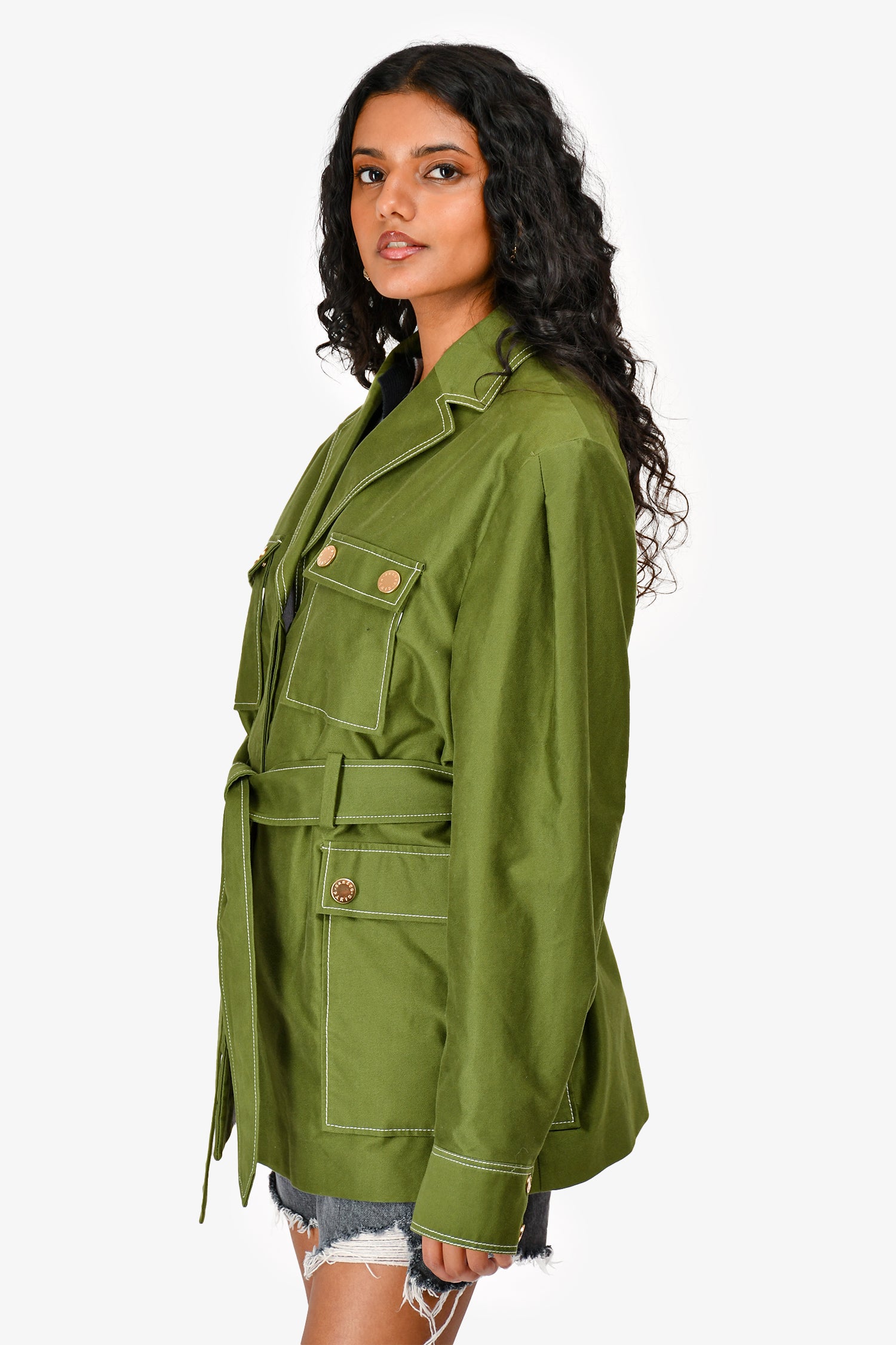 Refresh availabilitySandro Green Cotton Canvas Belted Military Jacket. Concealed front button-down closure. 4 front button closure pockets. Button closure on cuffs. White contrast stitching detail. Lined. Gold-toned hardware. Tonal stitching.
