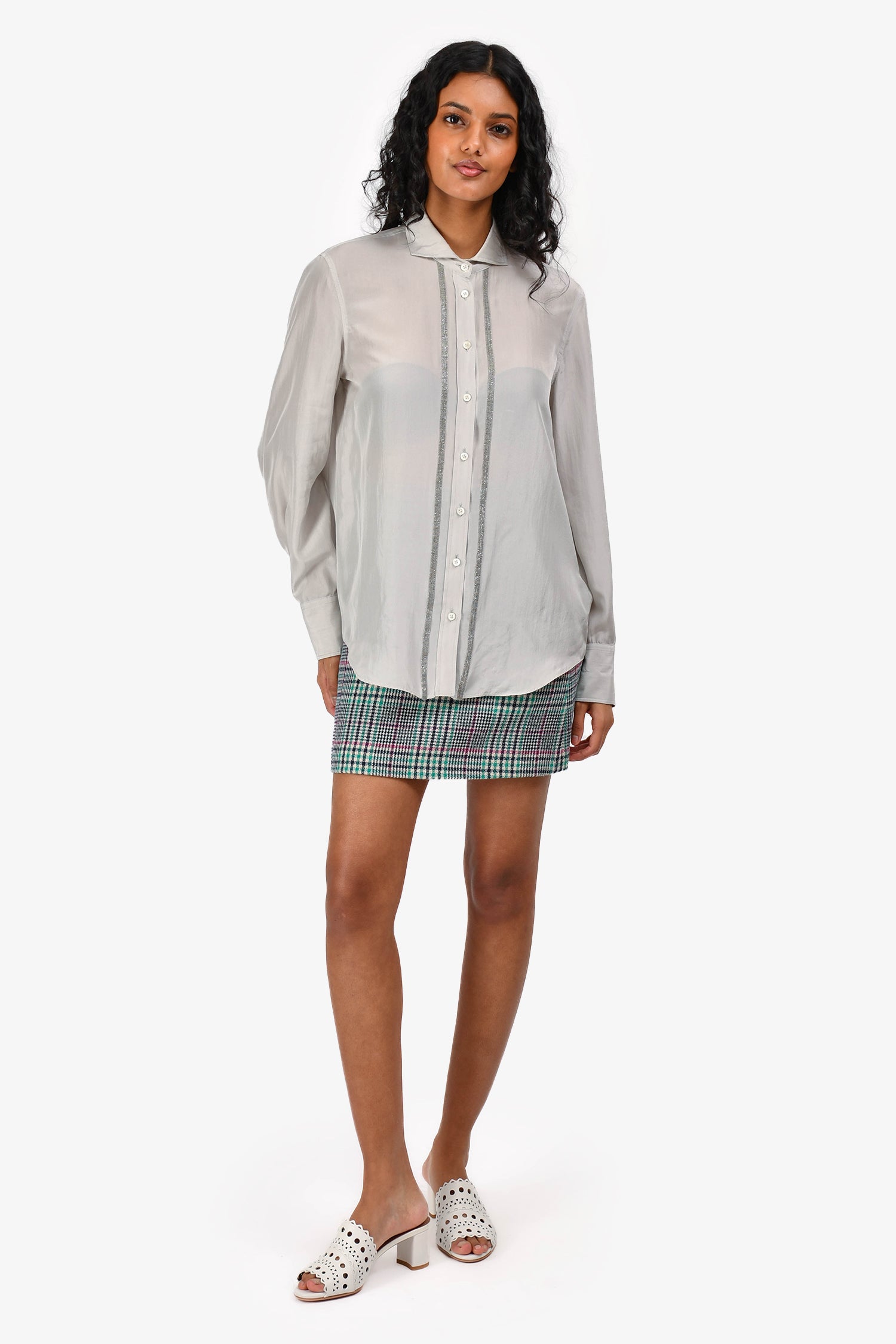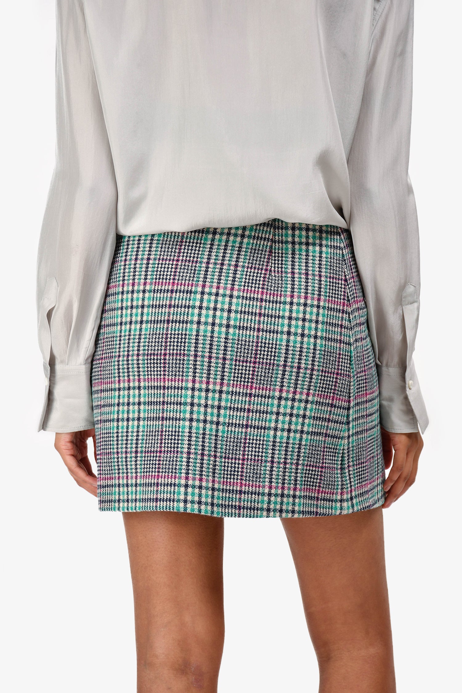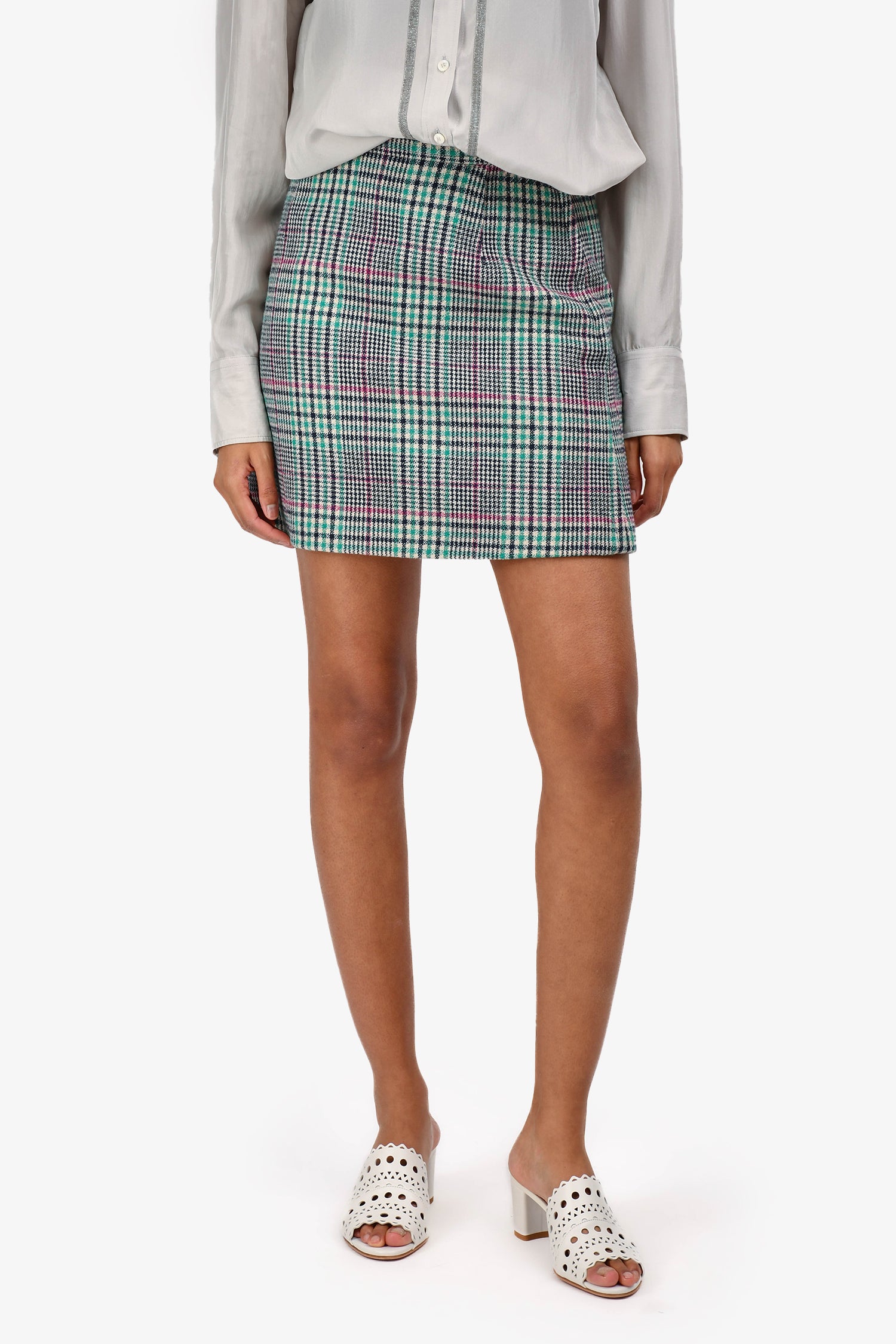 Refresh availabilitySandro Green/Navy Wool Plaid Mini Skirt. Side zip closure. Lined. Silver-toned hardware. Tonal stitching.