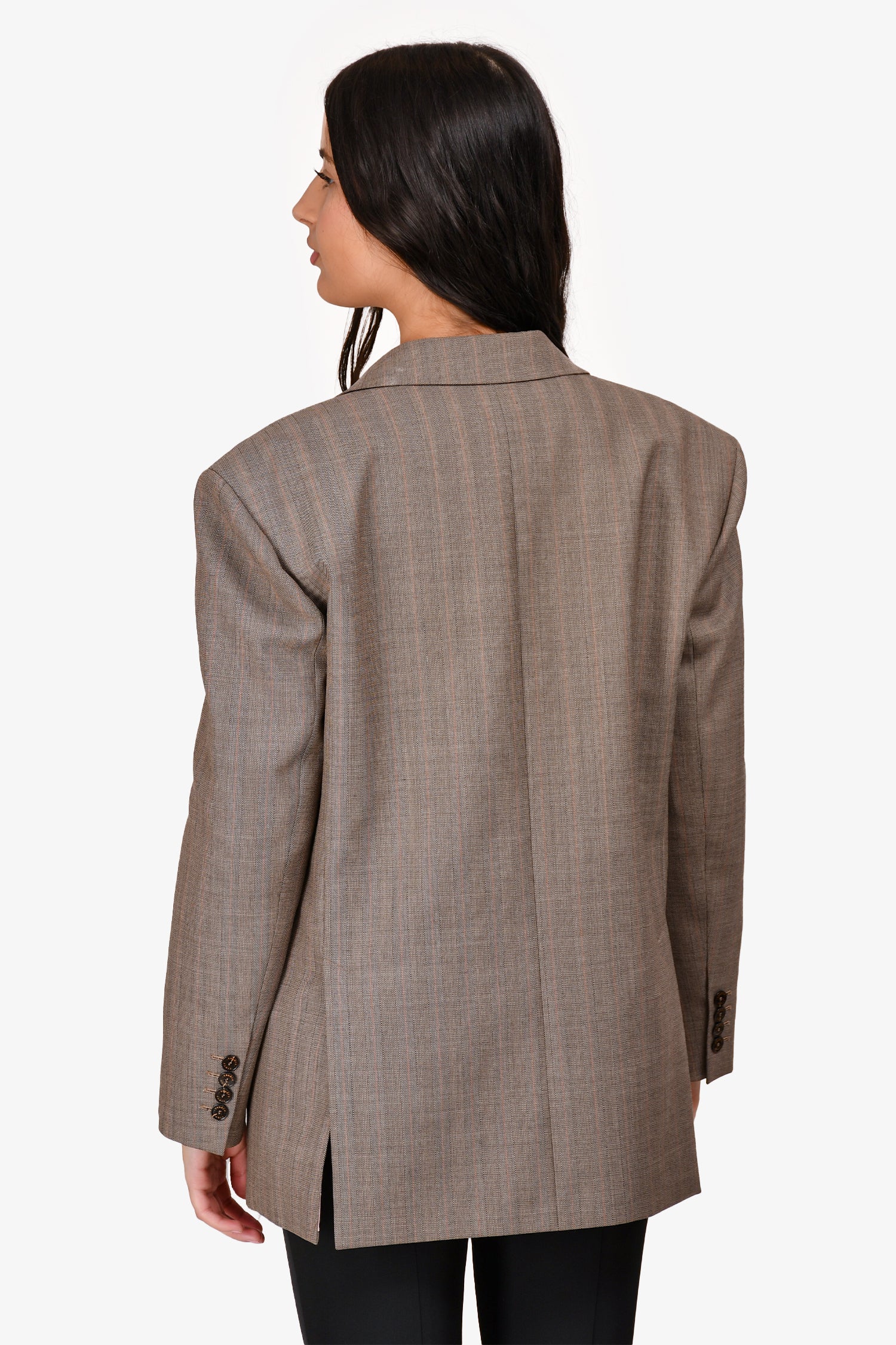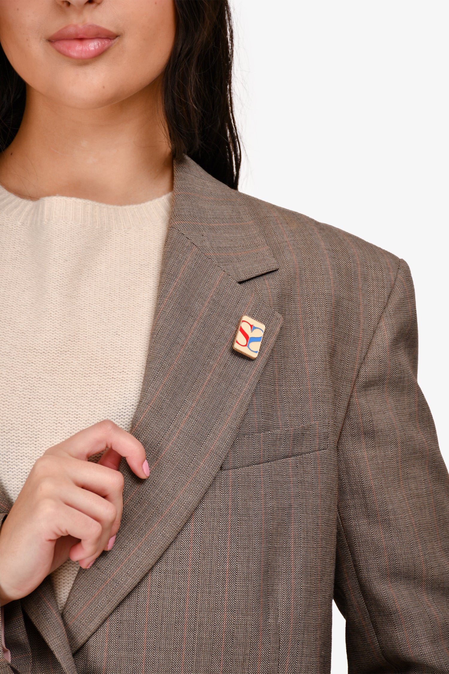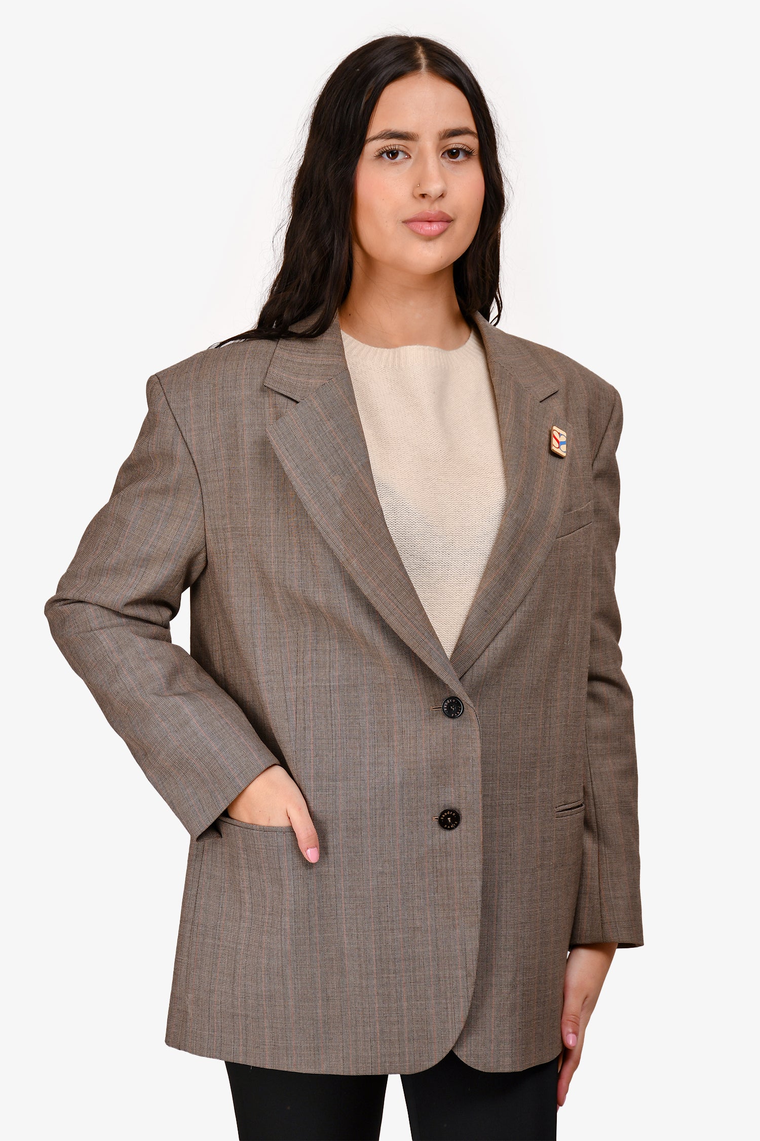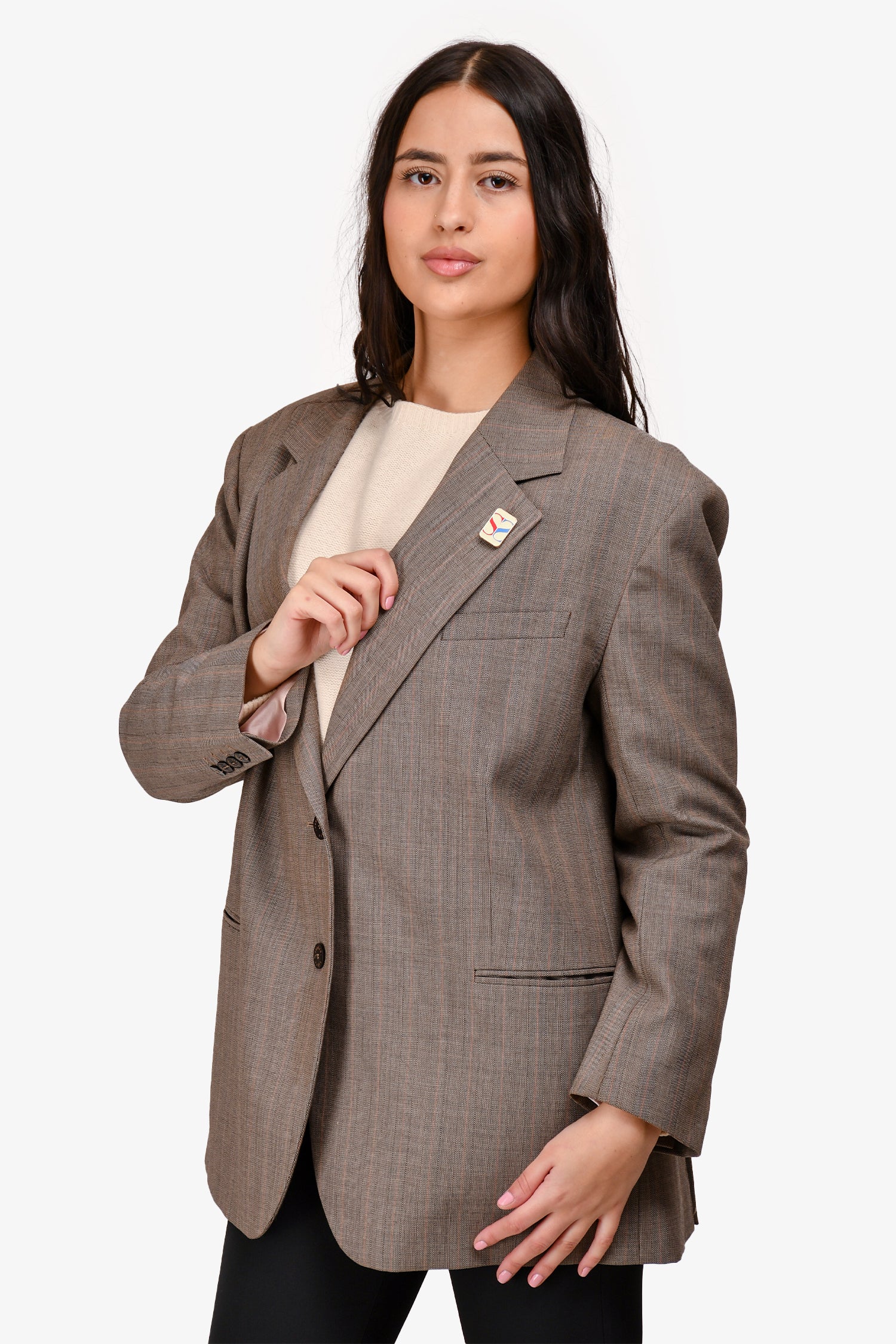 Refresh availabilitySandro Grey/Blush Check Single Breasted Pin Blazer. Front button-up closure. Built-on shoulder pads. Two front pockets. Tonal hardware. Silver-tone brooch on the left side. Tonal stitching.