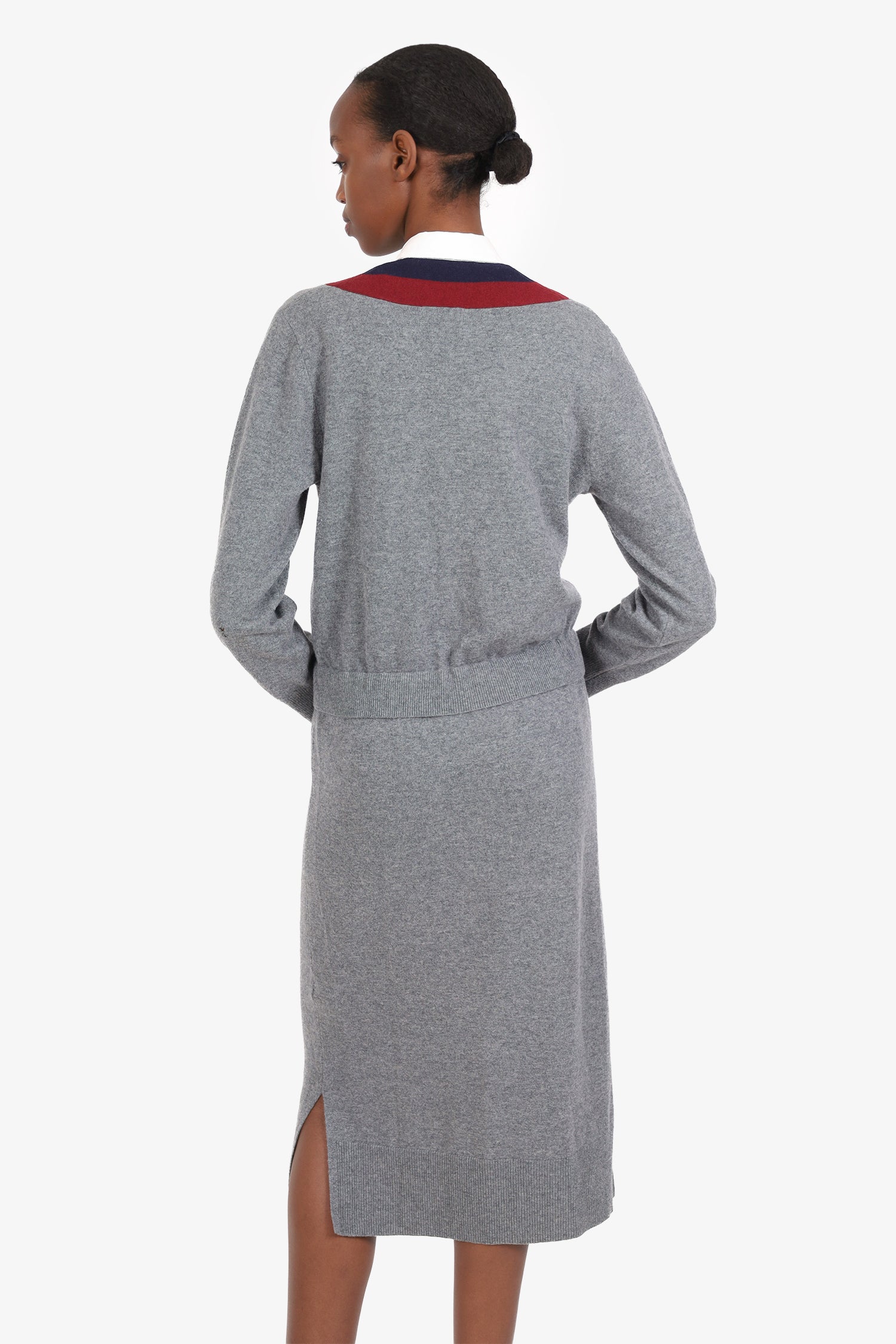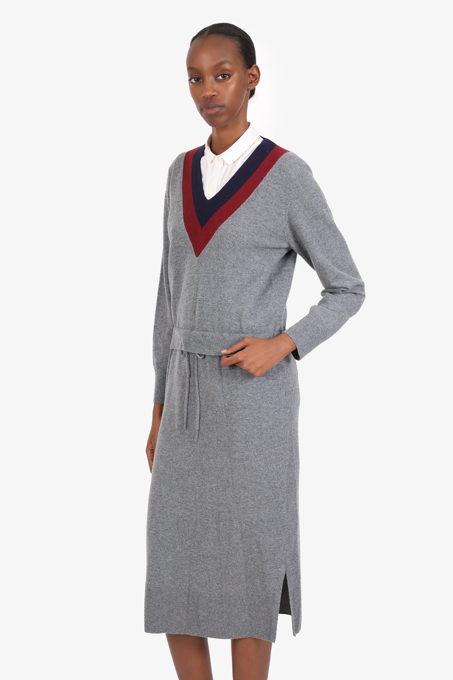 Refresh availabilitySandro Grey/Burgundy Wool V-Neck Long Sleeve Drawstring Dress. Slip-on. V-neckline. Drawstring closure to waistband. 2 side slits. Tonal stitching.