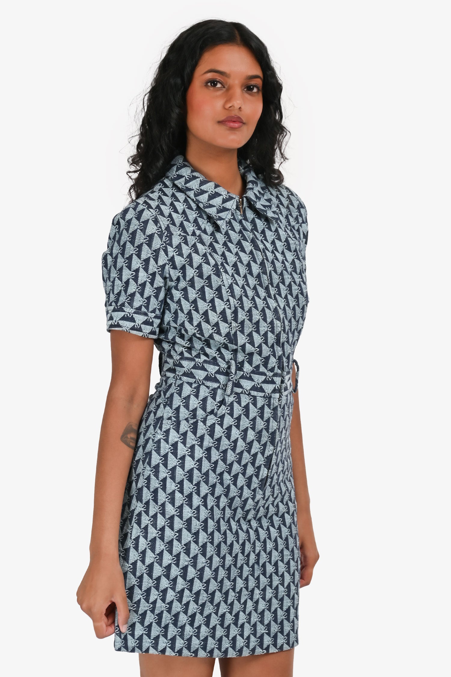Refresh availabilitySandro Light/Dark Wash Triangle Pattern Mini Dress. Front zip closure. Short sleeves. Front pockets. Classic collar neckline. Waist belt loops. Tonal stitching.
