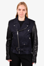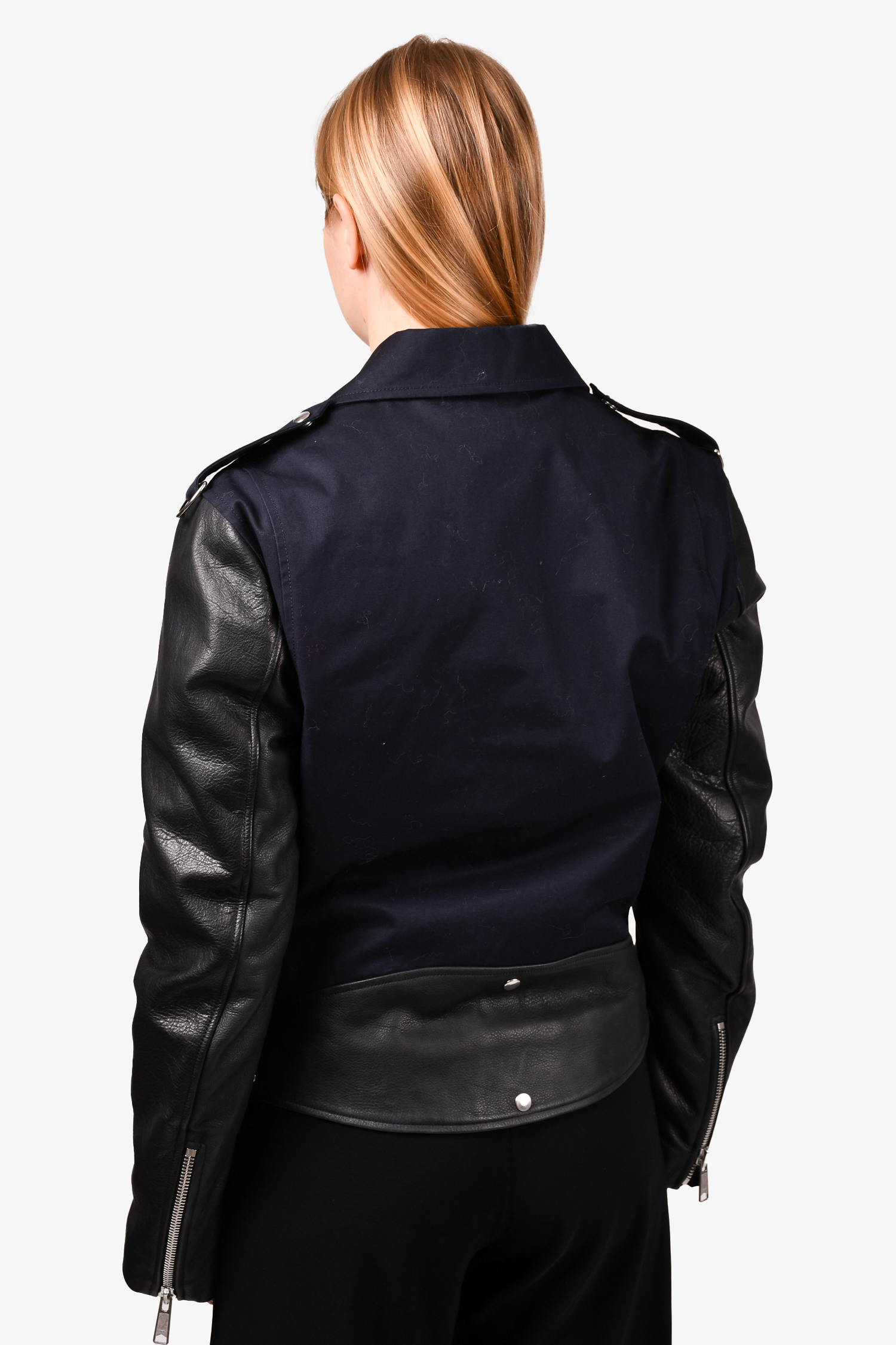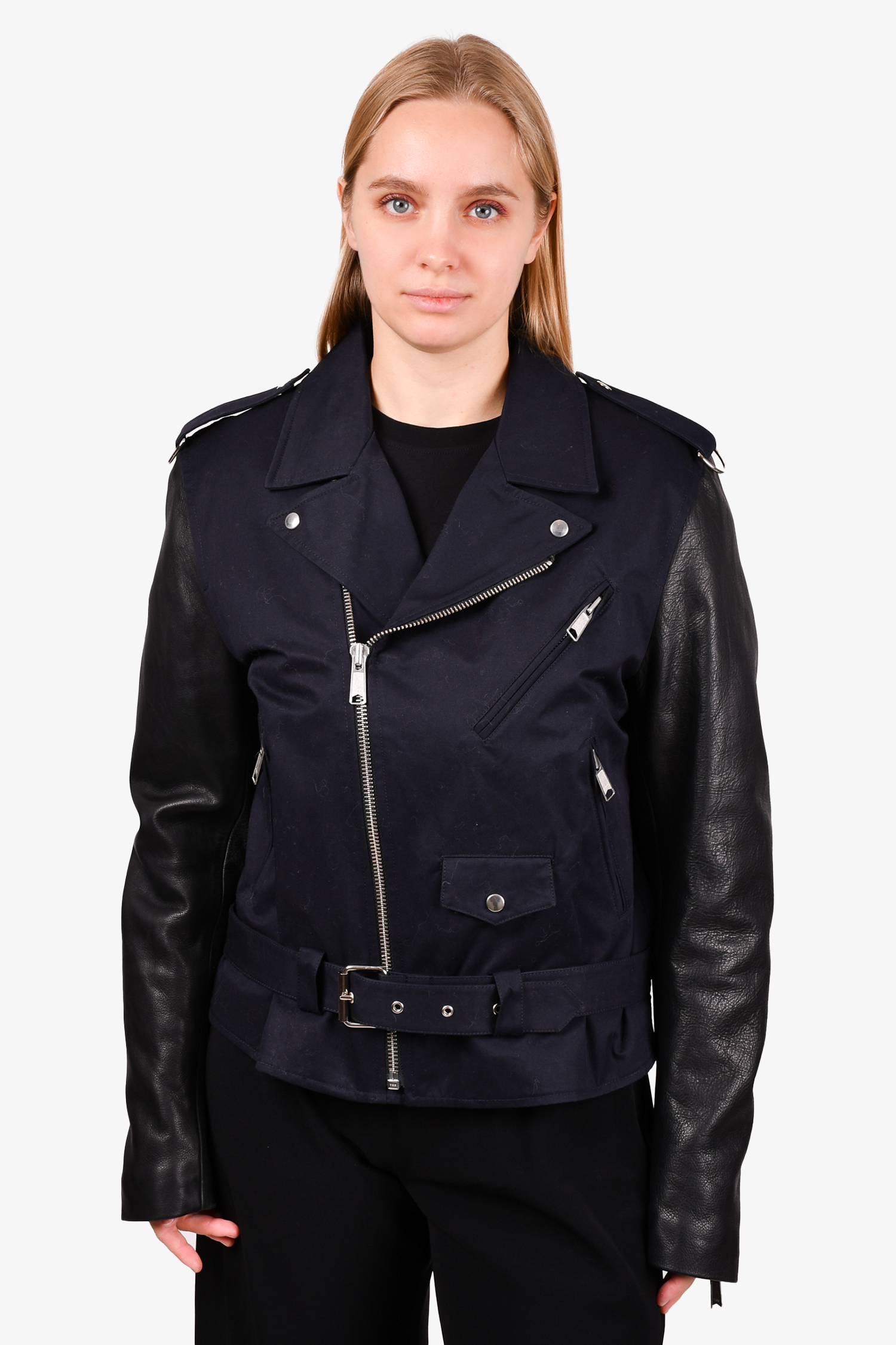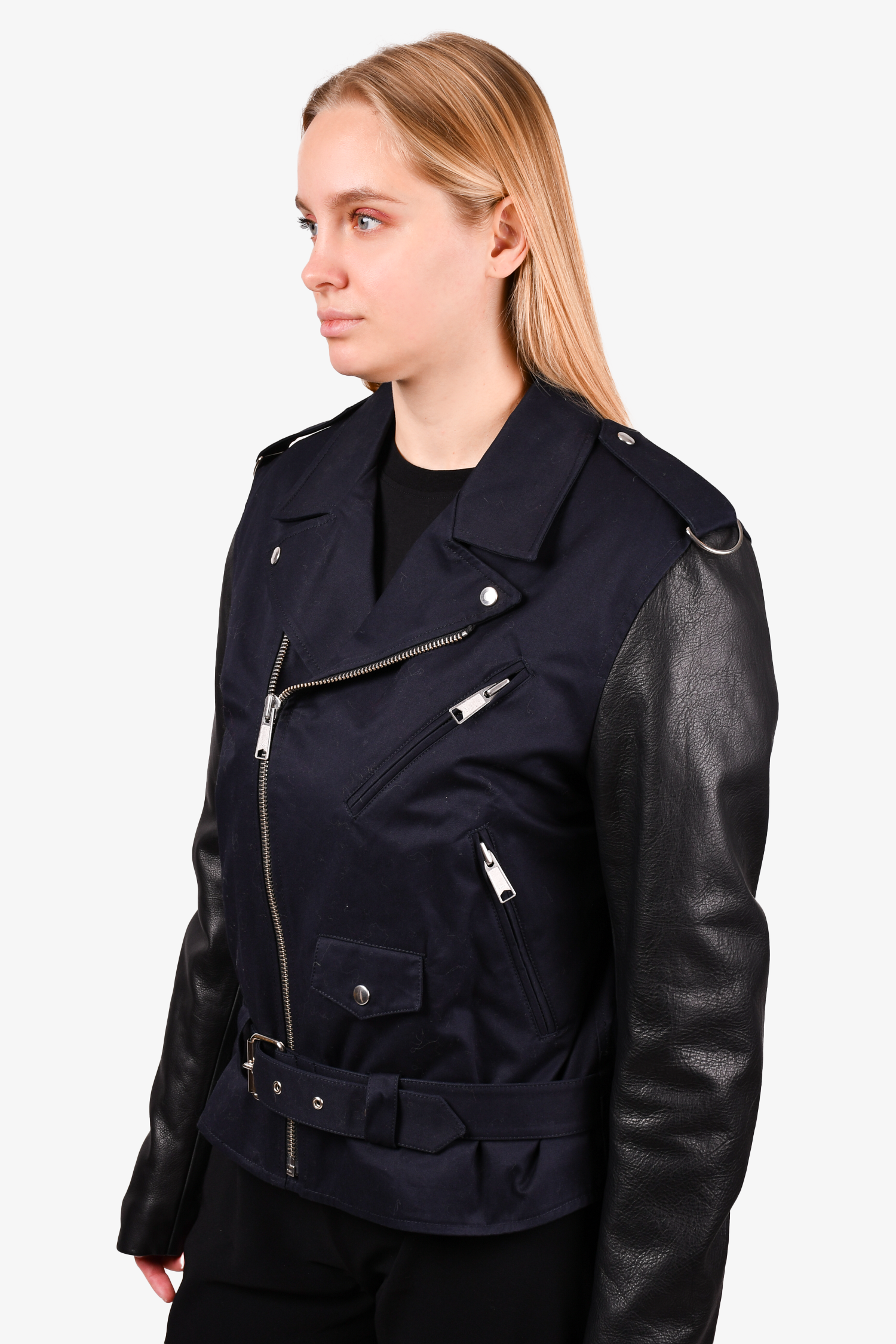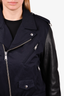 Refresh availabilitySandro Navy/Black Leather Biker Jacket. Front zipper closure. 2 interior pockets; 1 zip and 1 slip closure. Zip detail on sleeves. Zip and button-up closure on exterior pockets. Lined. Silver-toned hardware. Tonal stitching.
