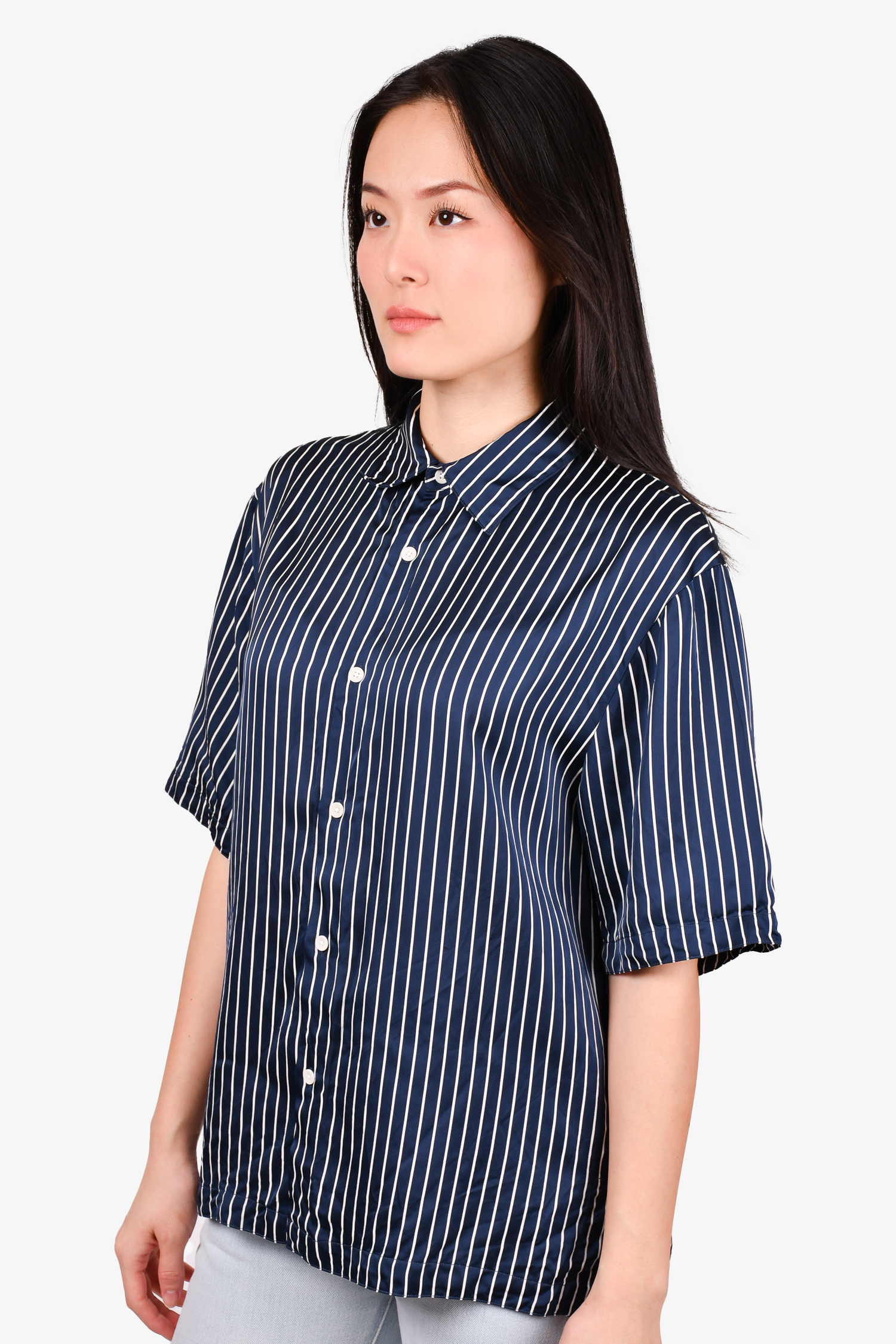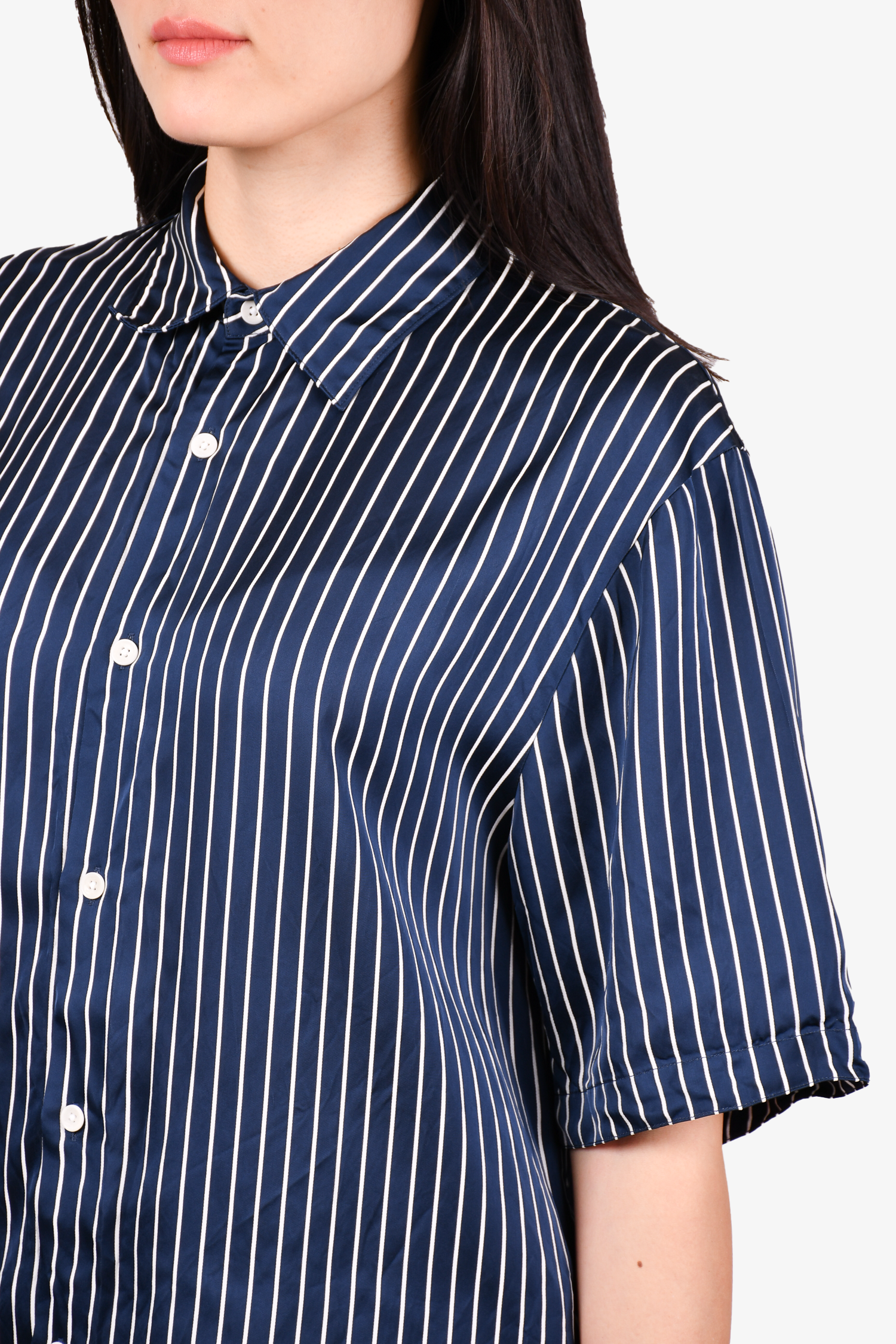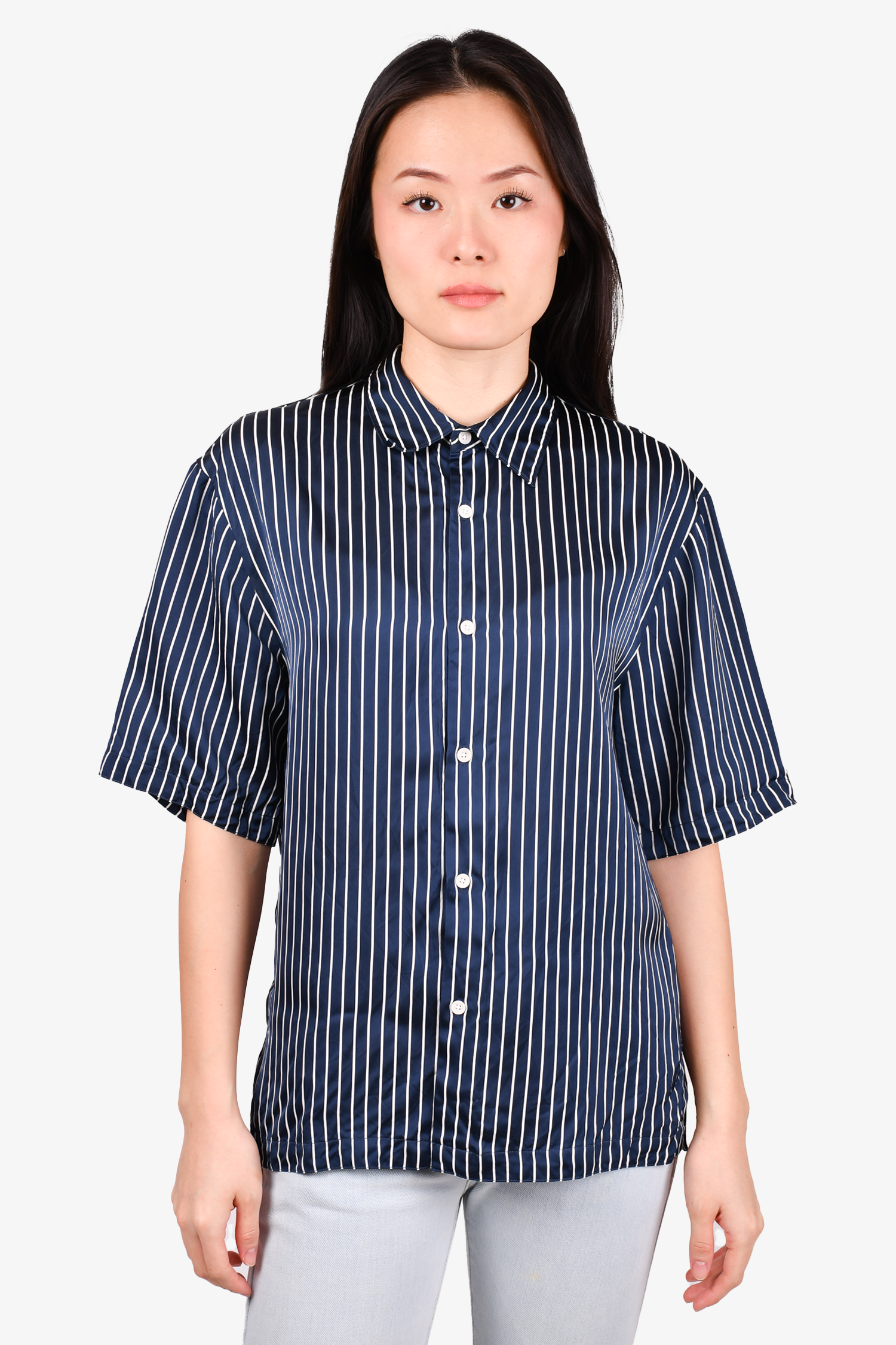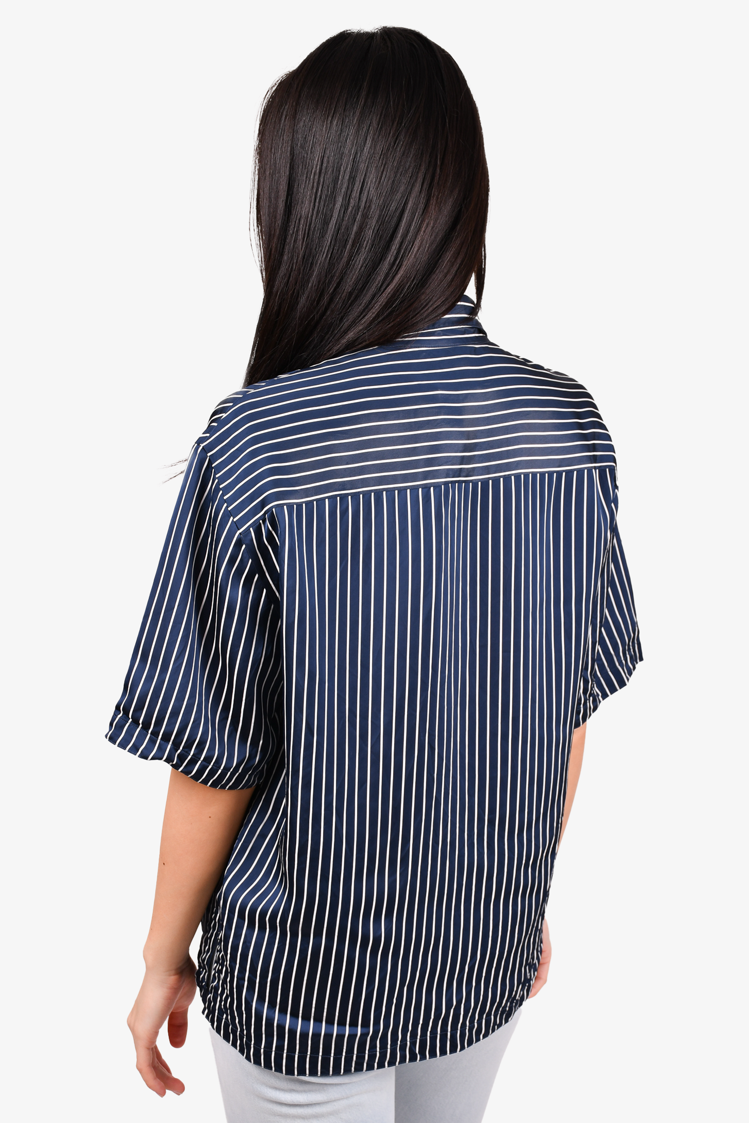 Refresh availabilitySandro Navy Blue/White Striped Button-Up Top. Front button closure. Tonal stitching.