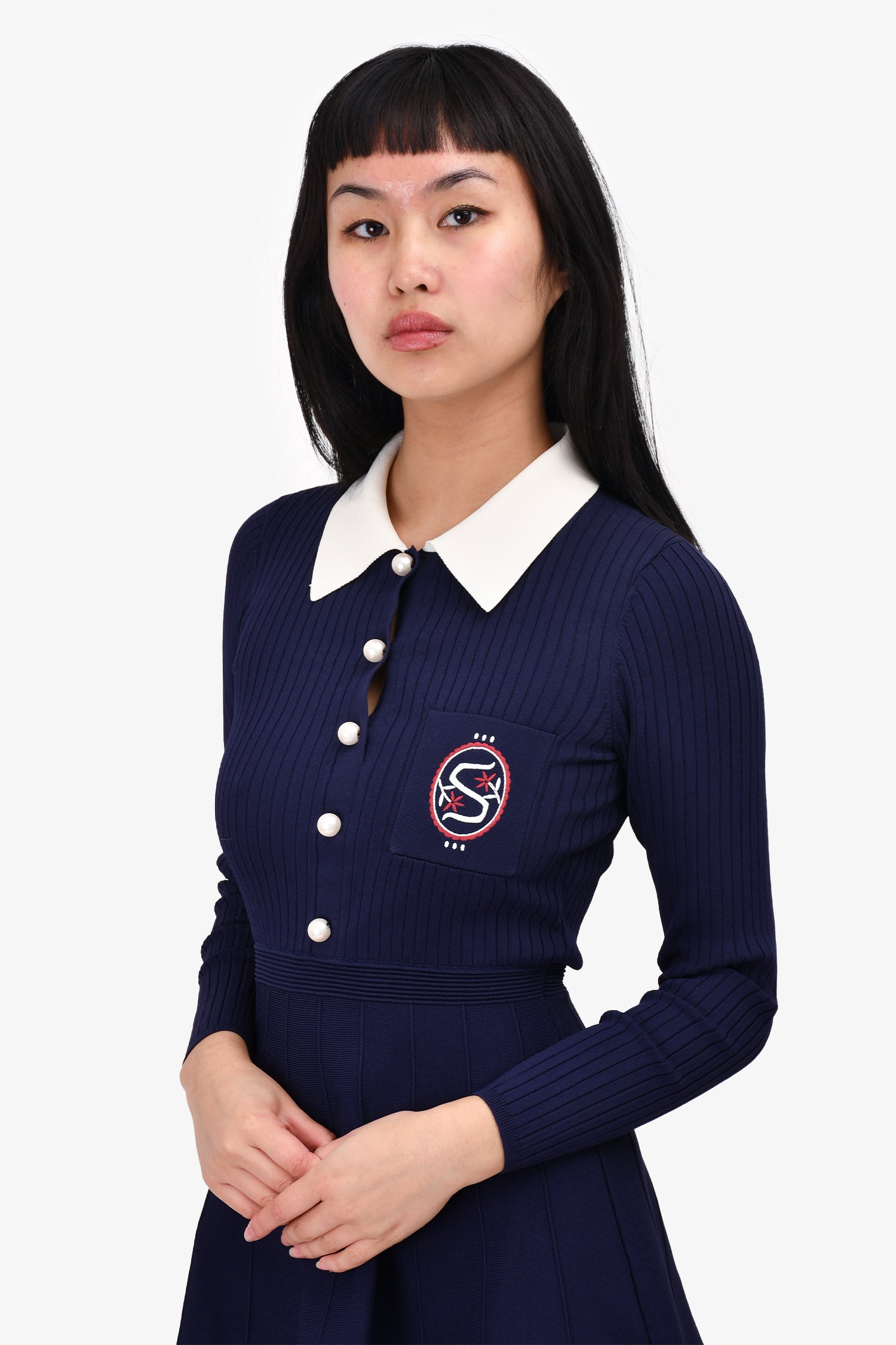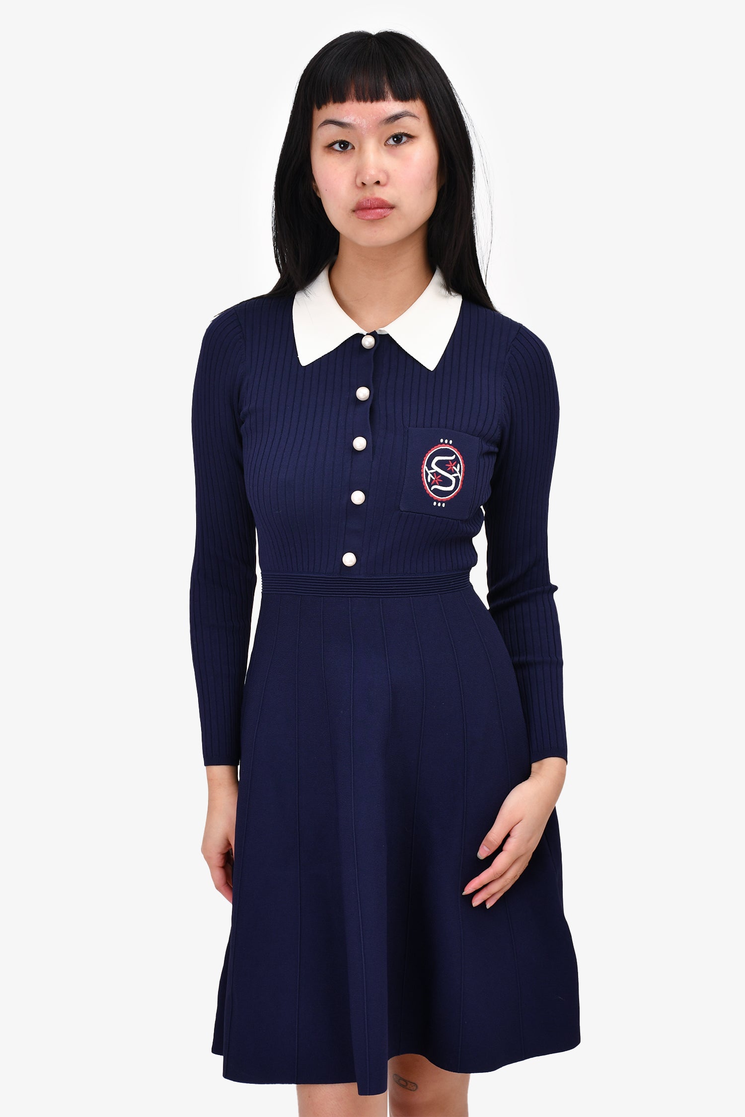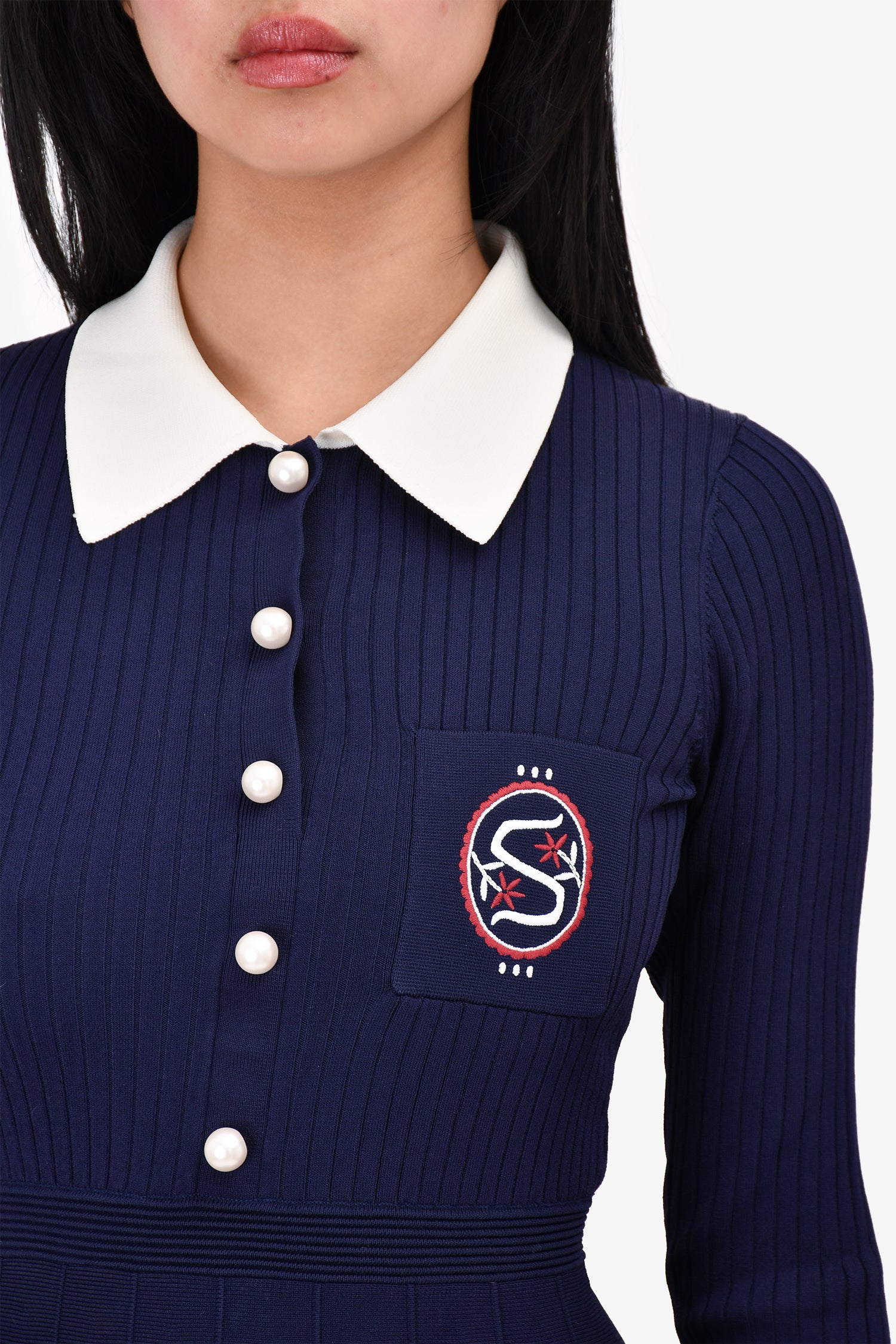 Refresh availabilitySandro Navy Knit Collared Pearl Button 'S' Logo Dress. Front button-up closure. Single front chest pocket. Tonal stitching.