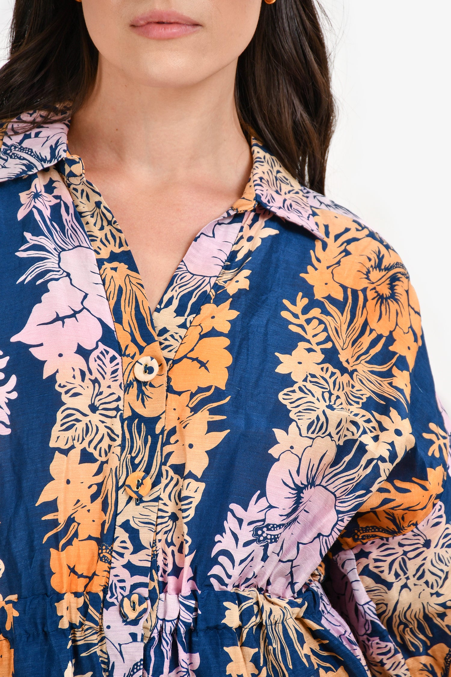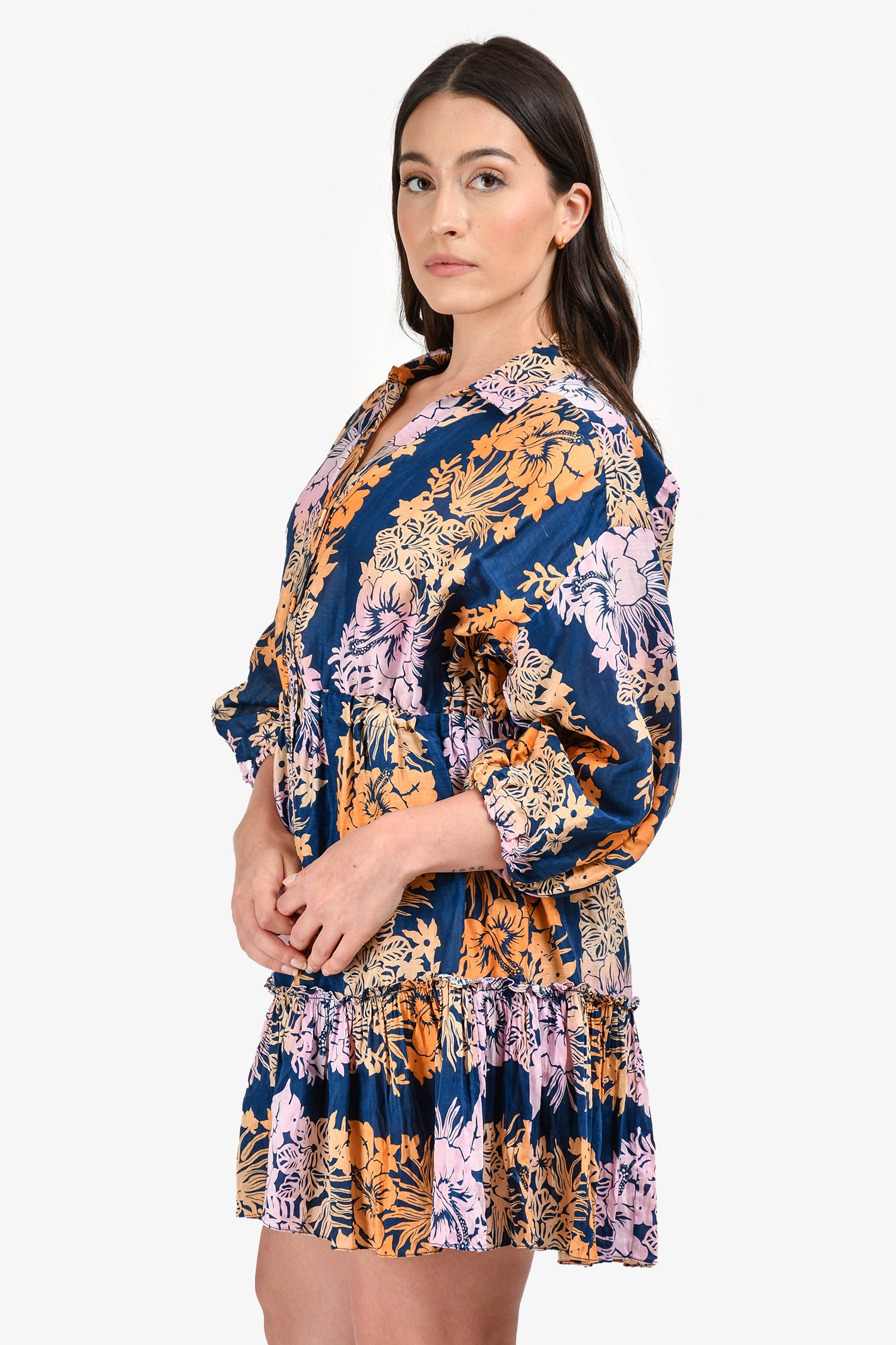 Refresh availabilitySandro Navy/Orange/Purple Floral Cotton Long Sleeve Mini Dress. V-neckline. Side zip closure. Tonal stitching.
