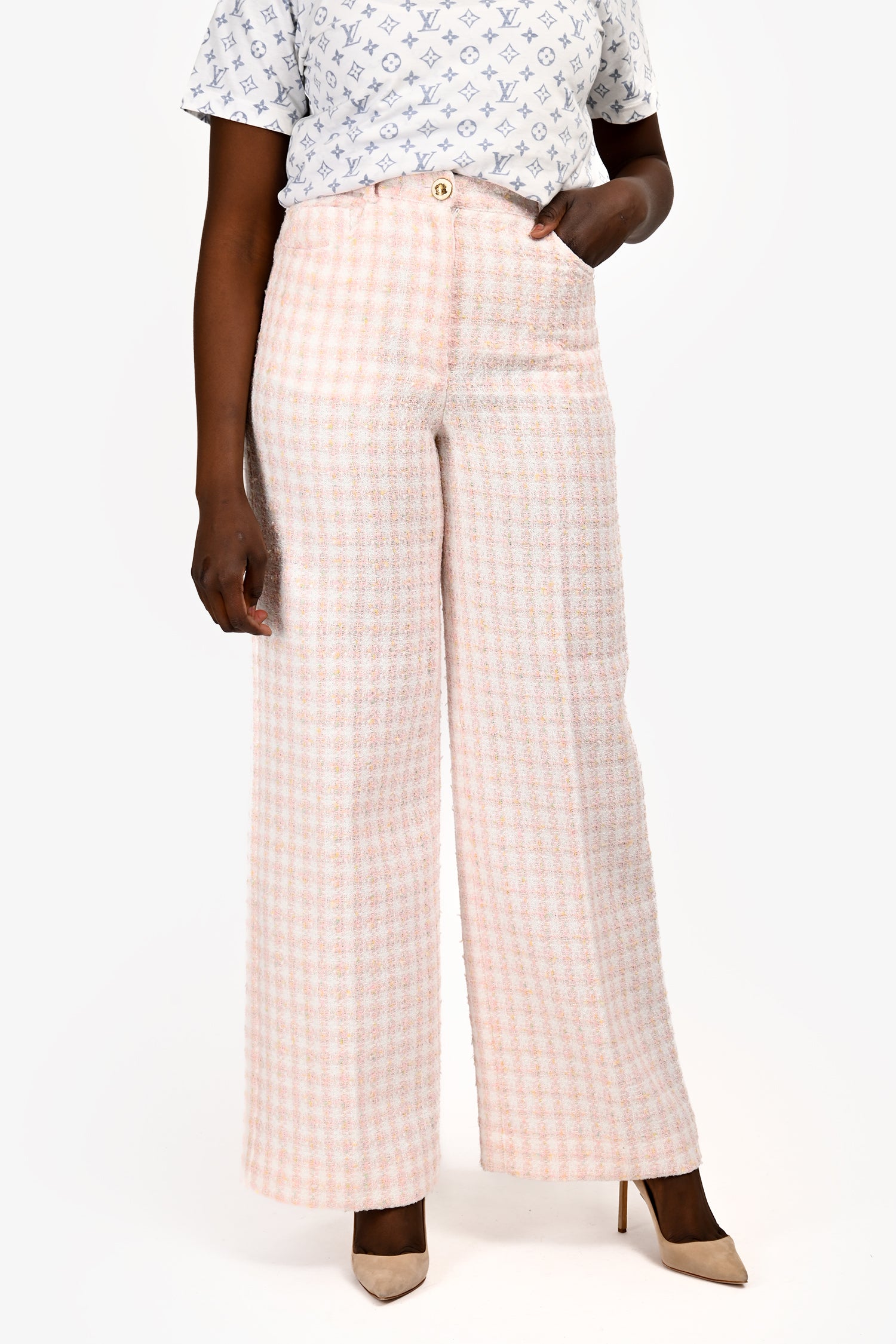 Refresh availabilitySandro Pink/White Tweed Sequin Wide Leg Pants. Slip-on. Front zip and button closure. Waistband belt loops. 5 exterior pockets; 2 side slip and 1 mini compartment, 2 rear slip. Tonal stitching.