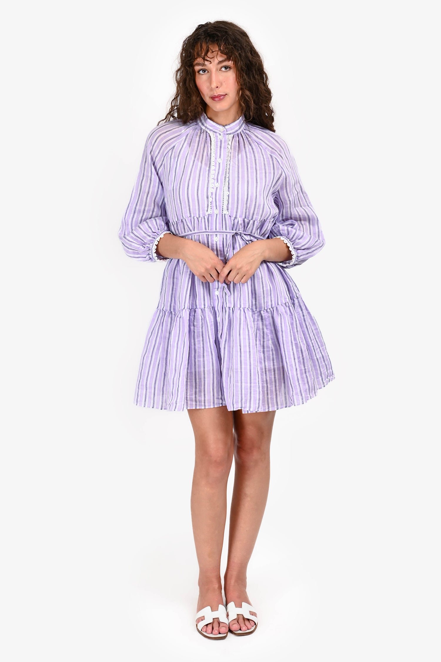 Refresh availabilitySandro Purple/White Linen Striped Long Sleeves Mini Dress. Round neckline with button front. Long sleeves with button cuffs. Tonal detachable fabric belt. Comes with white slip. Tonal stitching.