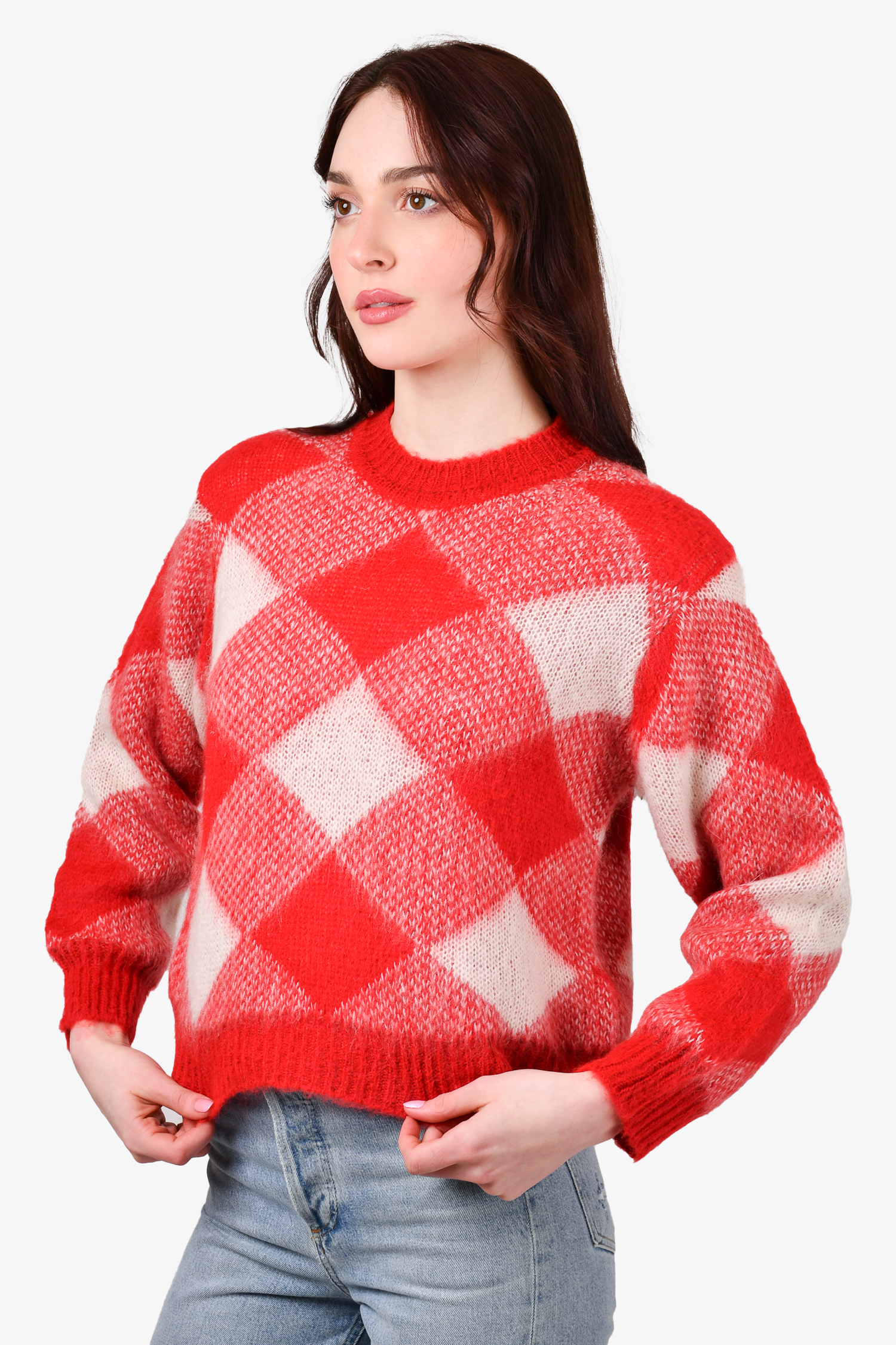 Refresh availabilitySandro Red Check Mohair Blend Crewneck Sweater. Round neck. Pull-on. Ribbed neck, cuffs and hem. Tonal stitching.