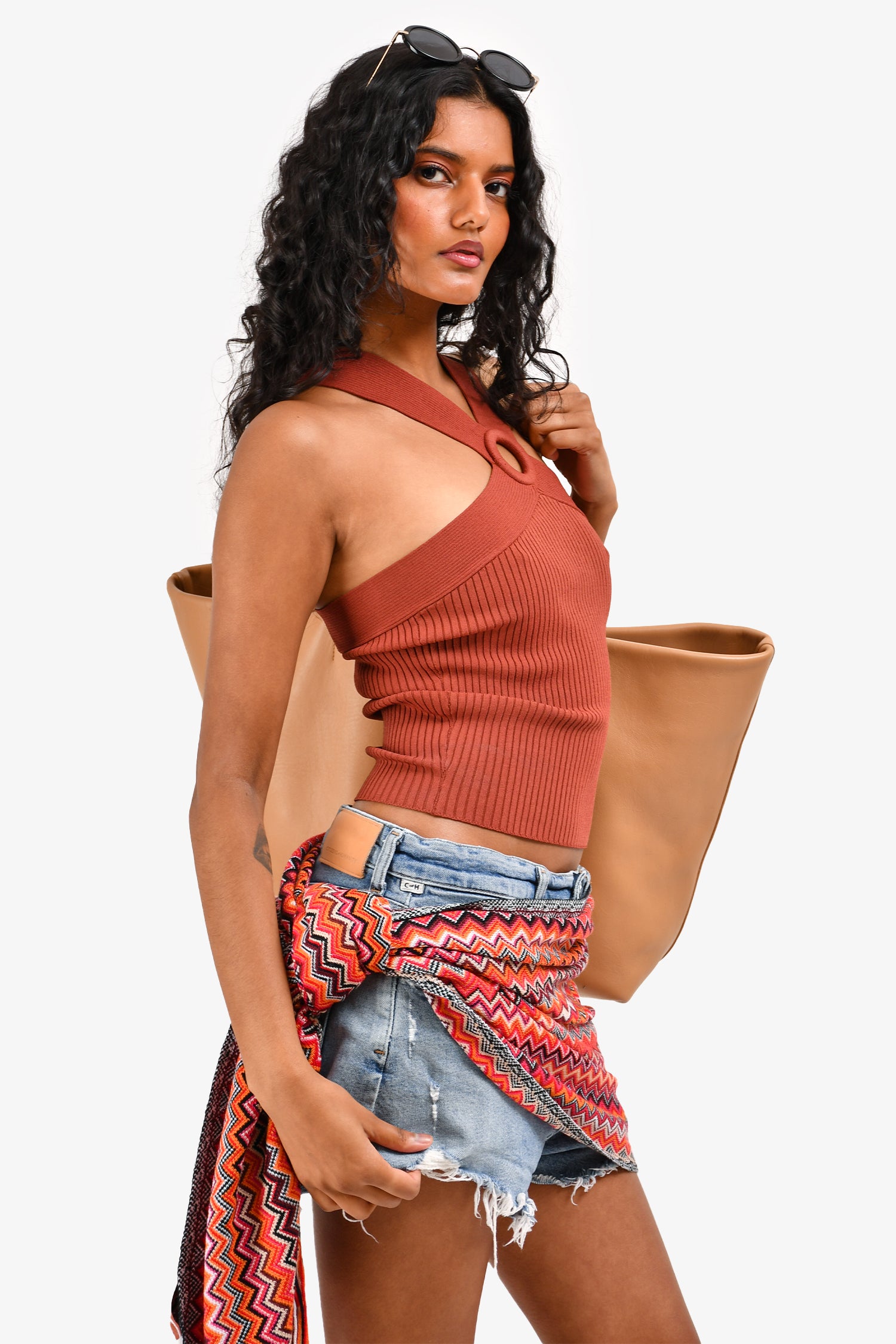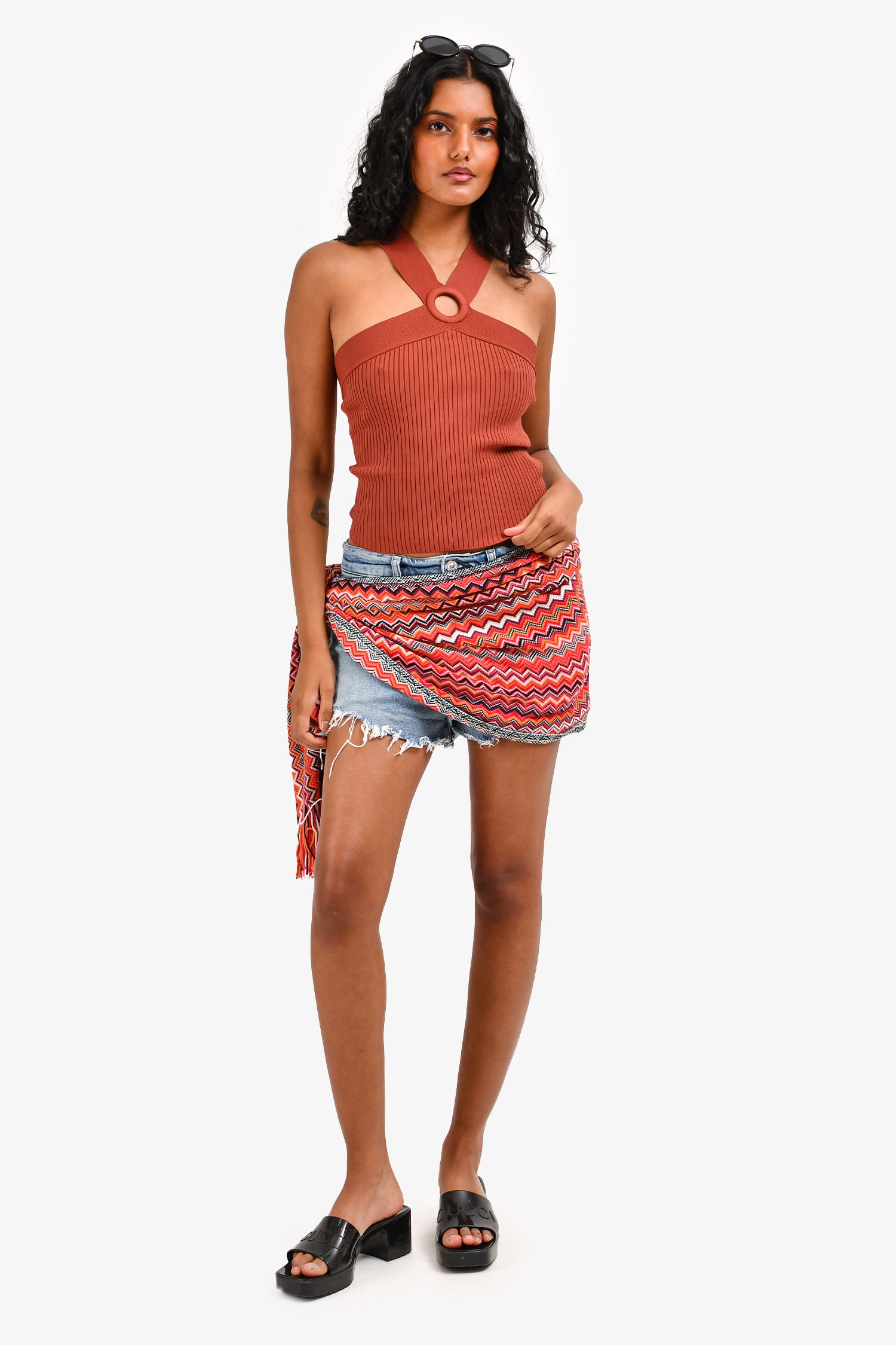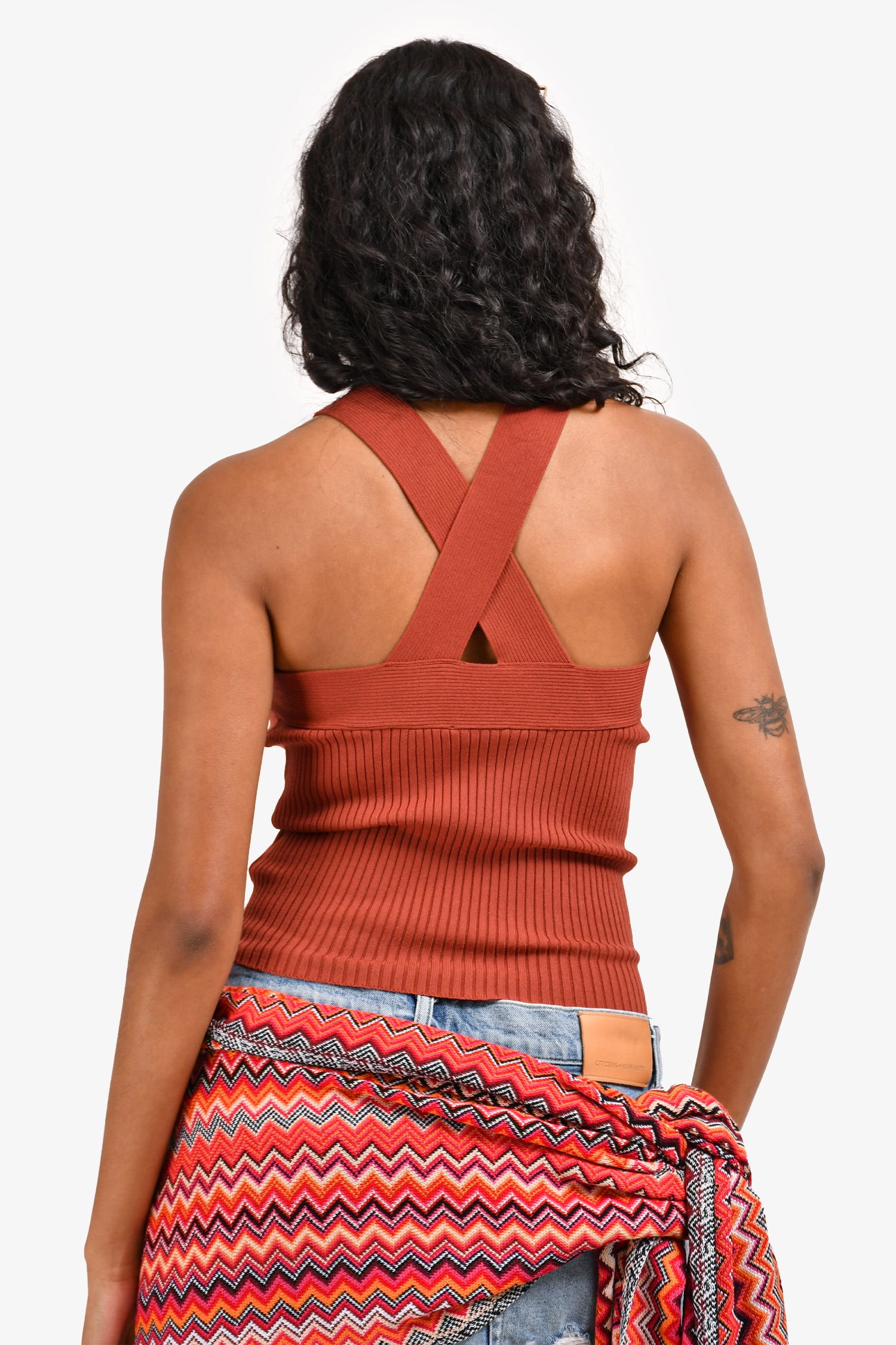 Refresh availabilitySandro Rust Ribbed Criss Cross Cut Out Top. Sleeveless. Pull-on style. Tonal stitching.