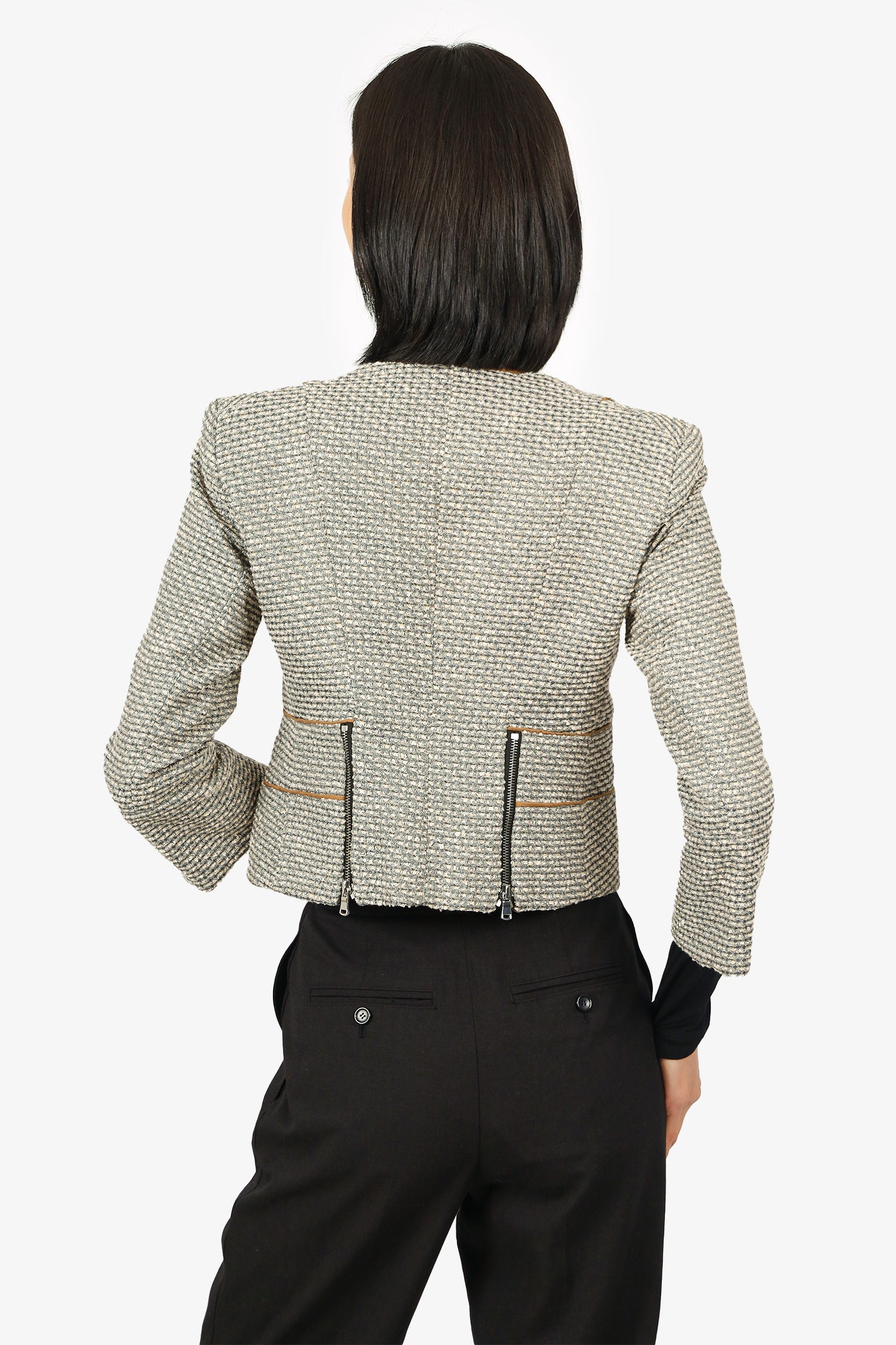 Refresh availabilitySandro Silver Metallic Tweed Cropped Jacket. V-neckline. Front hook closure. 2 front exterior slip pockets. Double rear vents with zip closure. Lined interior. Silver-tone hardware. Tonal stitching.