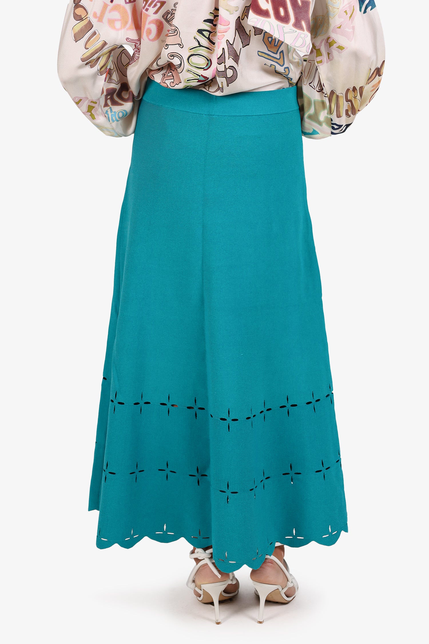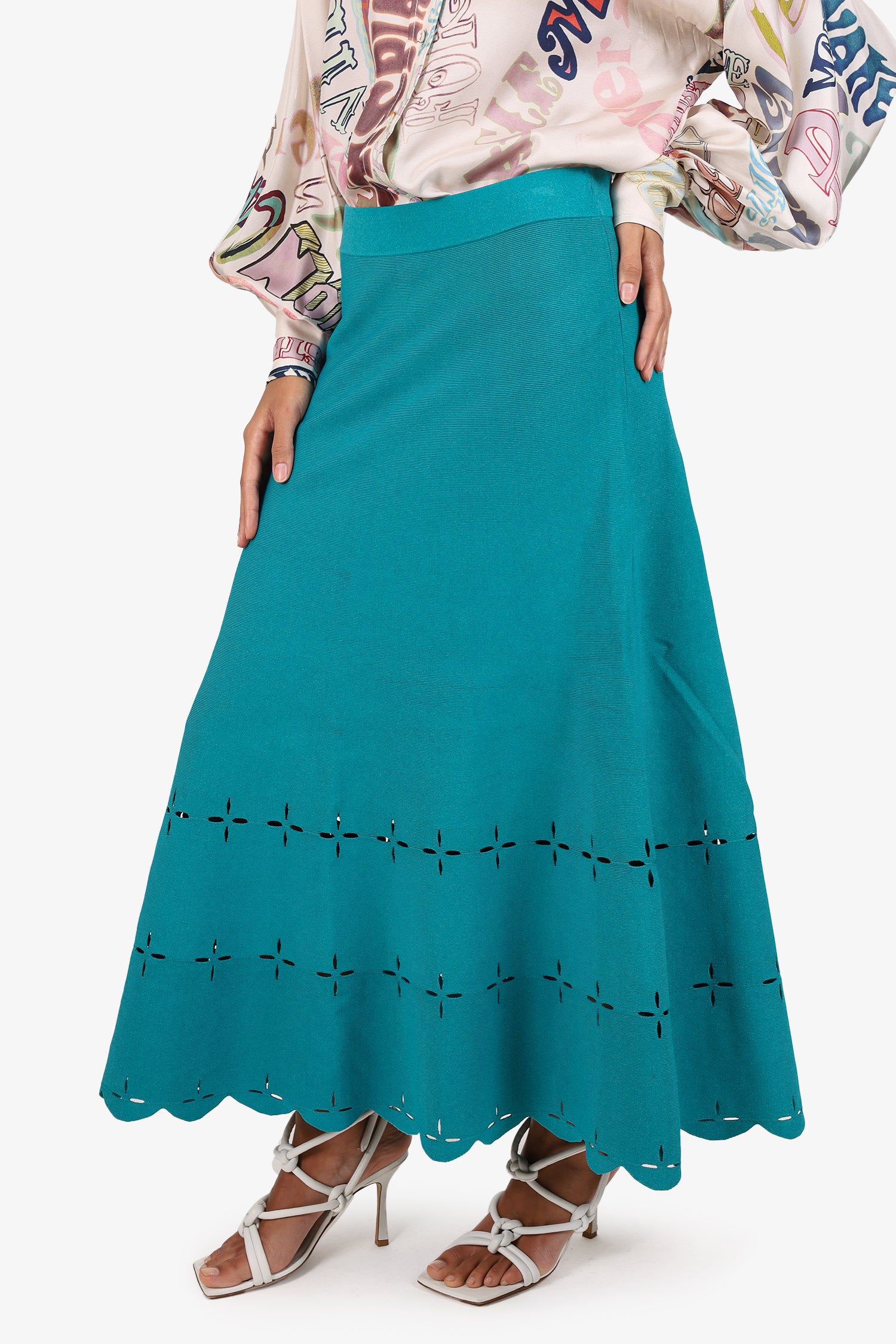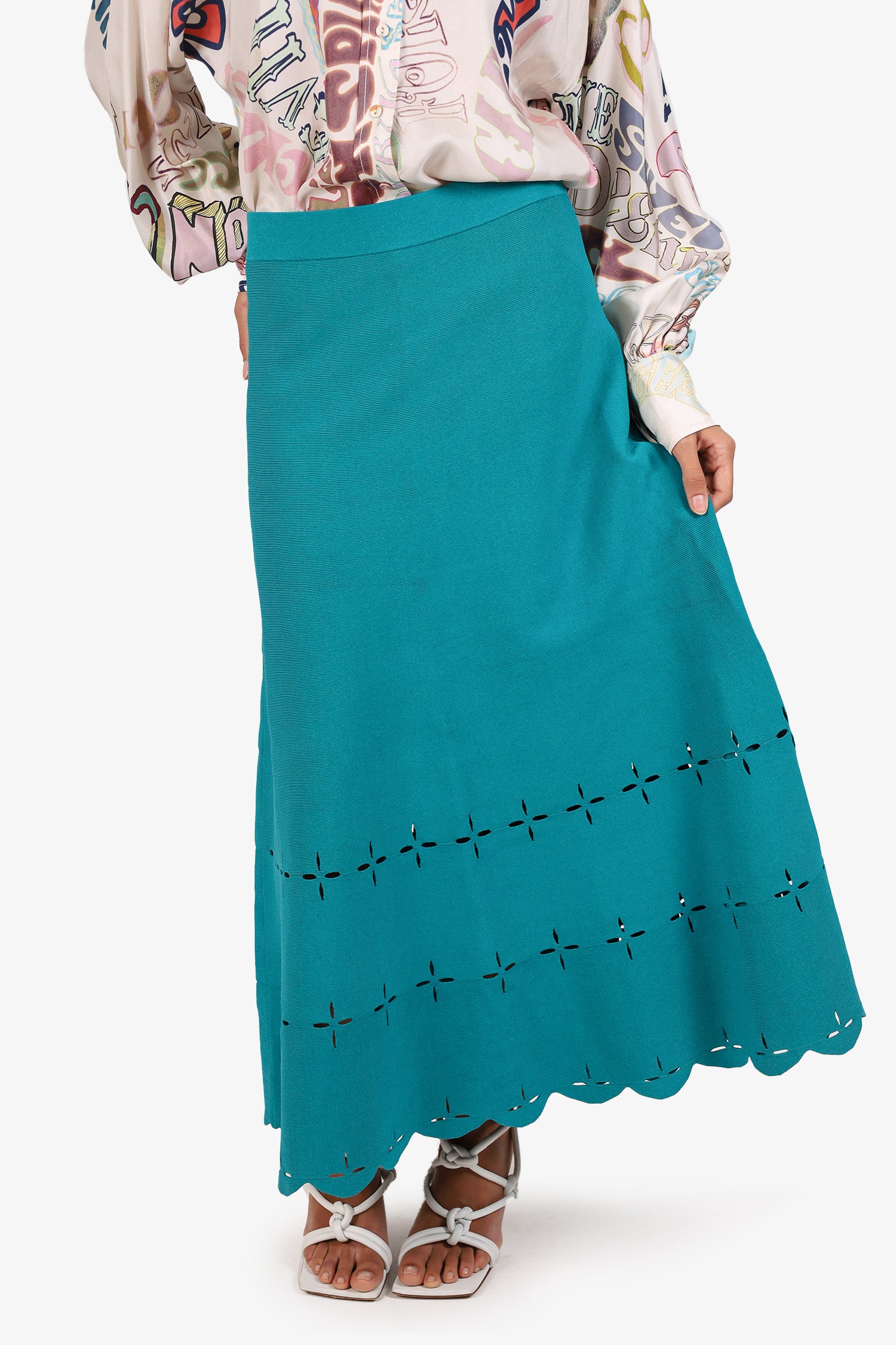 Refresh availabilitySandro Teal Rosy Laser-cut Ponte Ribbed Midi Skirt. Slip-on. Elasticated waistband. Scalloped bottom hem. Perforated details on skirt. Tonal stitching.
