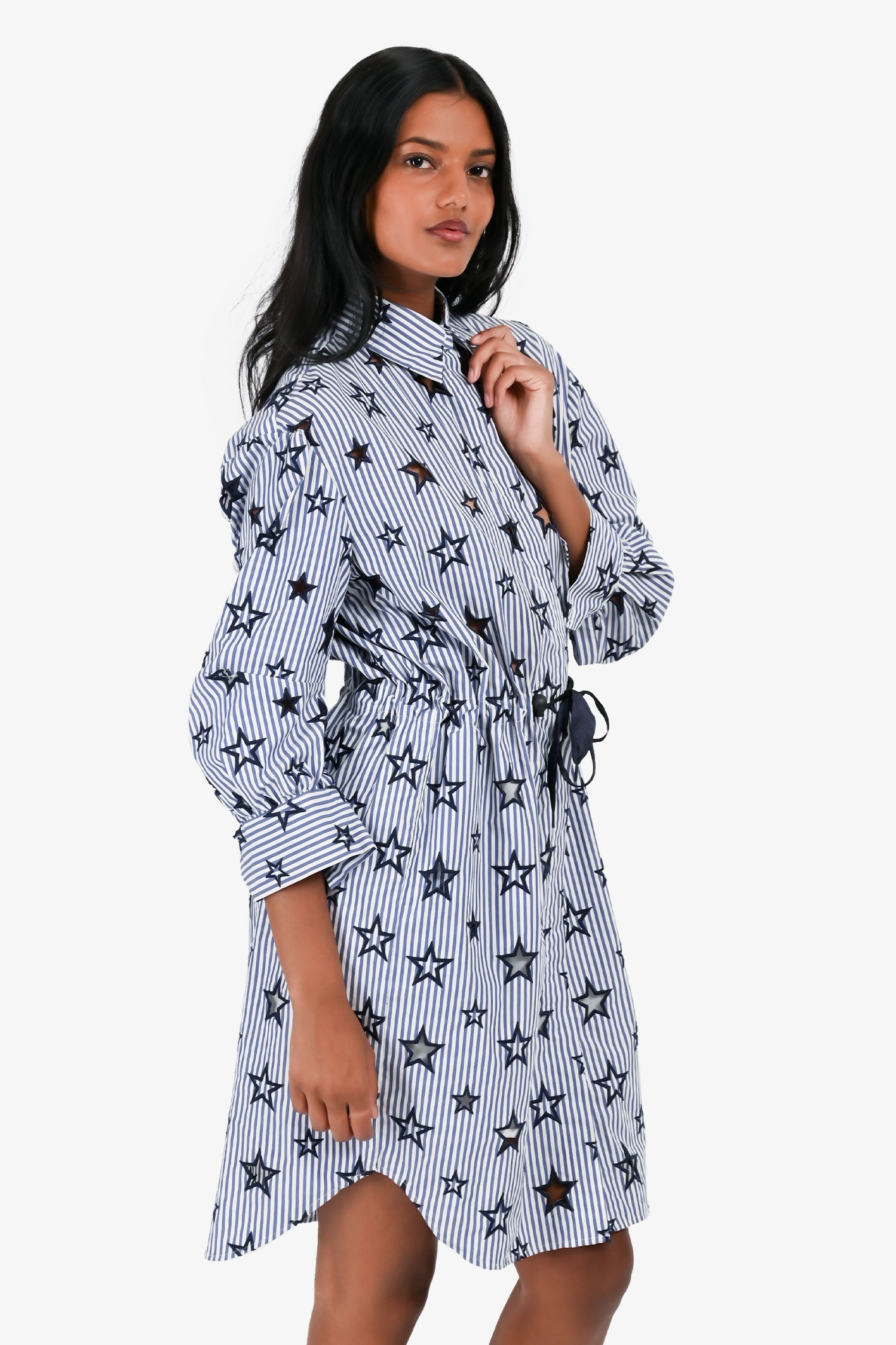 Refresh availabilitySandro White/Blue Striped Star Embroidered Shirt Dress. Pointed collar. Button front closure. Long sleeves with button cuffs. Waist adjustable drawstring. Tonal stitching.