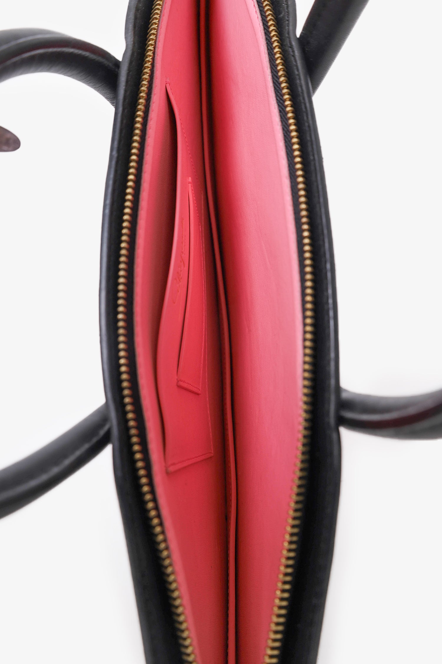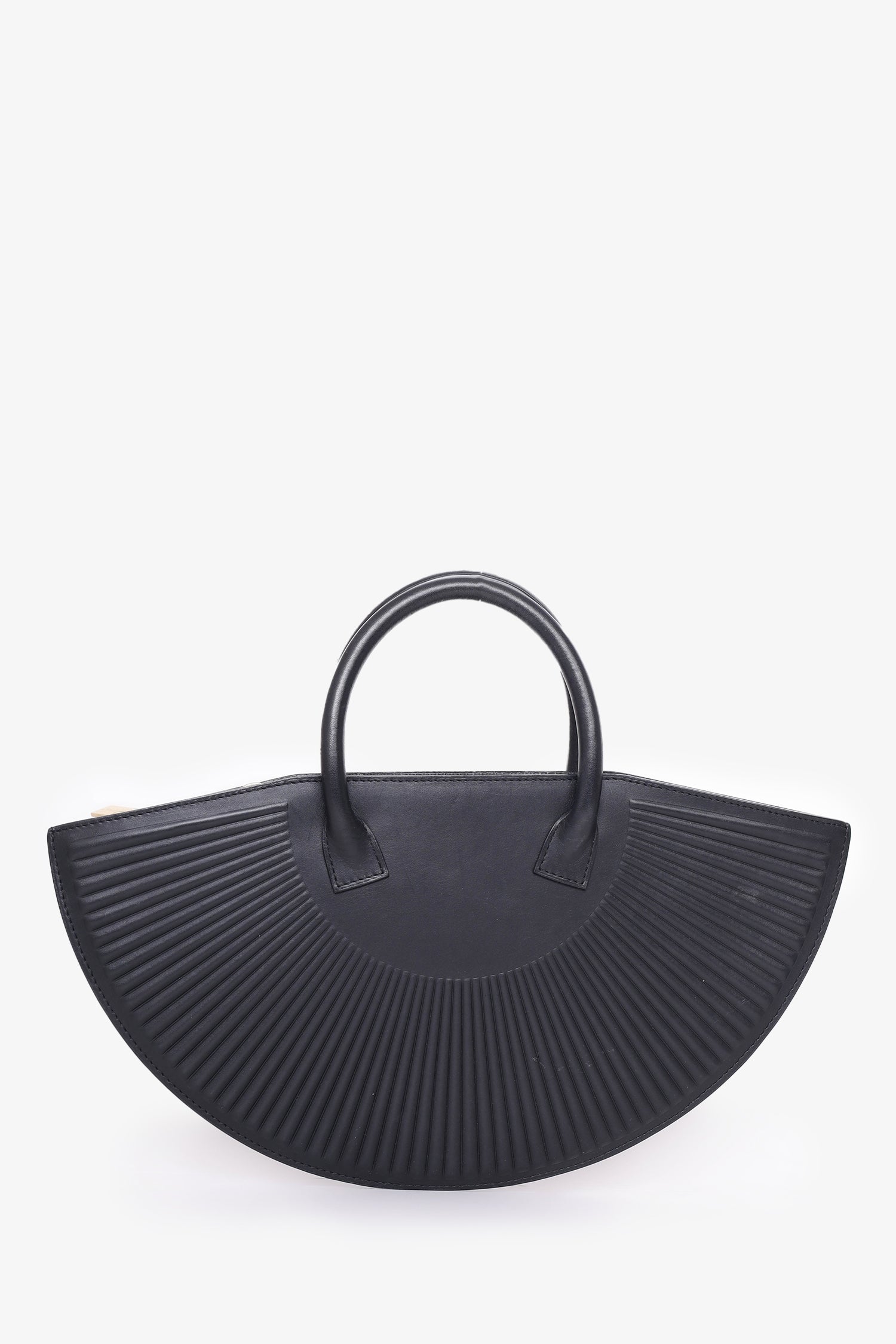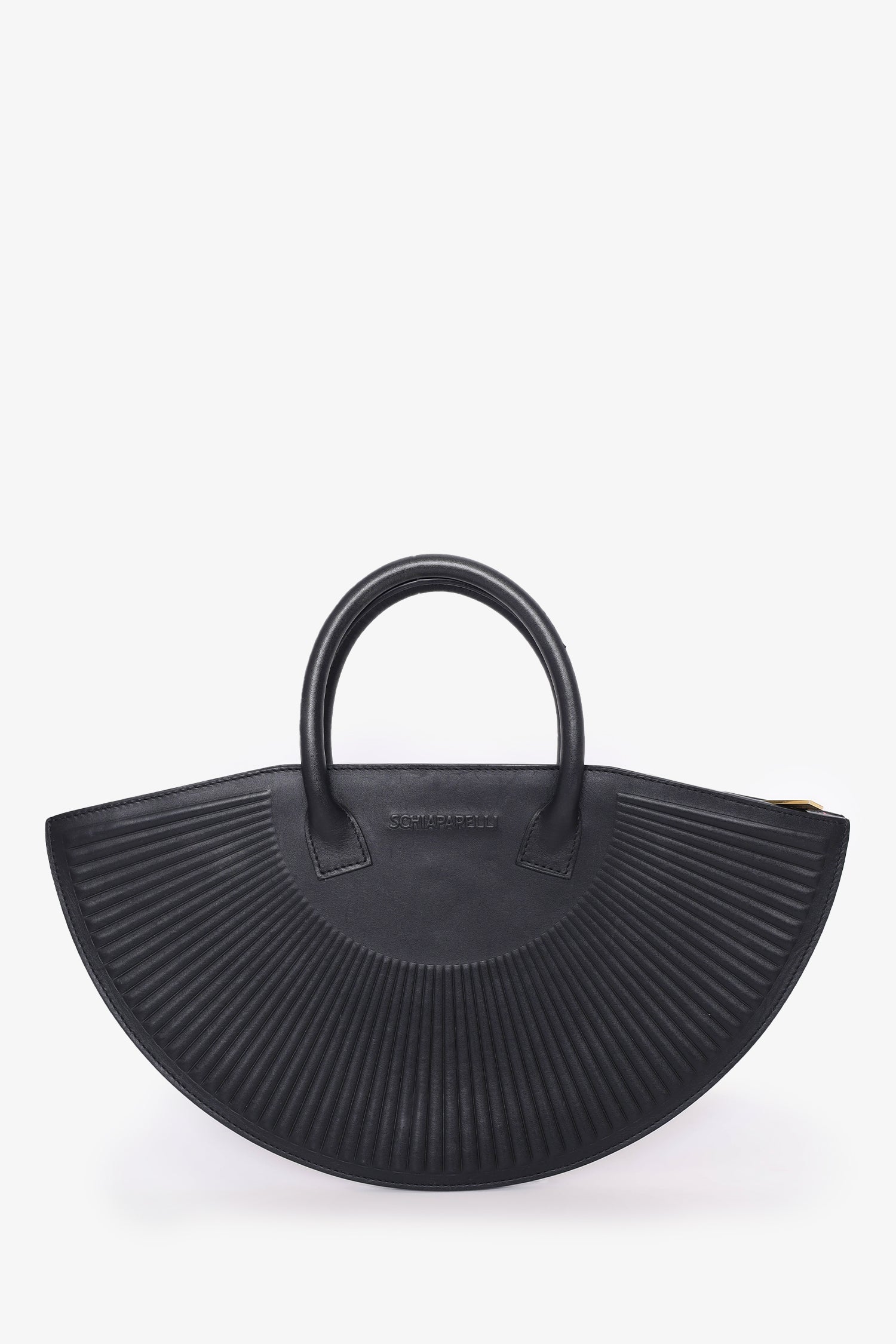 Refresh availabilitySchiaparelli Black Leather Sun Top Handle Bag. Top zip closure. Top Handle. Interior wall slip pocket. Gold-tone hardware. Tonal stitching.