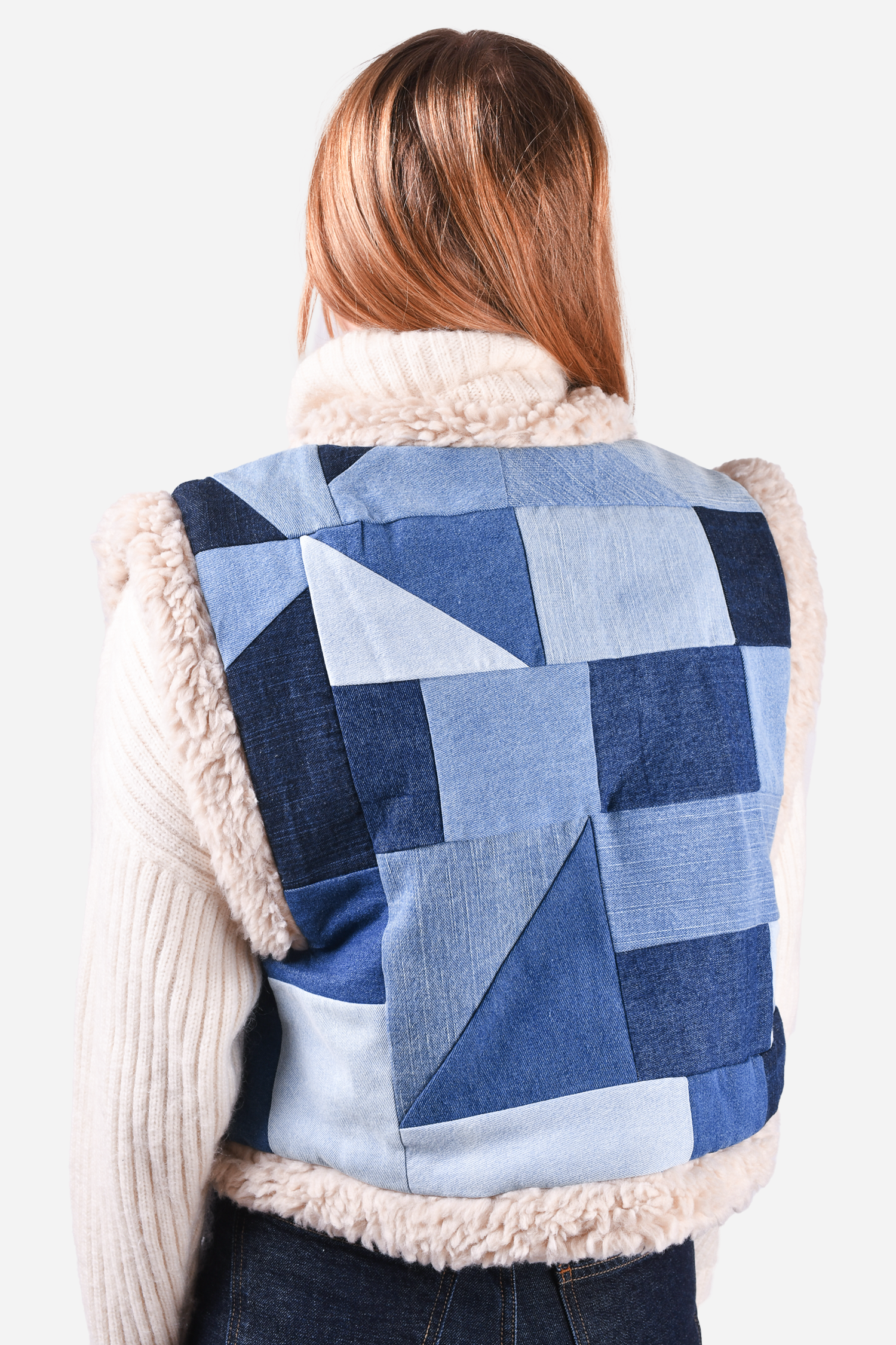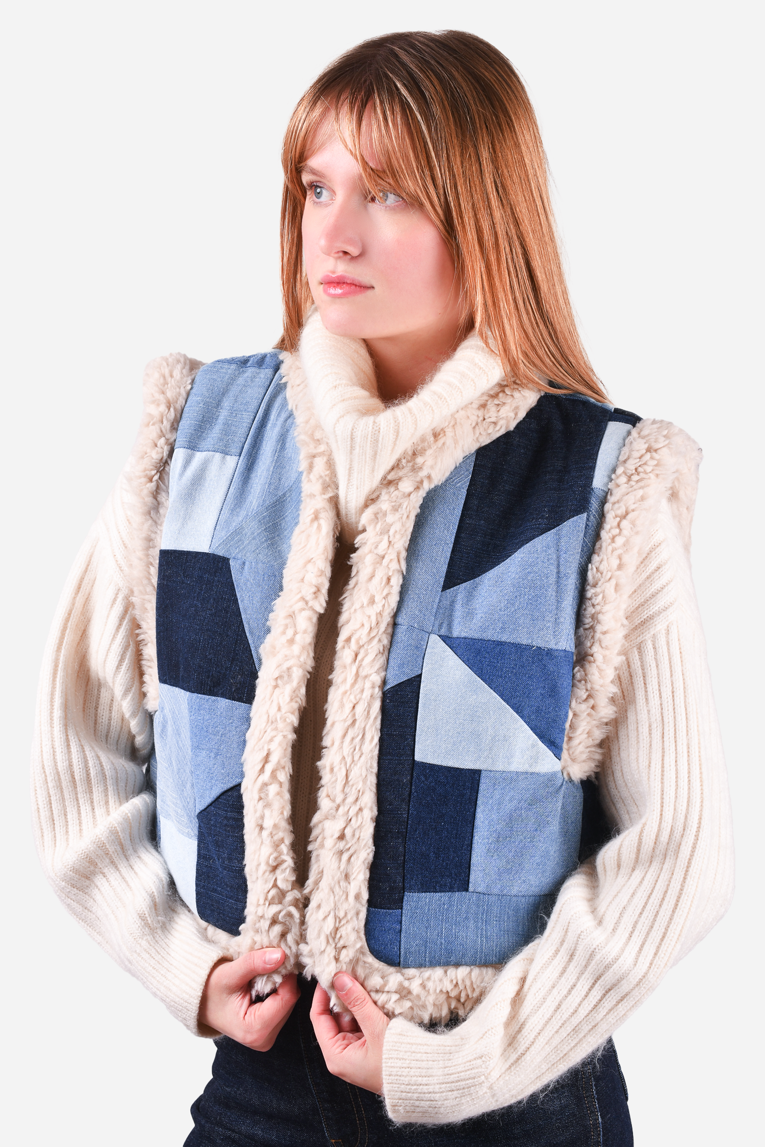 Refresh availabilitySea New York Blue Denim Patched 'Diego' Vest. Open closure. Sleeveless. Sherpa lined. Tonal stitching.