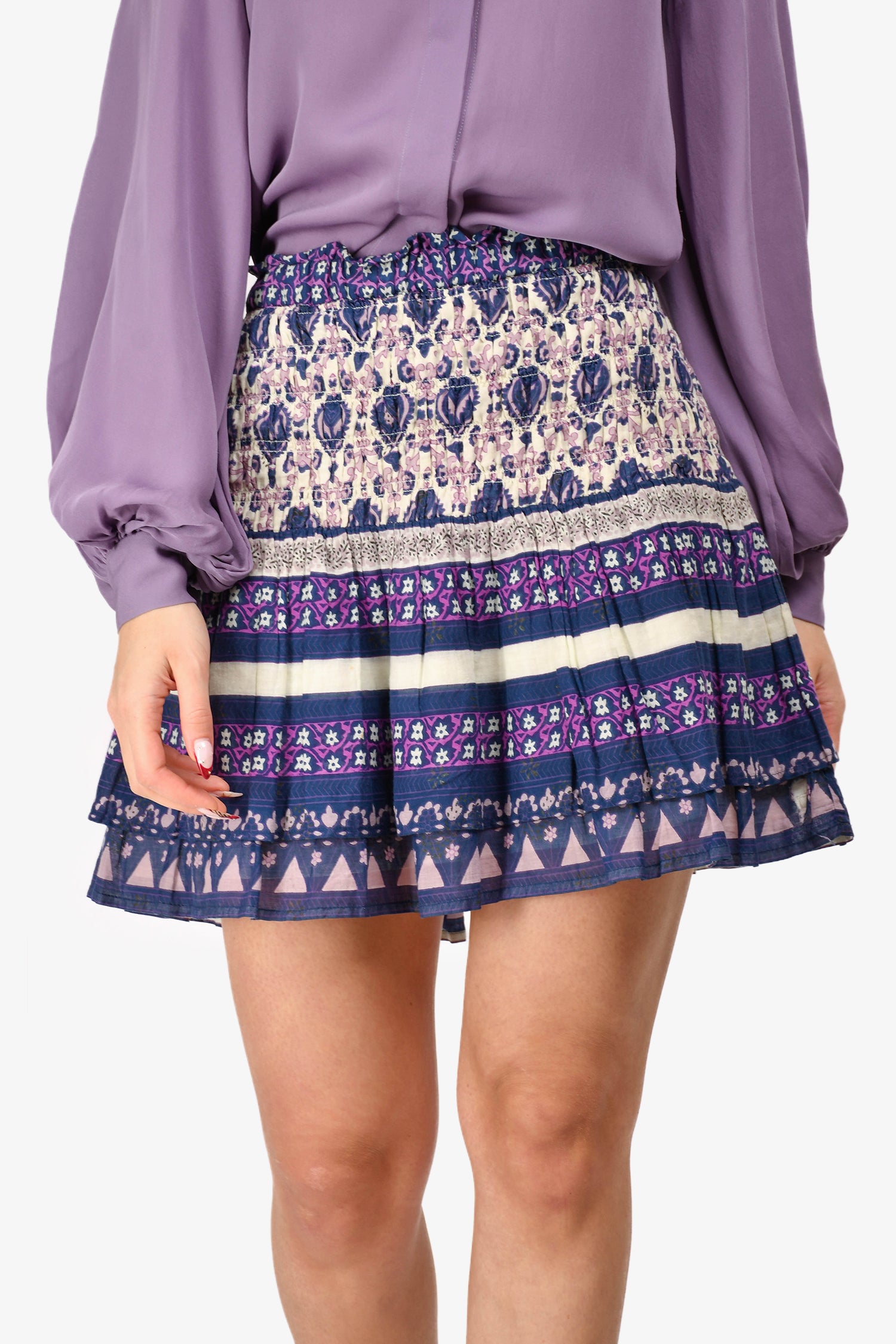 Refresh availabilitySea New York Purple Paisley Printed Mini Skirt. Concealed elasticized waistband. Tiered ruffled hem. Lined. Tonal stitching.