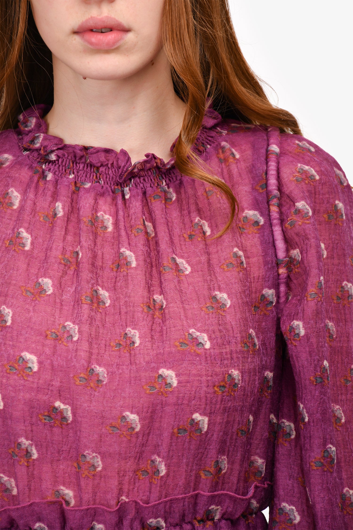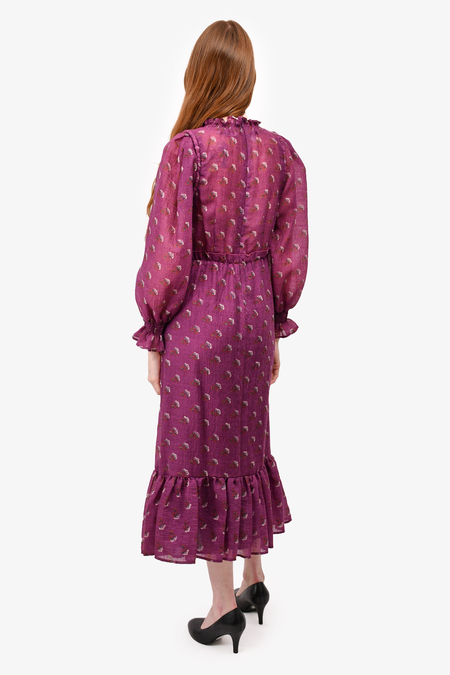 Refresh availabilitySea New York Purple Patterned Ruffle Neckline Maxi Dress. High neckline. Ruched at the sleeves. Ruffles at the wait and hemline. Hidden back zipper closure. Tonal stitching.