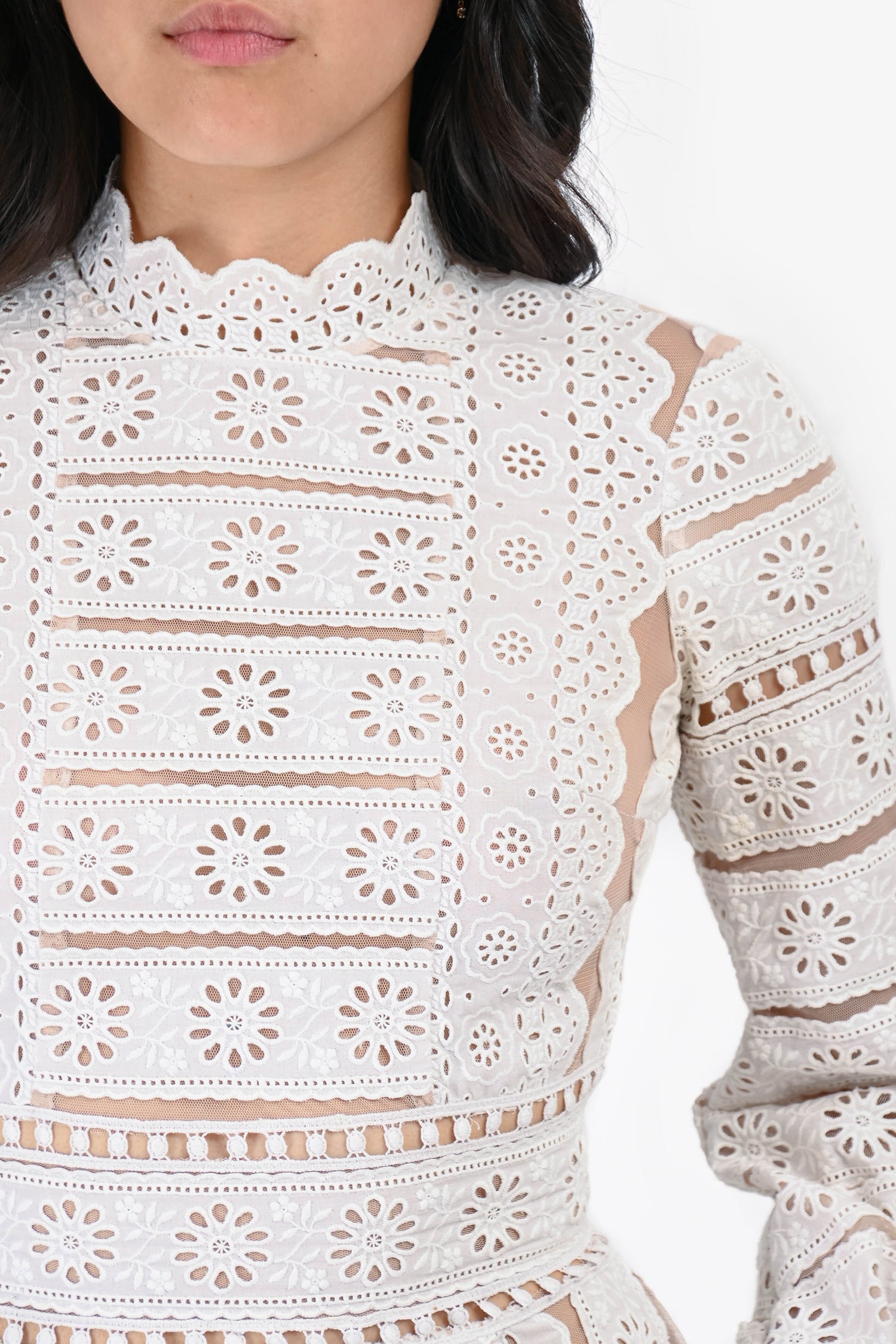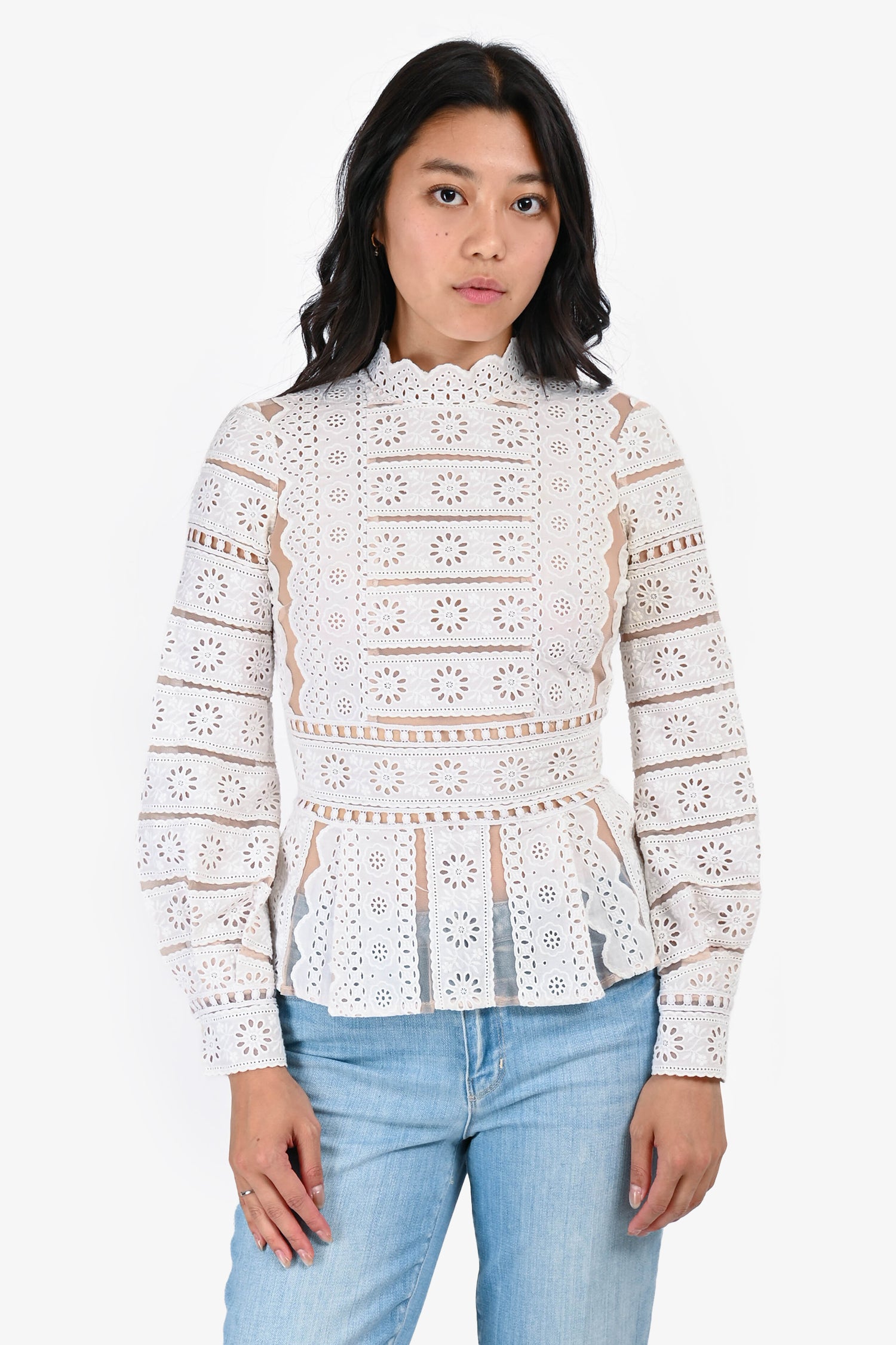 Refresh availabilitySea New York White Floral Sheer Blouse. Lined mesh interior. Eyelet. Rear loop and button closures, and ties. Tonal stitching.