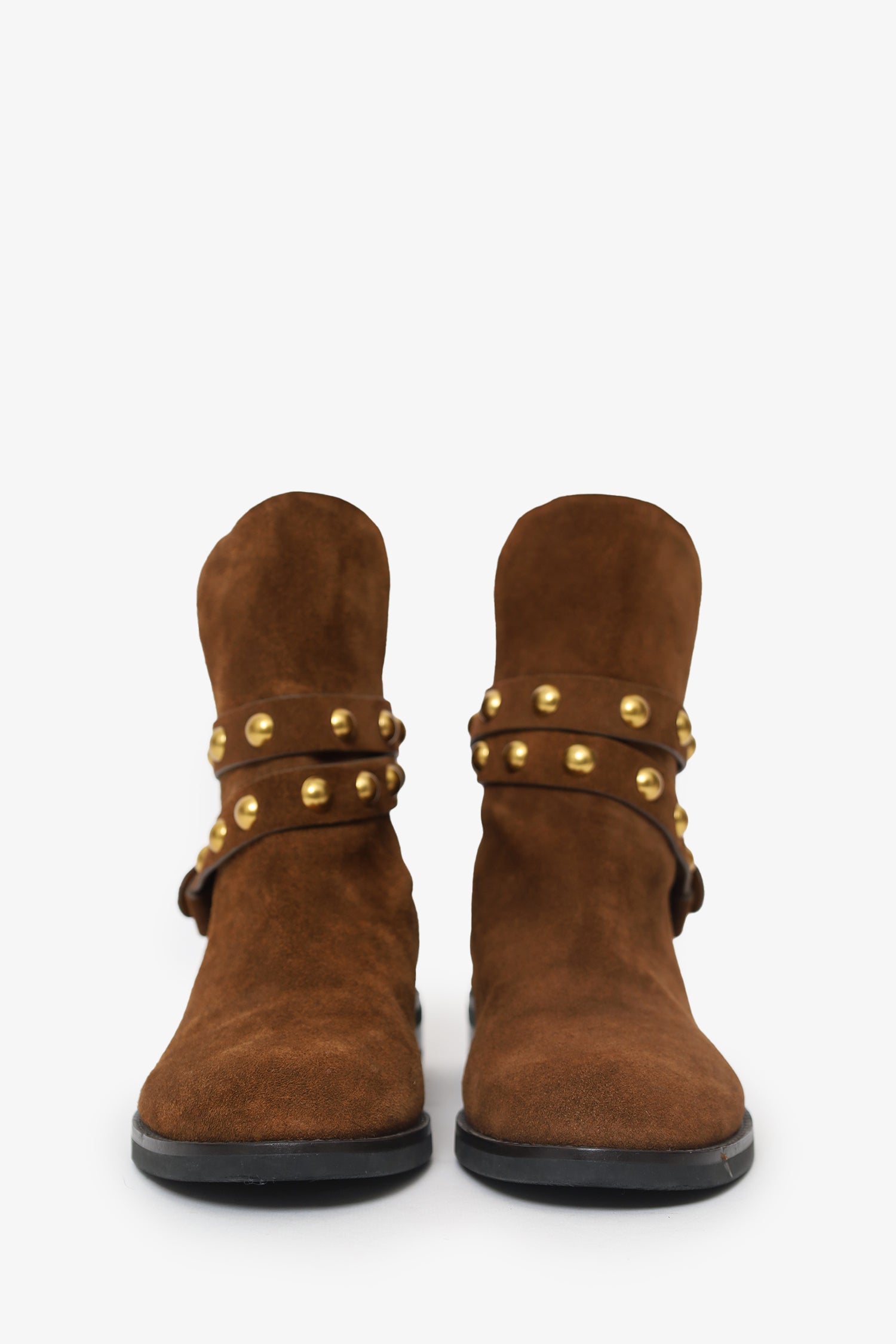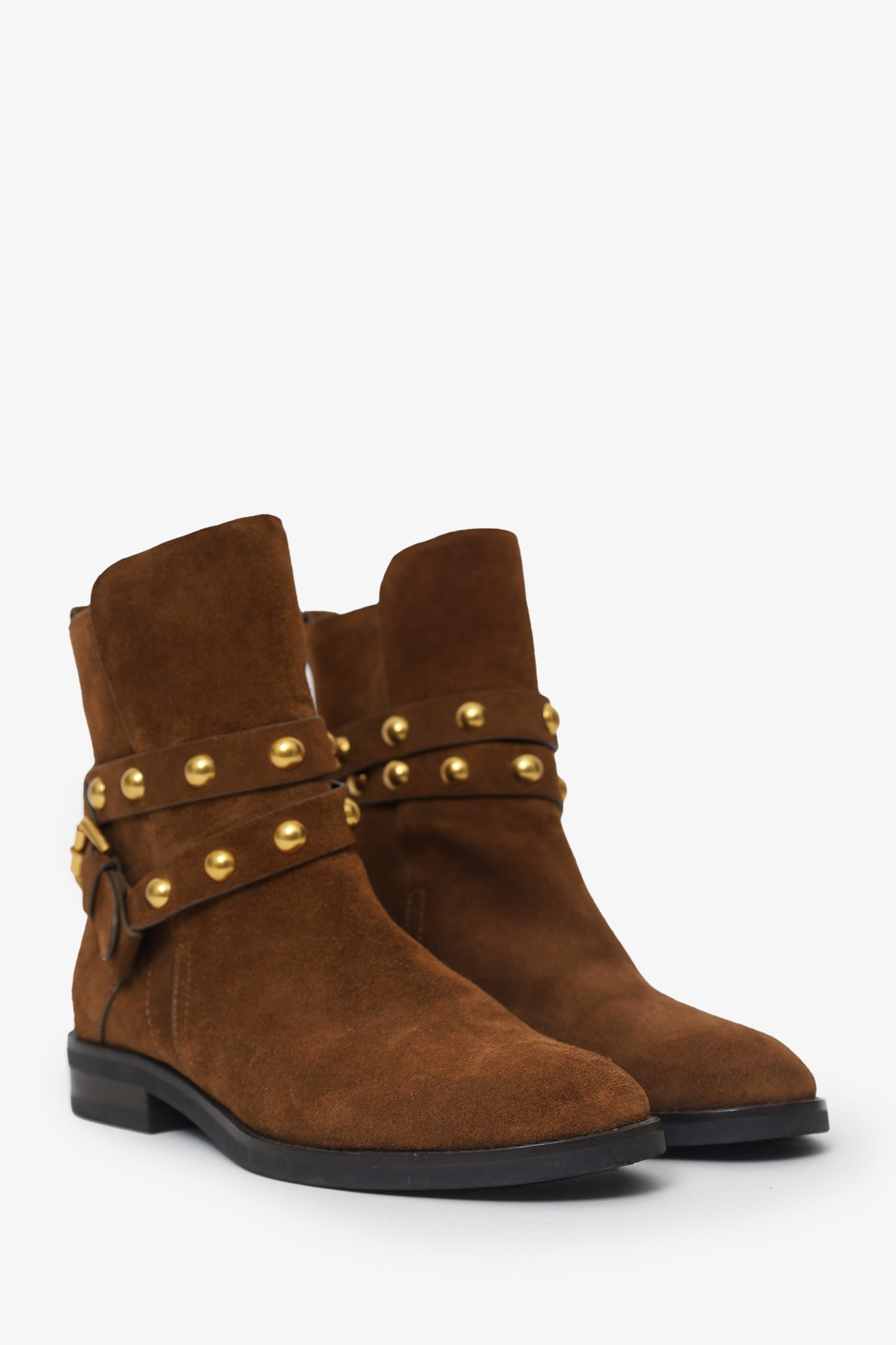 Refresh availabilitySee by Chloé Brown Suede Studded Ankle Boots. Pull-on. Round toe. Ankle strap with adjustable pull-through buckle closure. Block heel. Gold-tone hardware. Tonal stitching.