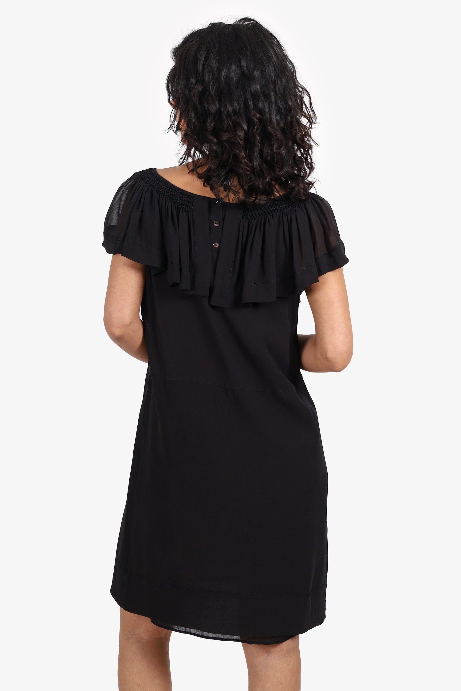 Refresh availabilitySee by Chloe Black Crepe Silk Draped Mini Dress. Pull-on. Round-neckline. Rear button-up closure. Attached interior lining. Tonal stitching.