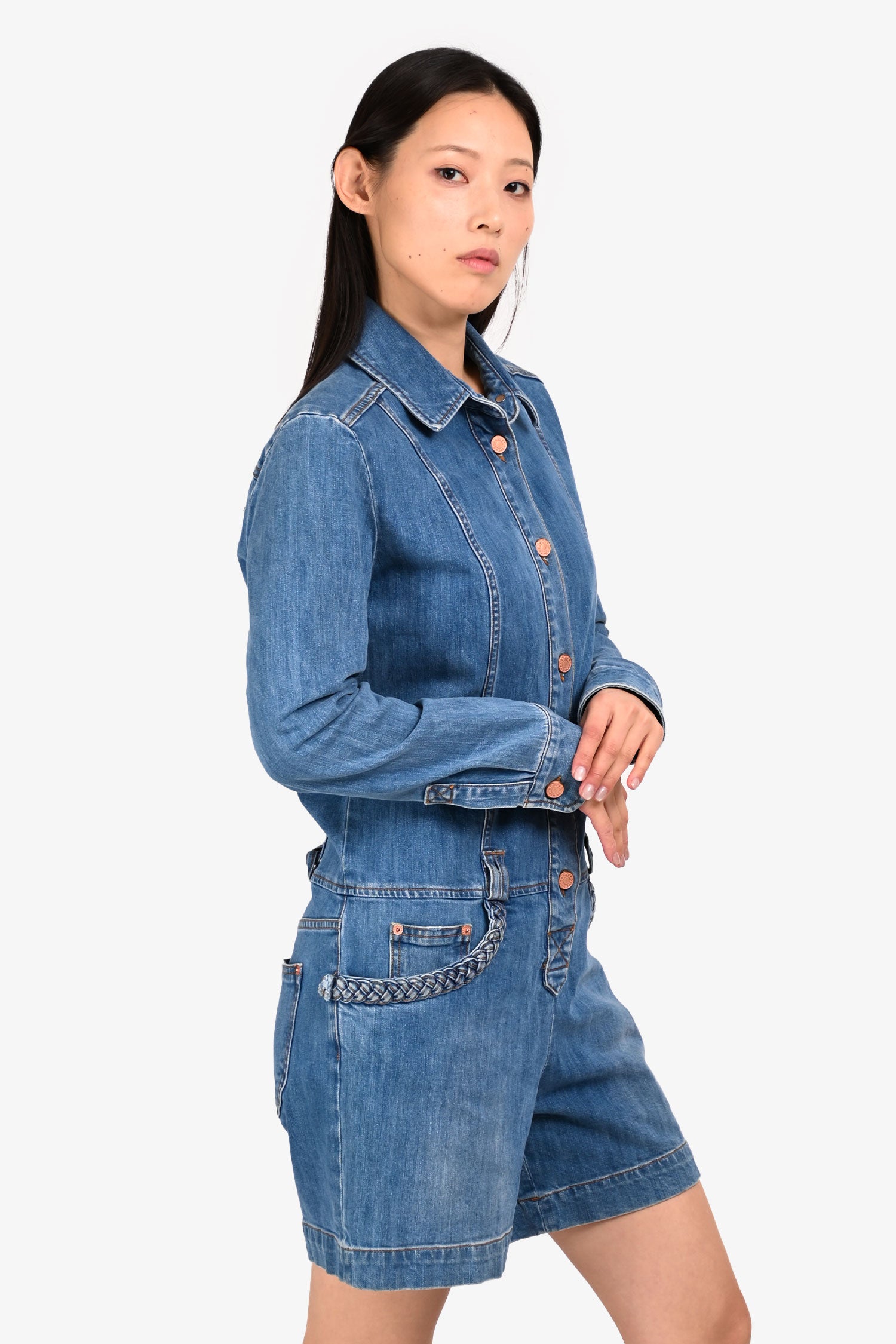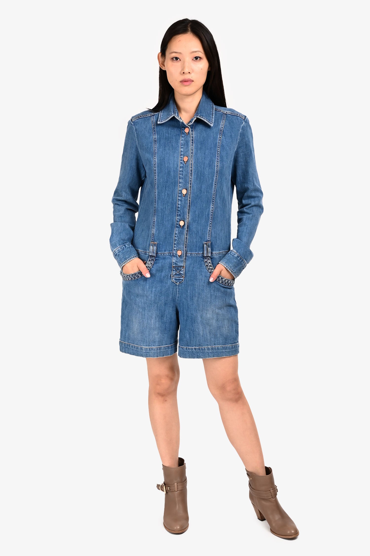 Refresh availabilitySee by Chloe Blue Denim Medium Wash Romper. Front button-up closure. Front pockets. Button closure on the cuffs. Waist belt loops.