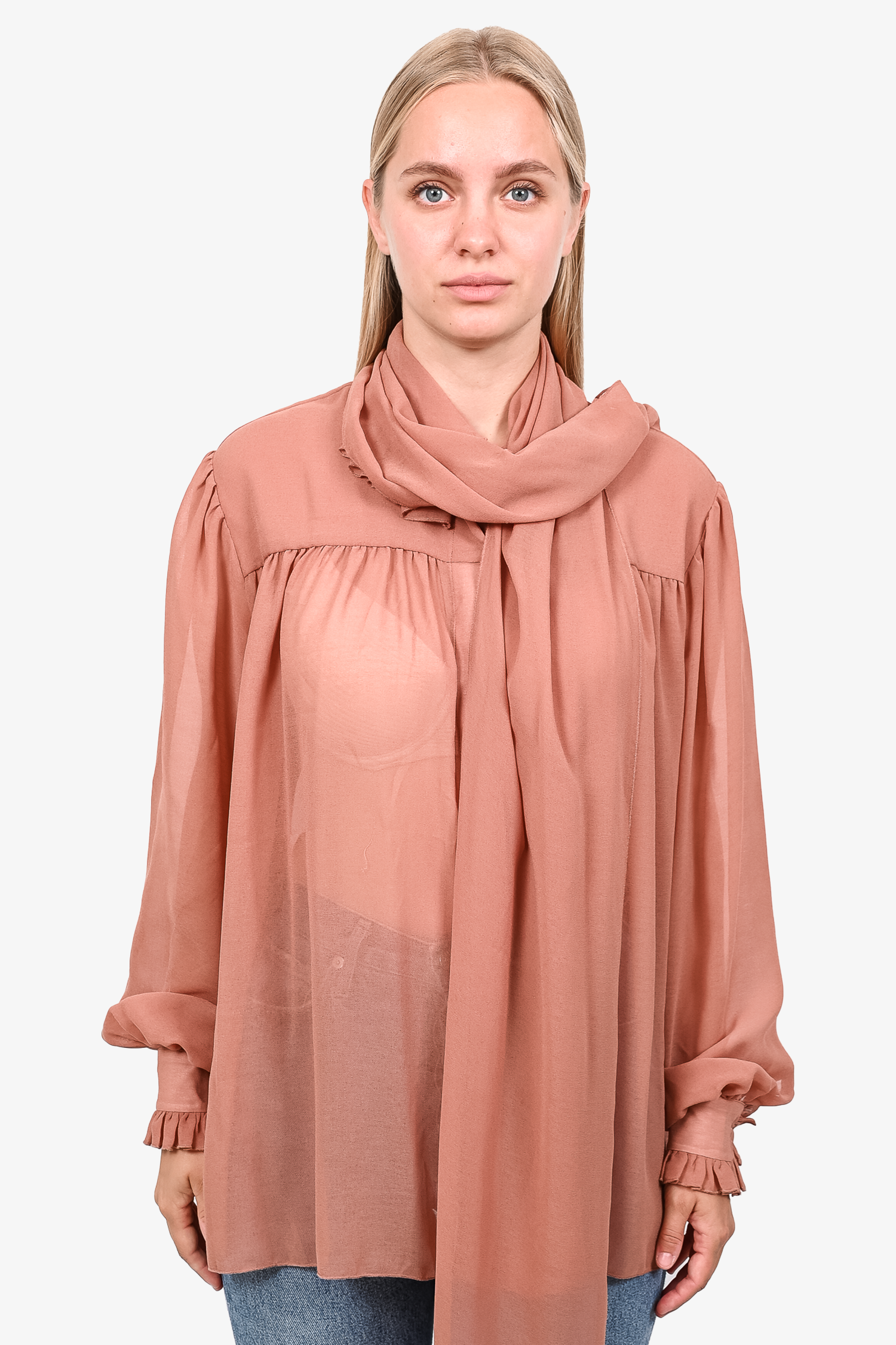Refresh availabilitySee by Chloe Dusty Pink Neck Tie Button Down Blouse. Button closure on the cuffs. Tonal stitching.