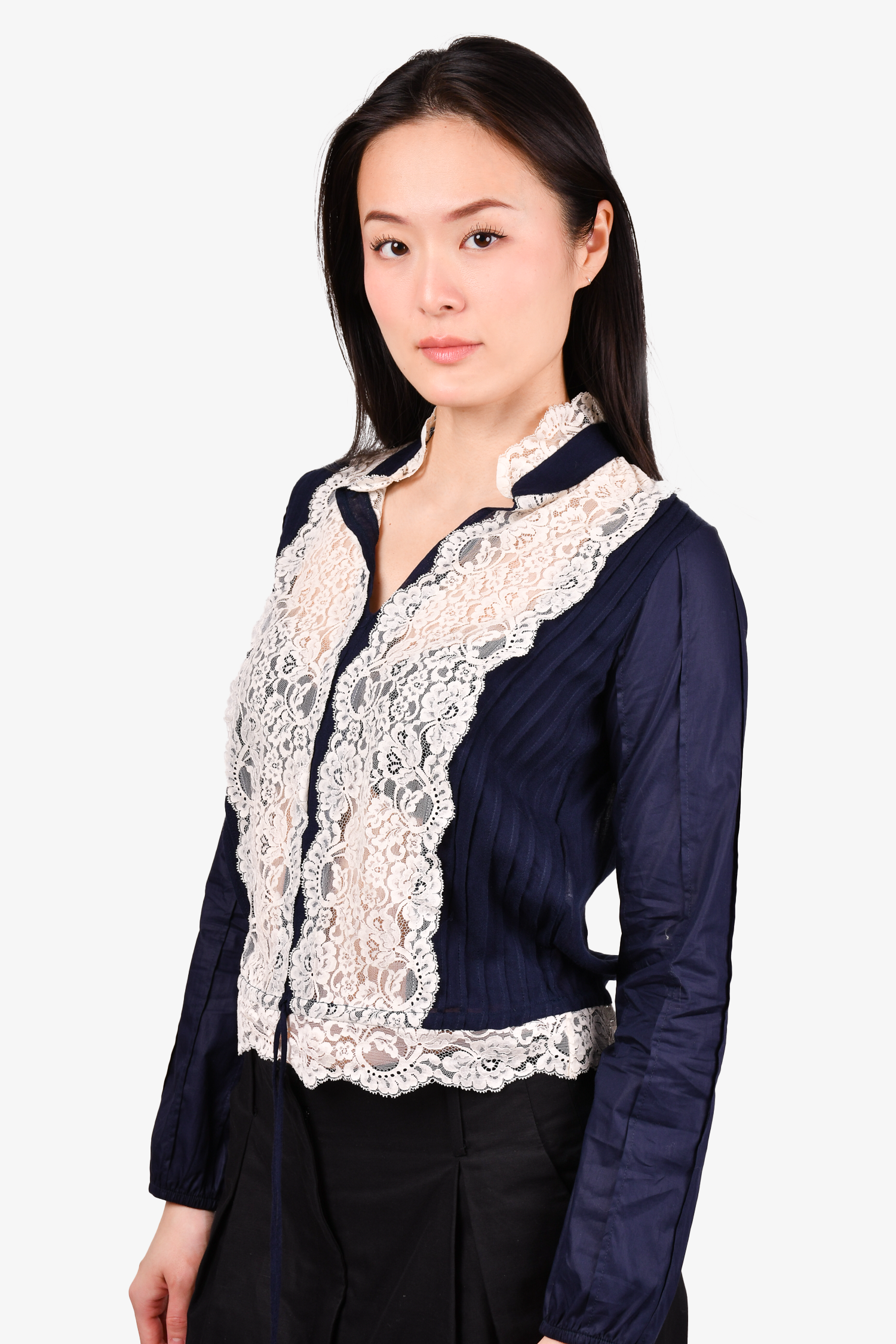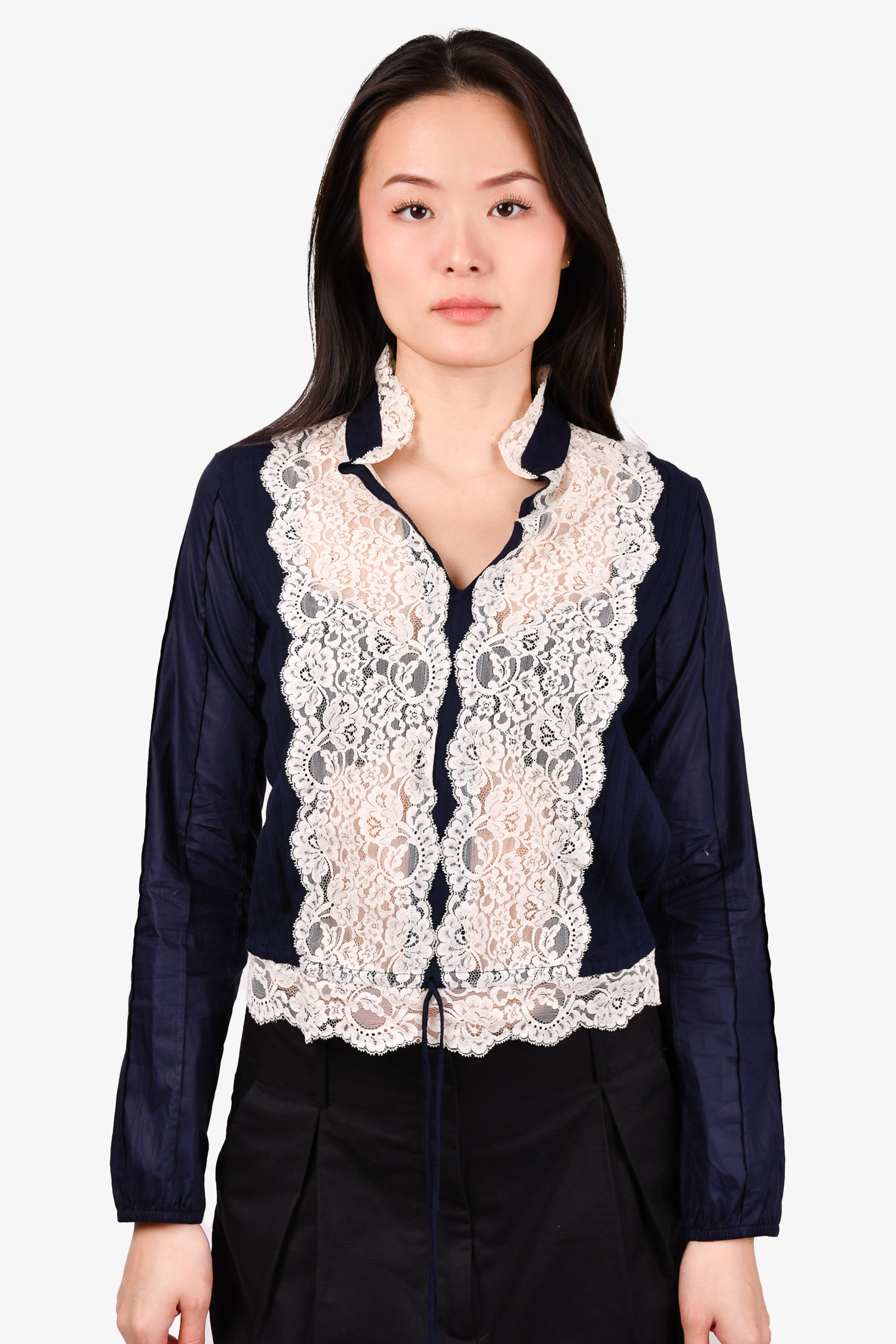 Refresh availabilitySee By Chloe Navy Lace Detail Blouses. V-neckline. Drawstring waist. Tonal stitching.