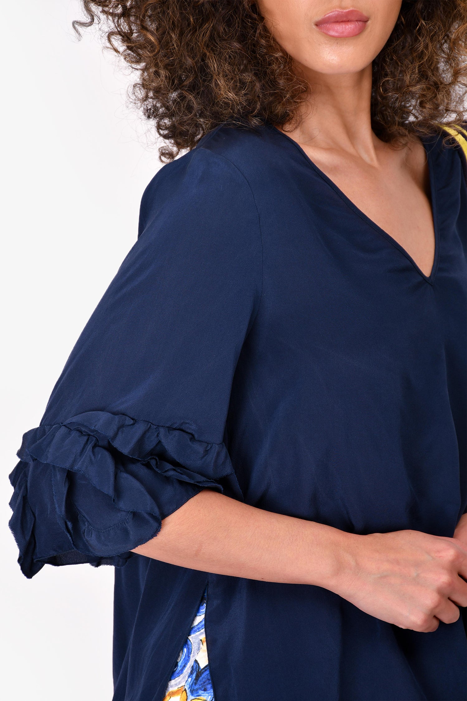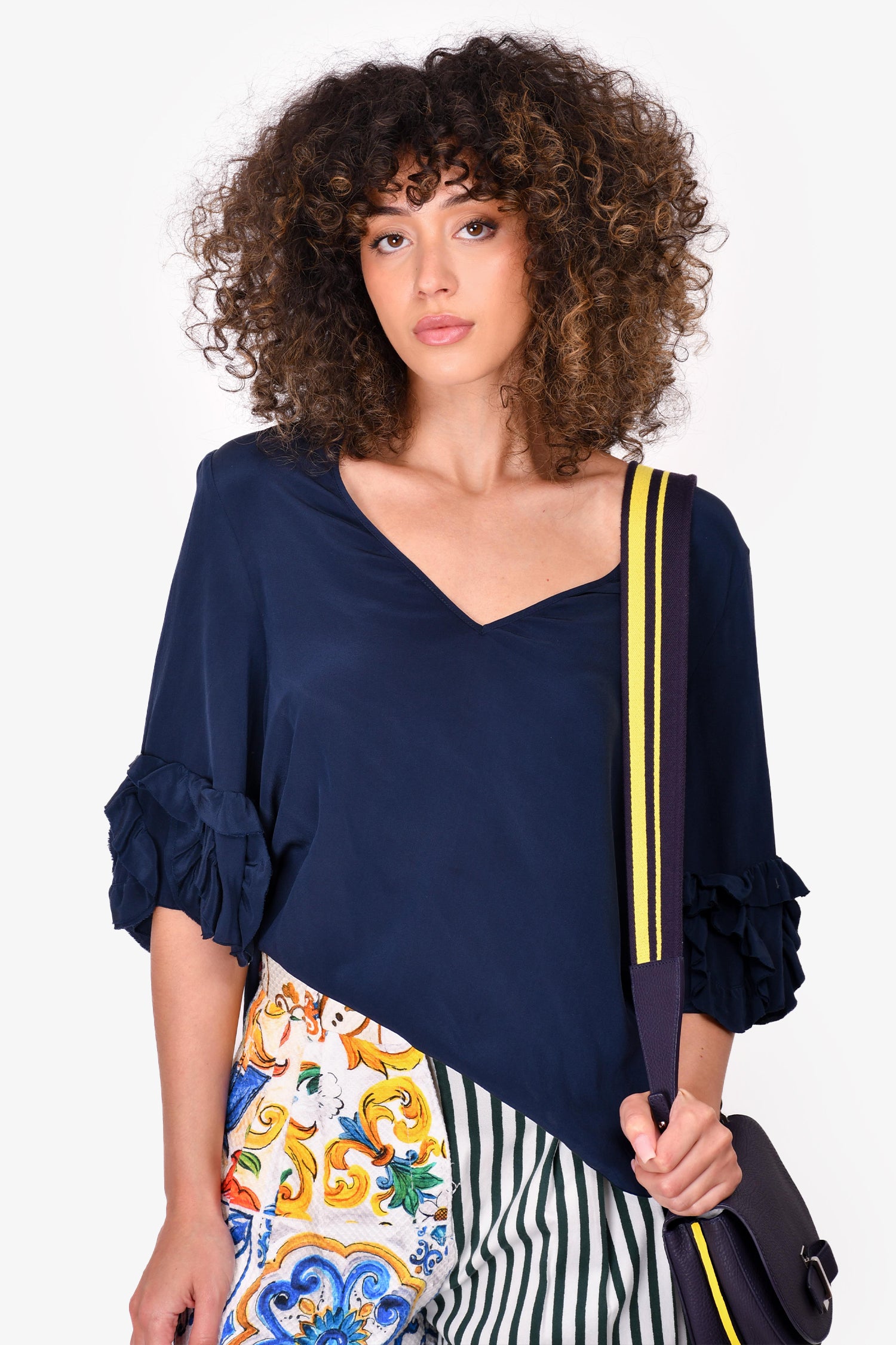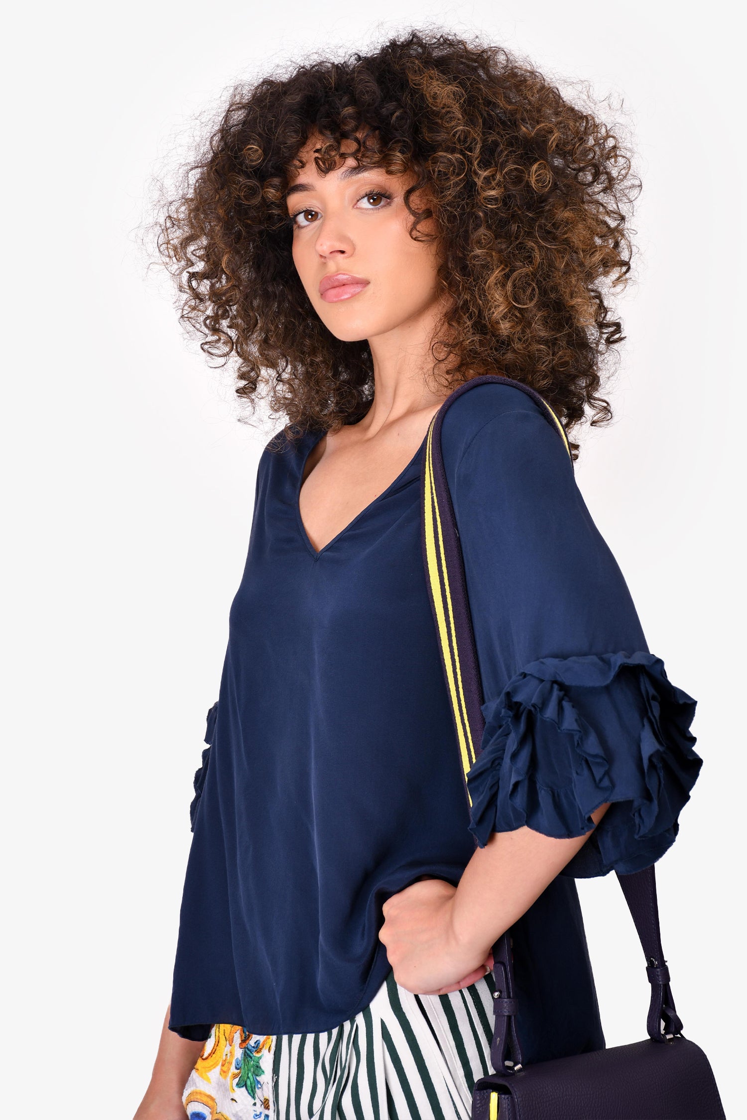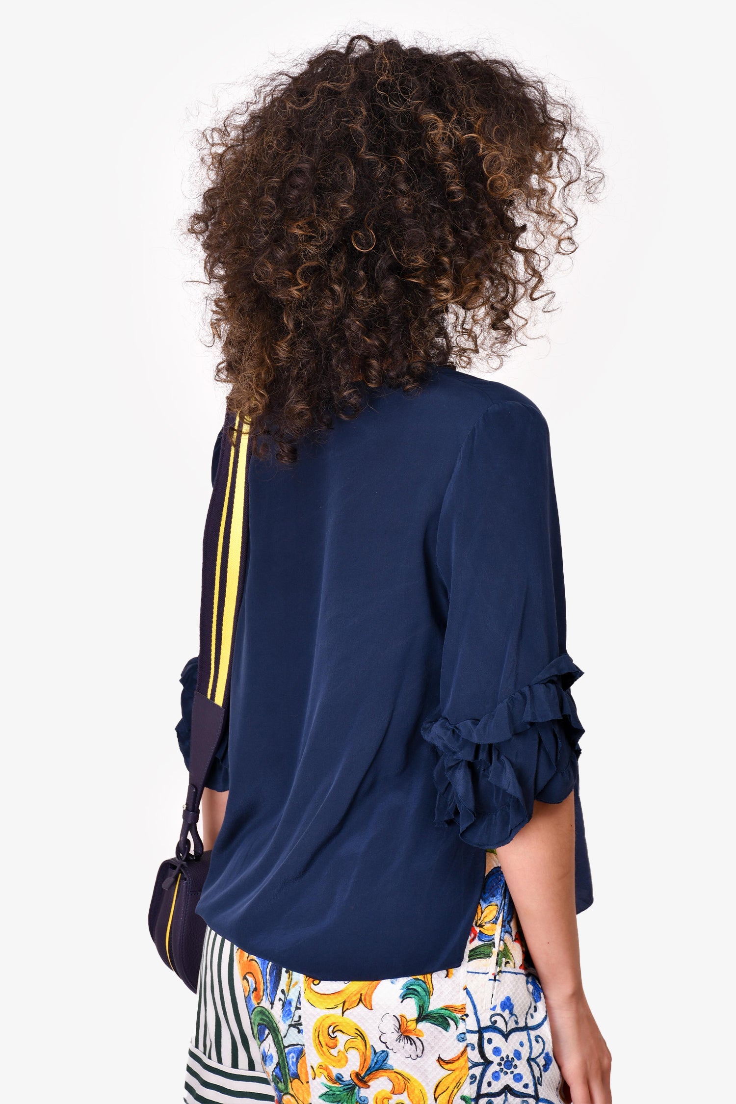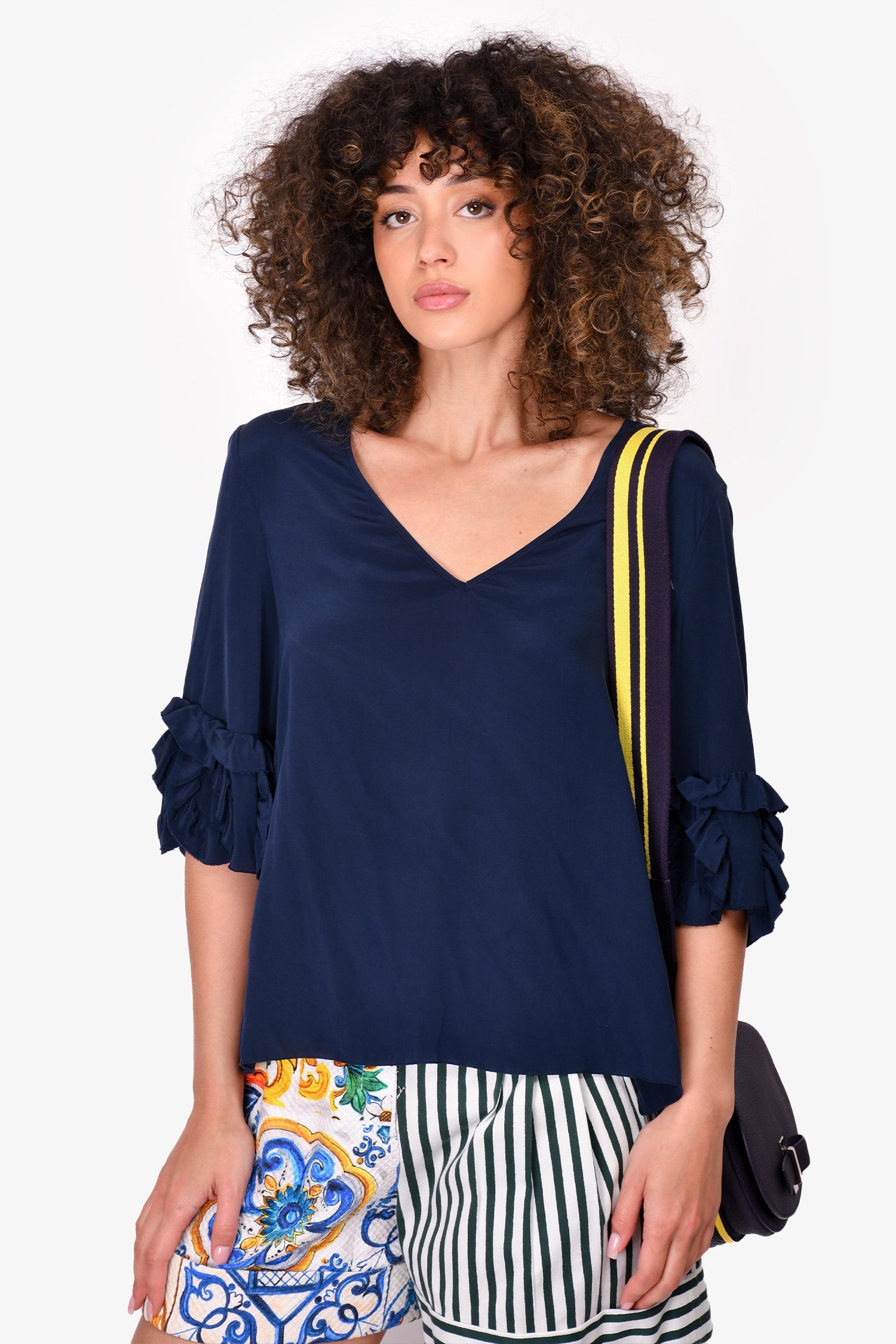 Refresh availabilitySee By Chloe Navy Silk Ruffle Sleeve Blouse. V-neck. Pull-on.