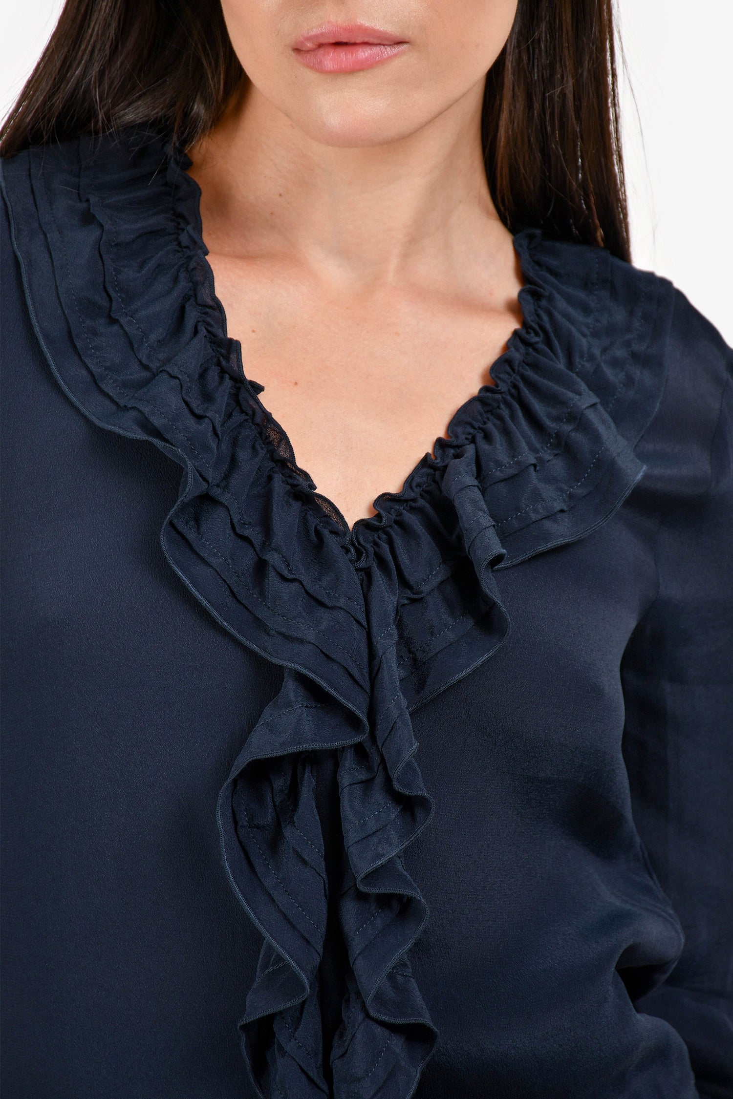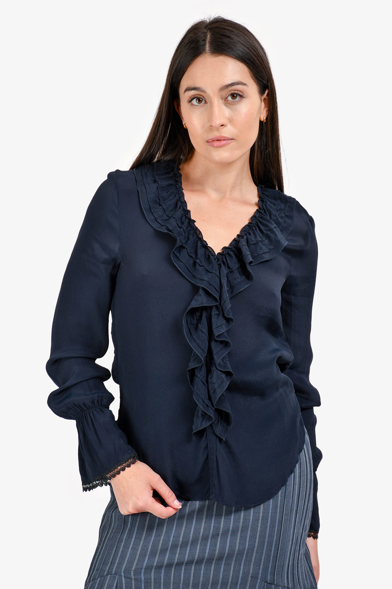 Refresh availabilitySee by Chloe Navy Silk Ruffled Blouse. V-neckline with ruffle detail. Long sleeves with elasticized cuffs. Tonal stitching.