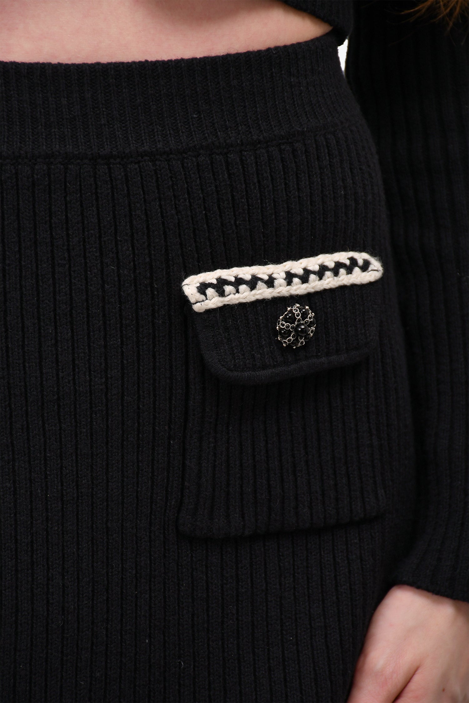 Refresh availabilitySelf-Portrait Black Cotton/Wool Contrast Stitched Bow Skirt. Silver-tone hardware. 2 pockets with snap closures.