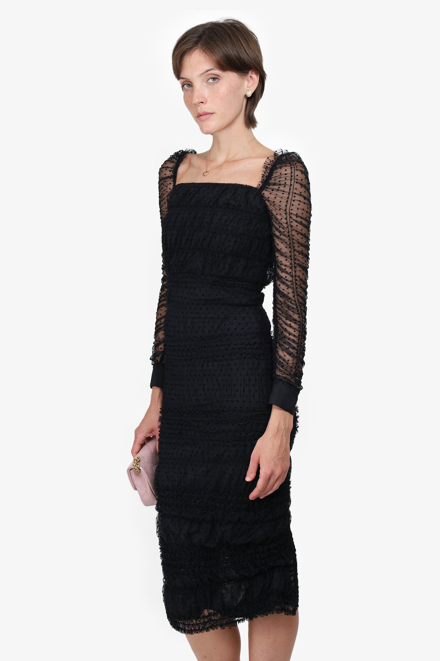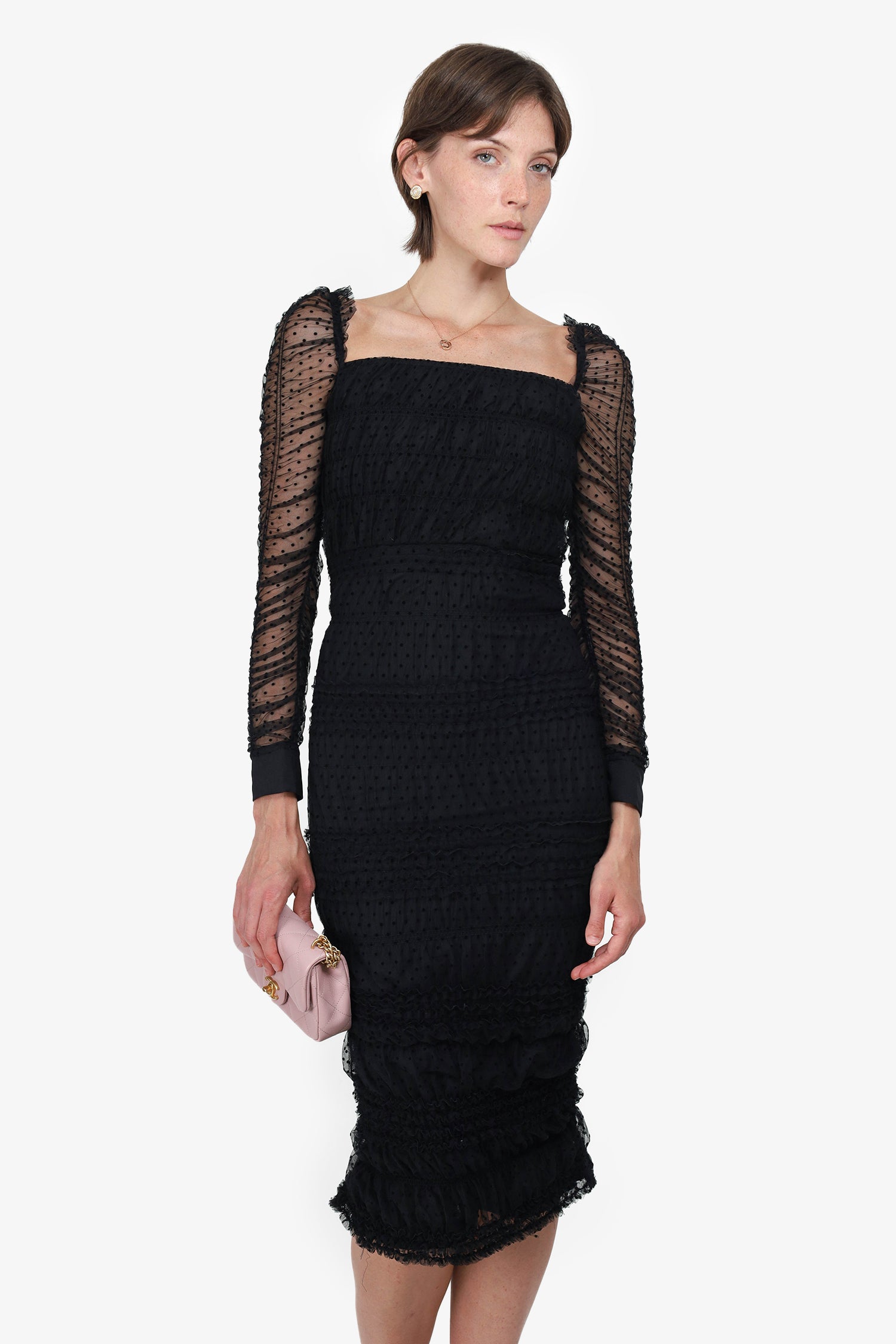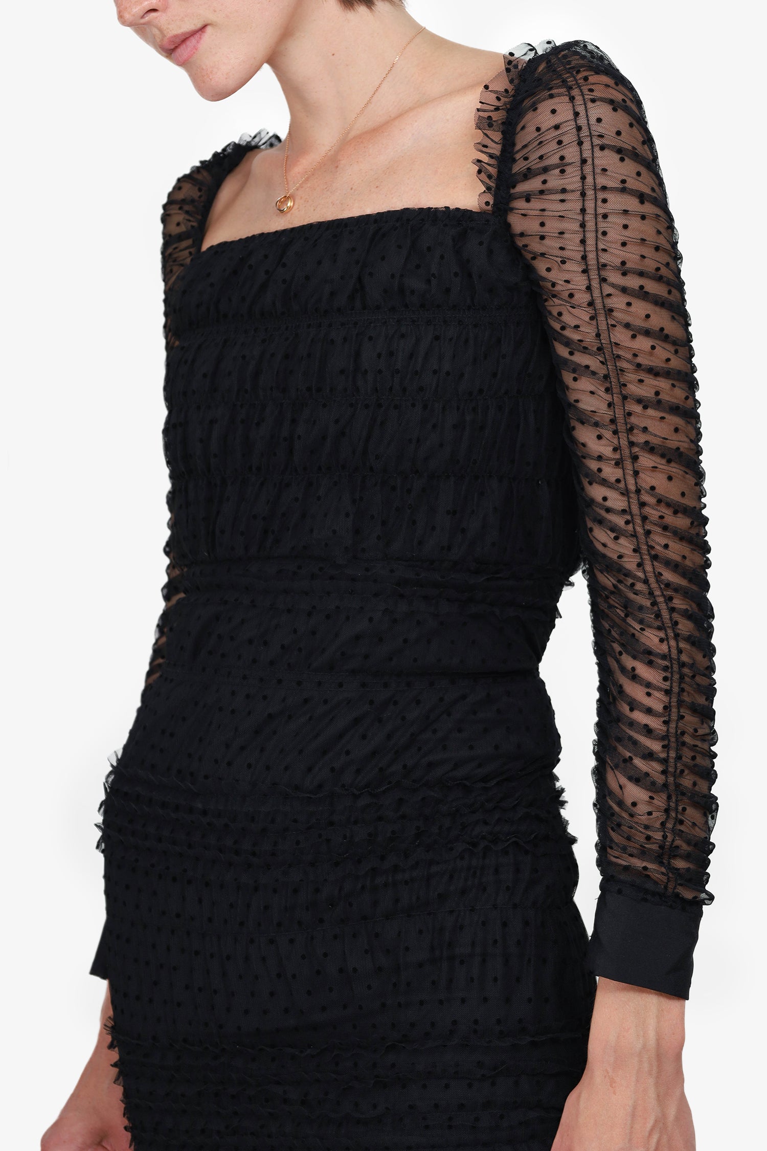 Refresh availabilitySelf-Portrait Black Lace Sleeve Polka Dot Dress. Low round neckline. Rear zip closure. Slit up back hem. Ruched sleeves and body. Lined. Tonal stitching.