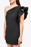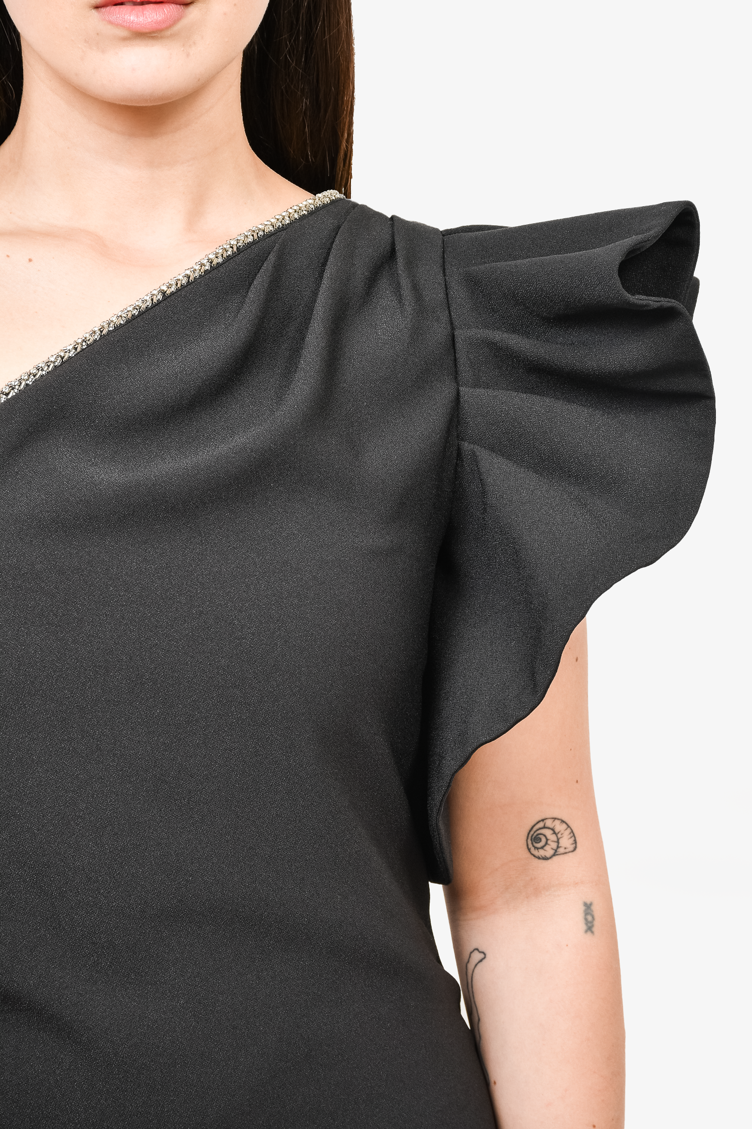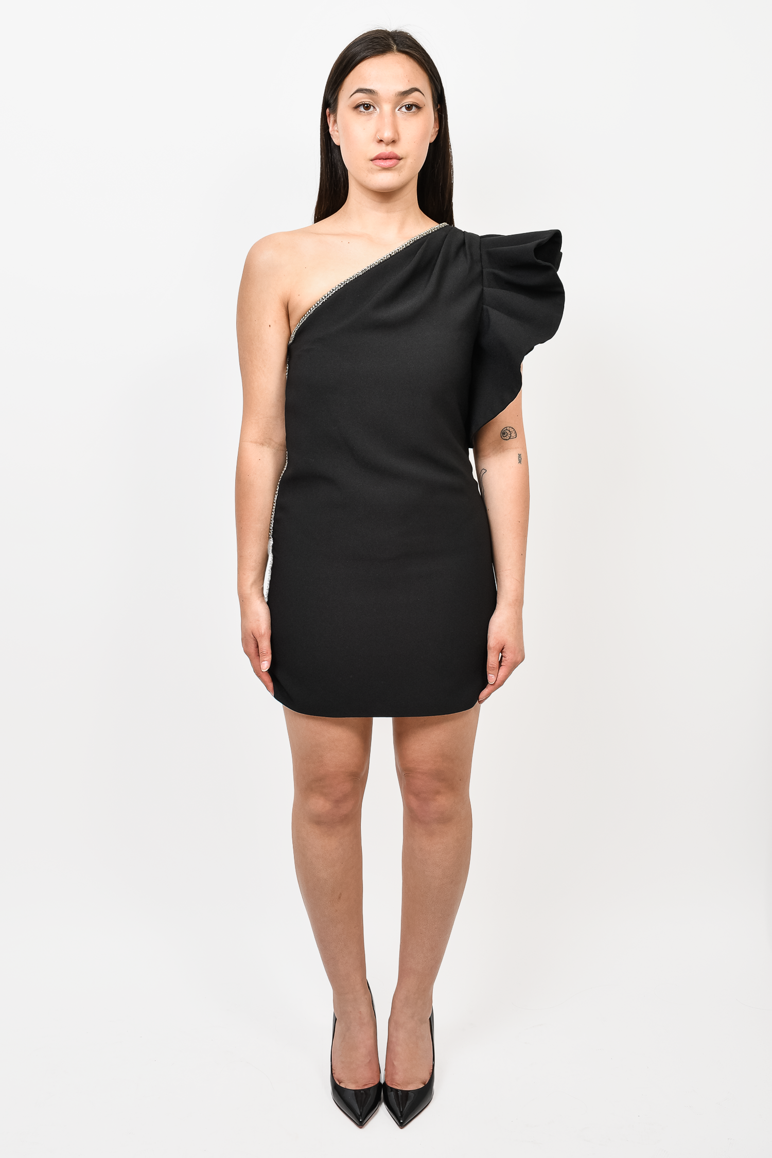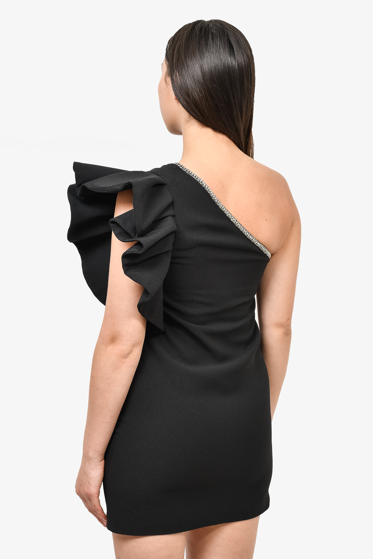 Refresh availabilitySelf Portrait Black One Ruffle Shoulder Mini Dress with Crystal Detail. Hidden side zip and top hook closure. Lined. Tonal stitching.