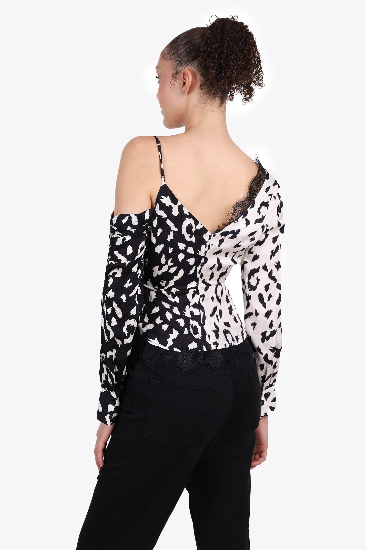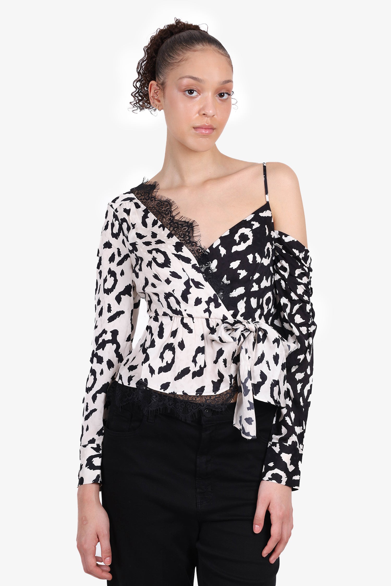 Refresh availabilitySelf Portrait Black/White Leopard Print Lace Wrap Top. V-neckline asymmetrical cut-off shoulder. Black lace trim on hem and neckline. Cinched at waist. Self-tie strap at side. Slight ruching at off shoulder. Concealed rear zip closure. Pull-on. Tonal stitching.