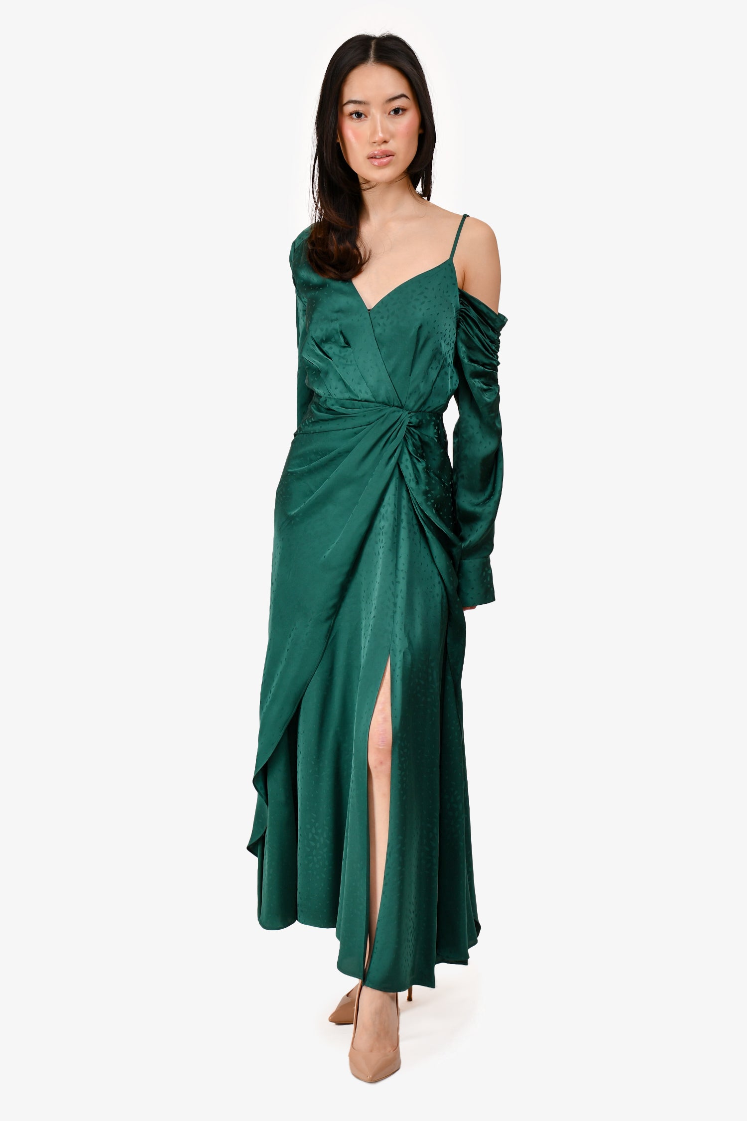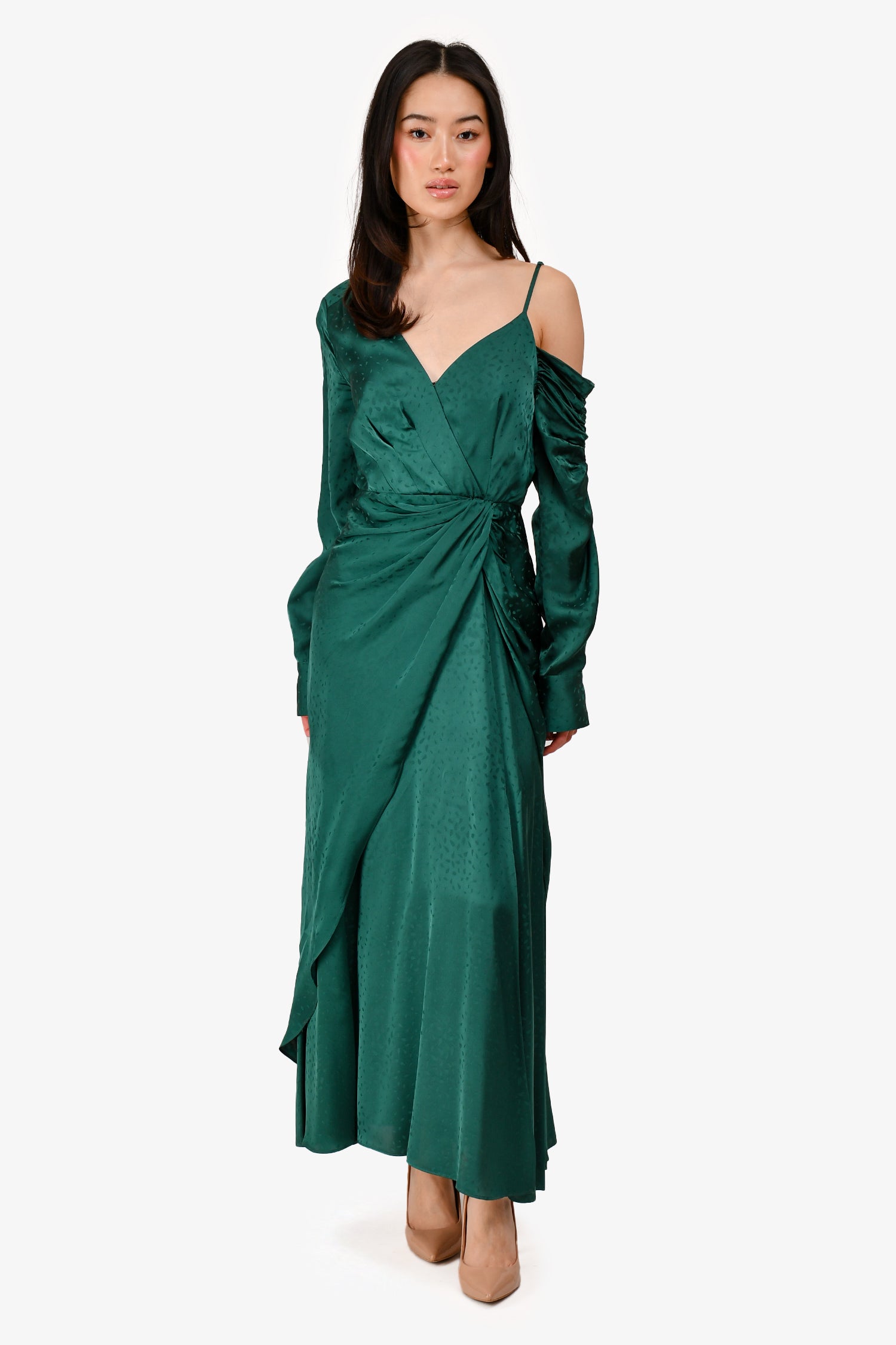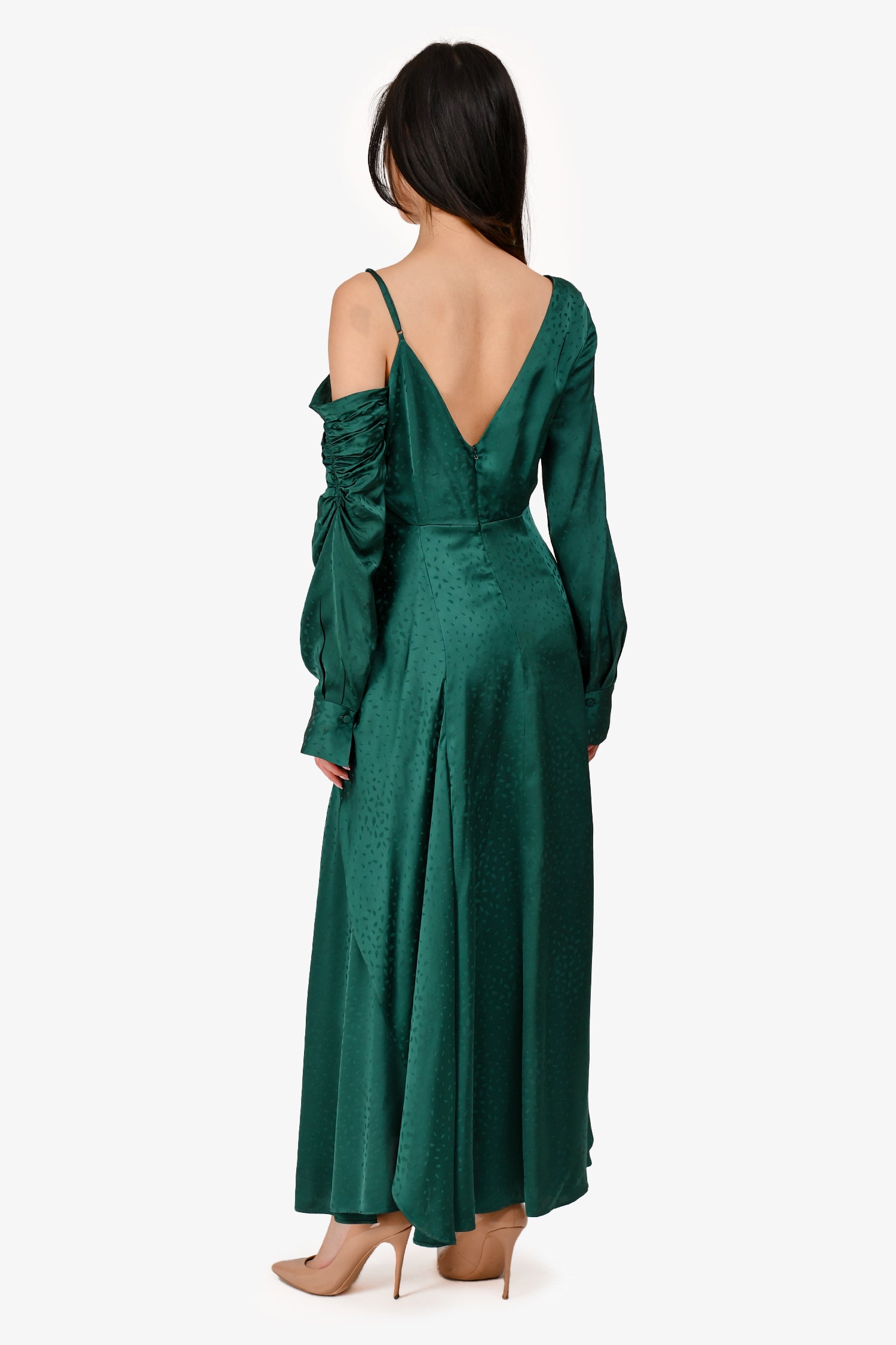 Refresh availabilitySelf-Portrait Green Satin V-neck Midi Dress. V-neckline. Ruched at the sleeve and waist. Front slit. Cuffed at the sleeve. Back zipper closure. Tonal stitching.