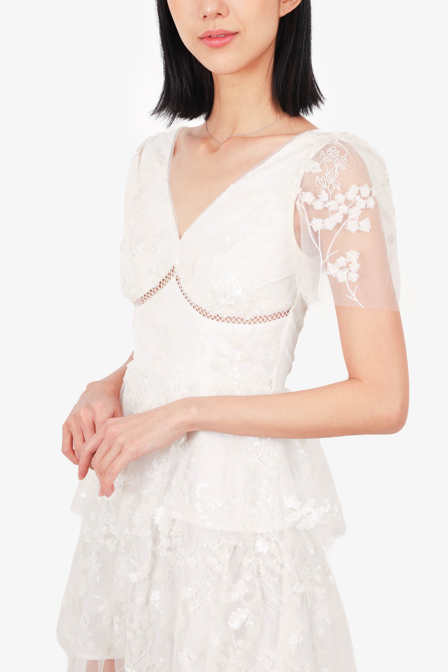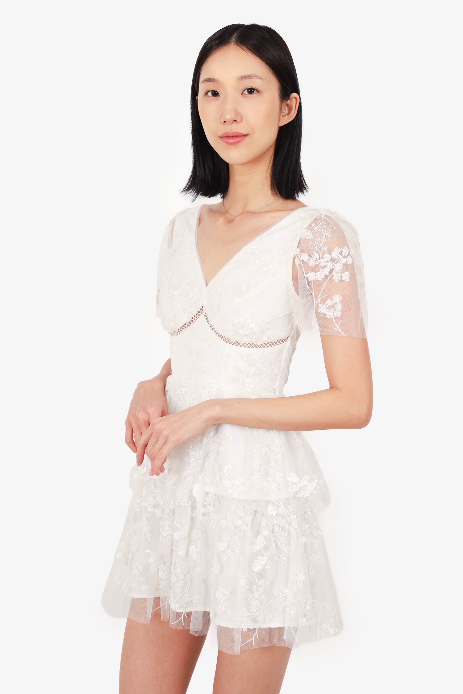 Refresh availabilitySelf-Portrait Ivory Blossom Sequin Two Tier Mini Dress. V-neckline. Rear zip closure with hook. Lined. Tonal stitching.