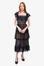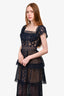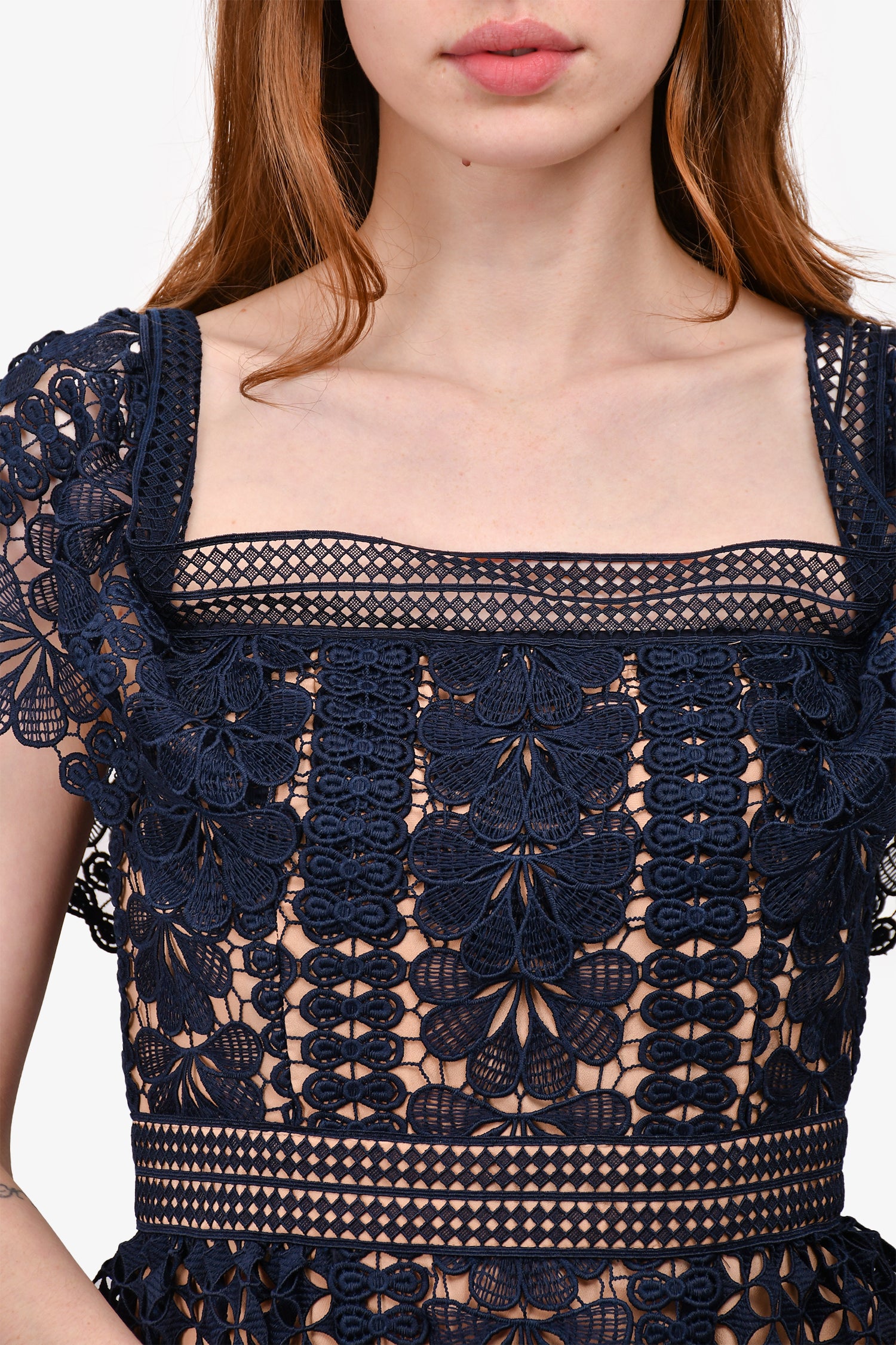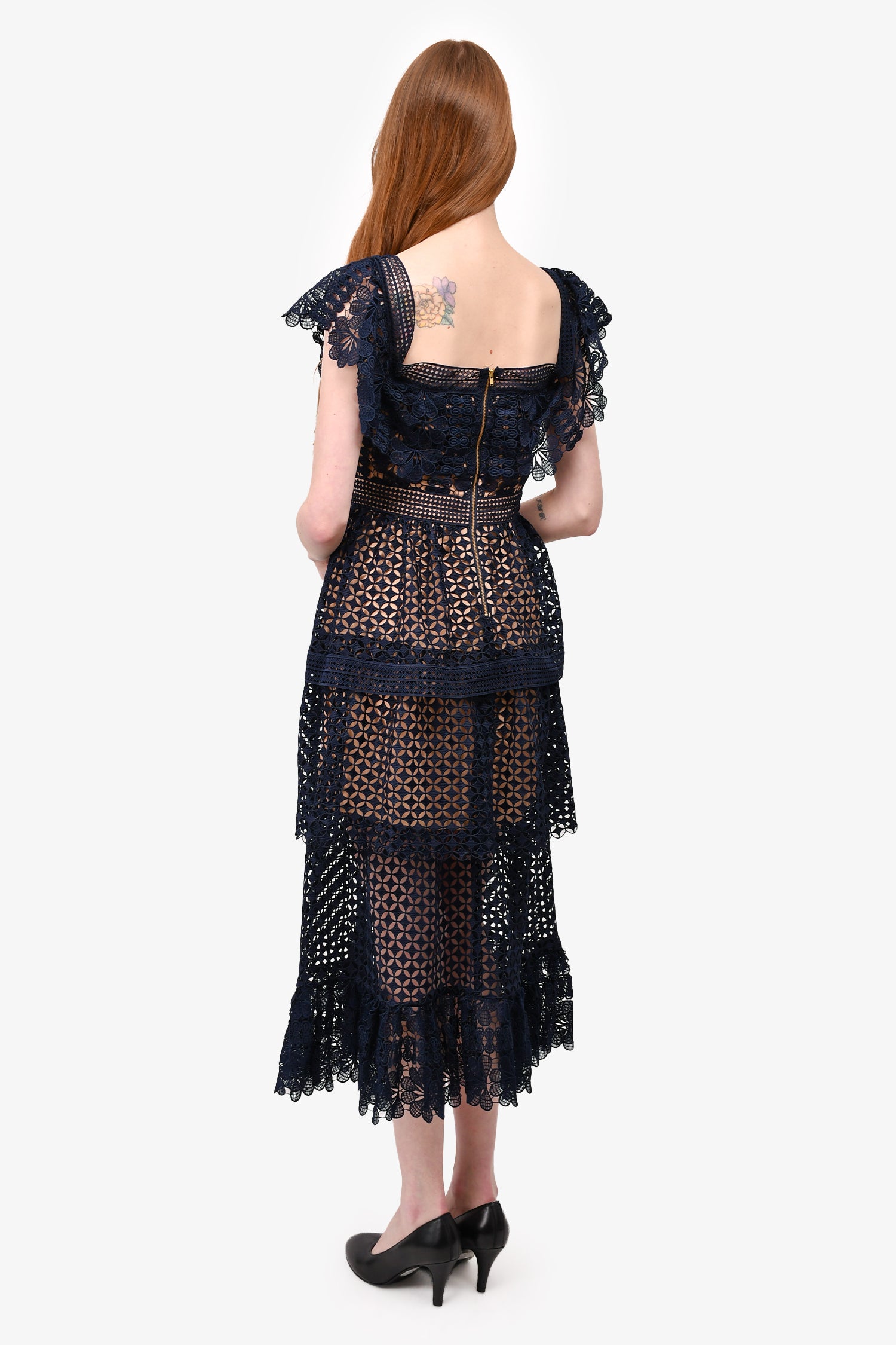 Self-Portrait Navy Blue Eyelet Lace Tiered Off the Shoulder Midi Dress Size 6 US