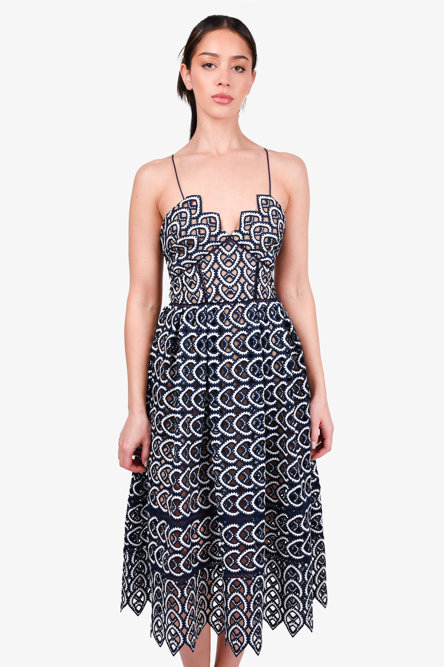 Refresh availabilitySelf-Portrait Navy Blue Eyelet Lace Sleeveless Midi Dress. Lined. Back zip closure. Tonal and contrast stitching.