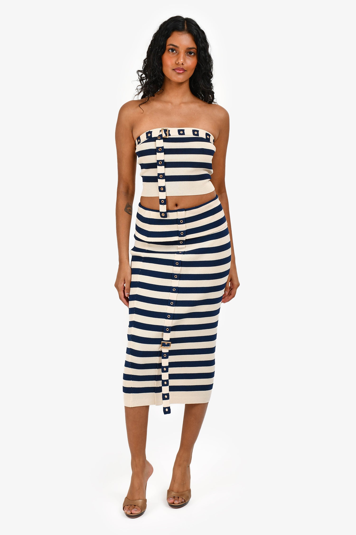 Refresh availabilitySer.o.ya Cream/Navy Striped Tube Top + Midi Skirt Set. Top; strapless tube top with horizontal stripe pattern. Fitted silhouette. Stretch knit fabric. Skirt; High-rise midi skirt with matching stripe design. Slim fit with elastic waistband. Pull-on style. Tonal stitching.